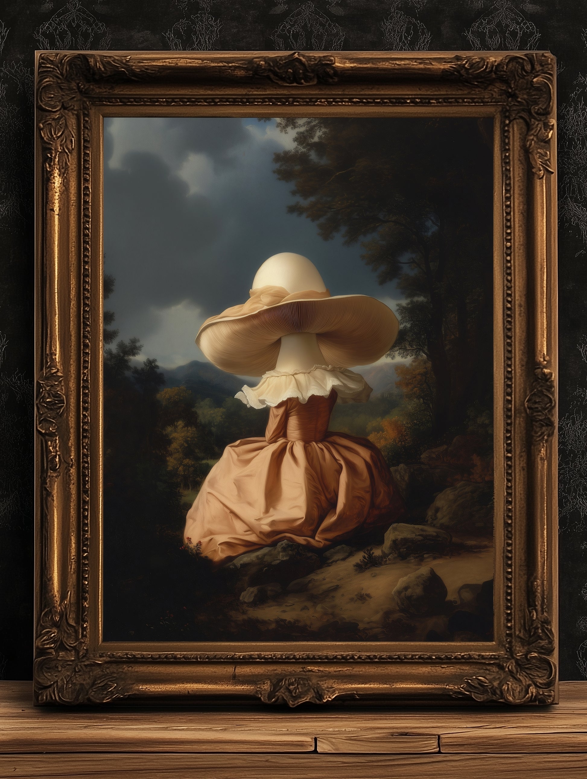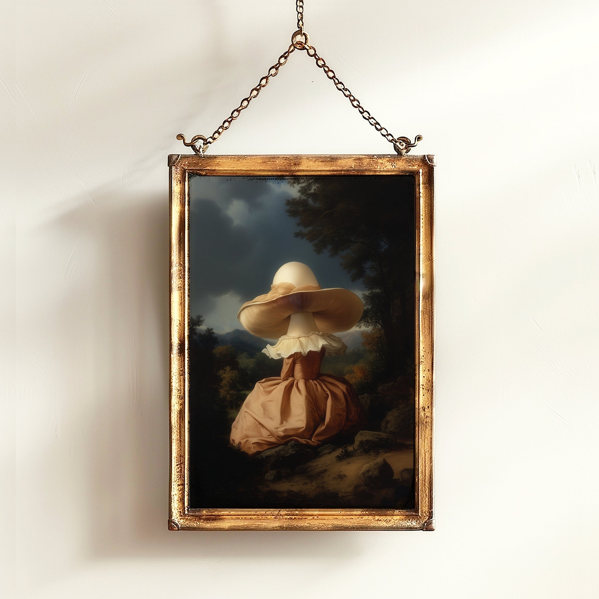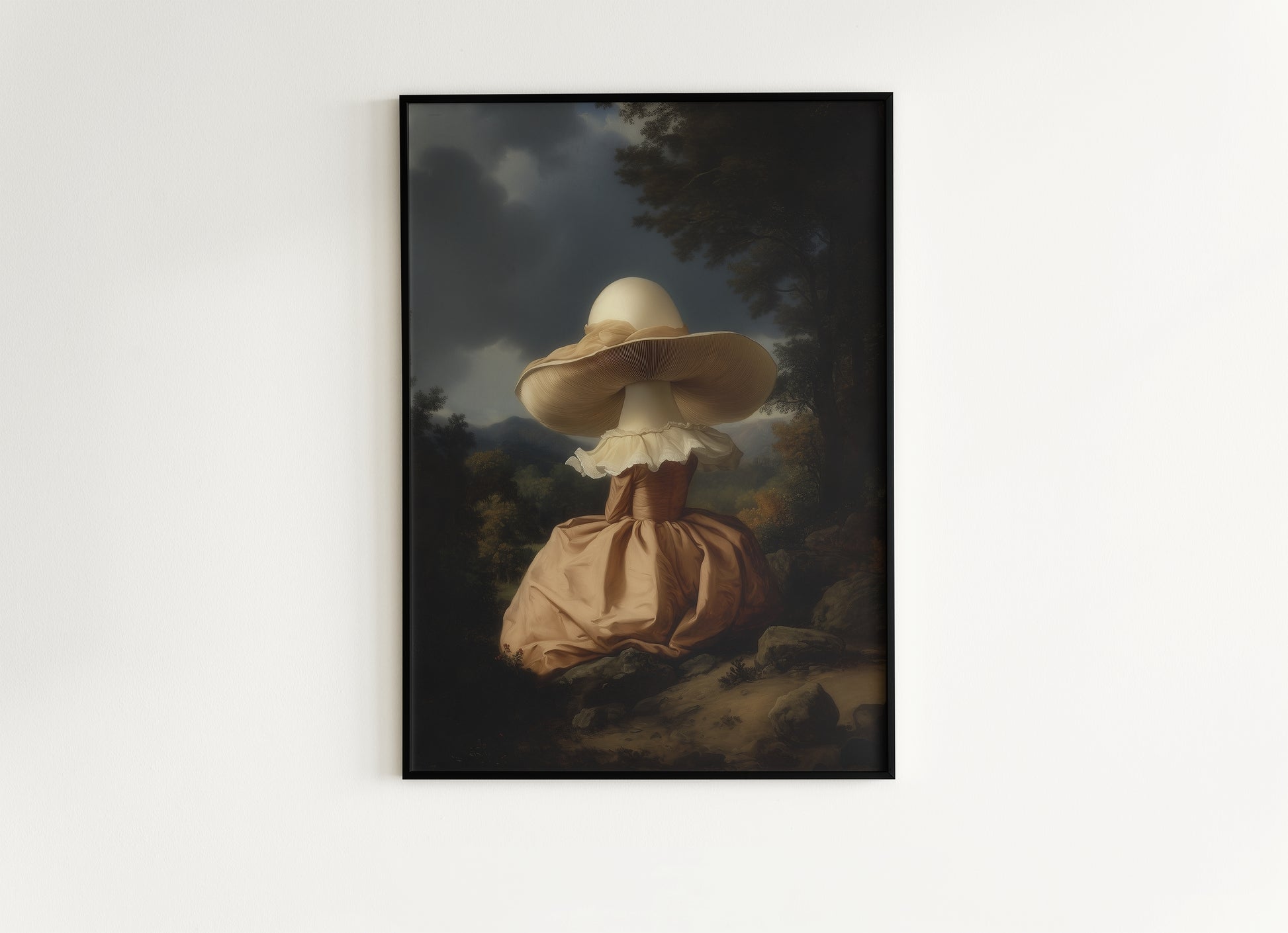 Surreal Mushroom Lady in Vintage Landscape, Mushroom Woman, Vintage Poster, Art Poster Print, Dark Academia, Gothic, Cottagecore, Witch Art.