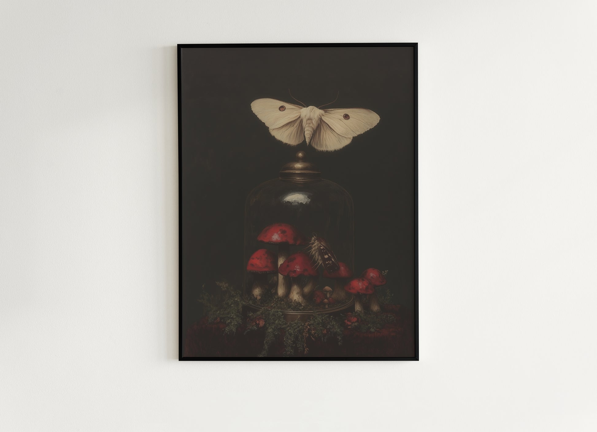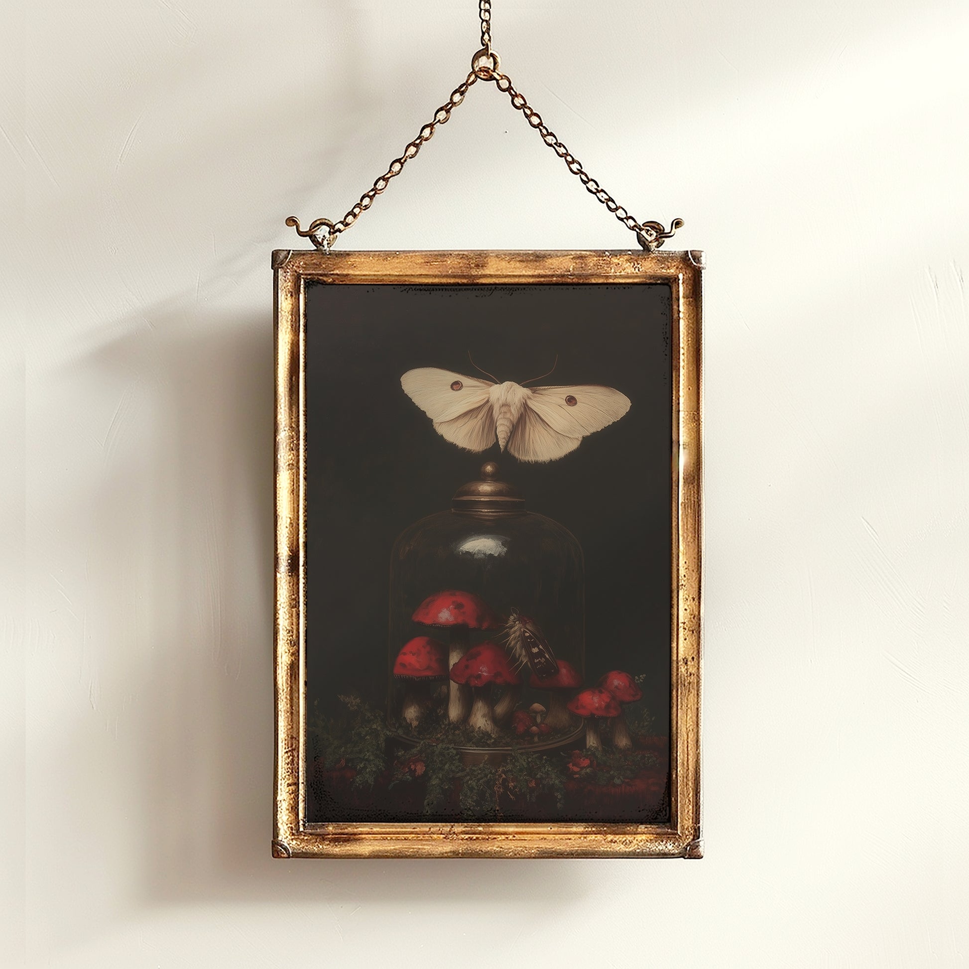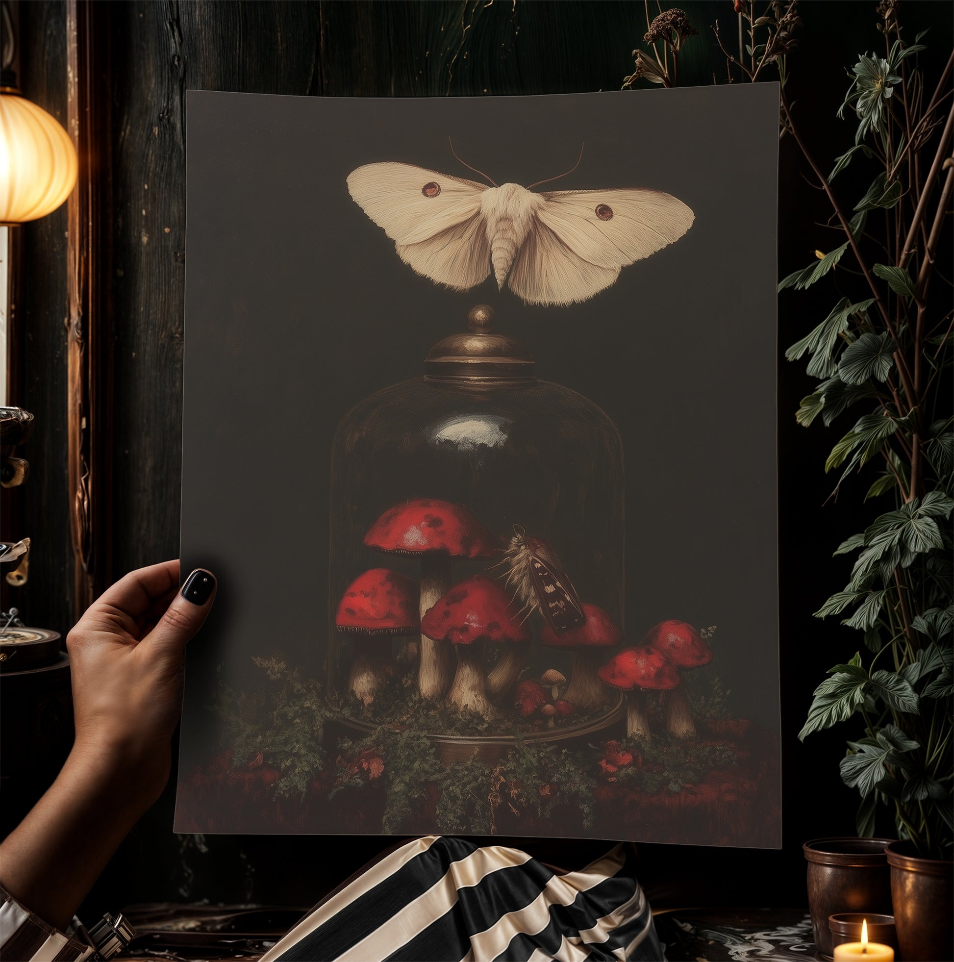 This vintage style forest wall art features a soft-toned white moth resting atop a moody glass dome filled with red mushrooms, surrounded by dark botanicals. Blending gothic aesthetics with dark cottagecore, it's perfect for witchy walls, altars, or reading nooks.