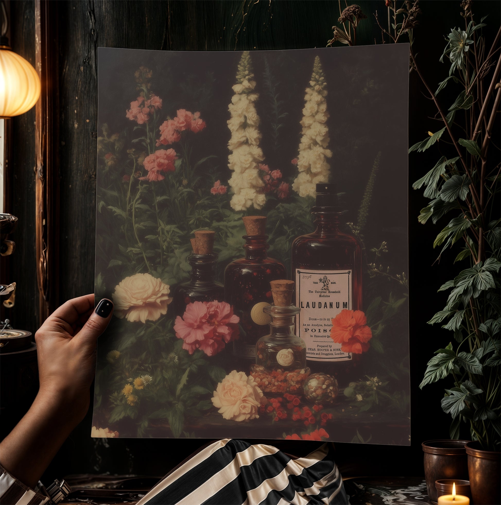 Laudanum Apothecary Jar Wall Art Print, Dark Academia Poster, Vintage Floral Painting, Witchy Gifts, Gothic Cottagecore Decor