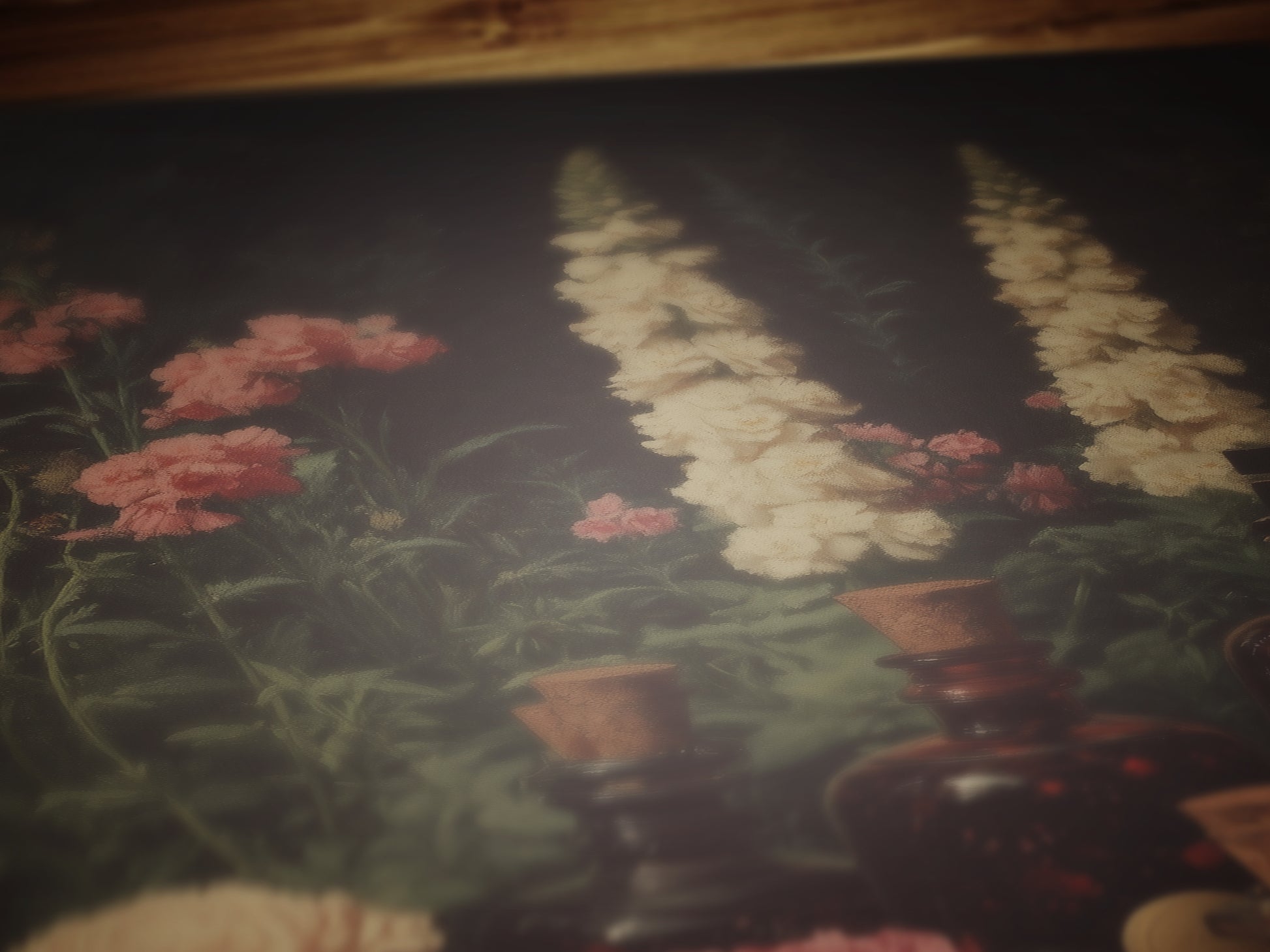 This moody floral wall art print painting features witchy vintage apothecary jar bottles surrounded by delicate garden blooms and labeled elixirs, evoking the mysterious world of herbal medicine and magic. Perfect for anyone drawn to the dark elegance of pharmacy history, macabre curiosities, or witchcraft-inspired interiors.