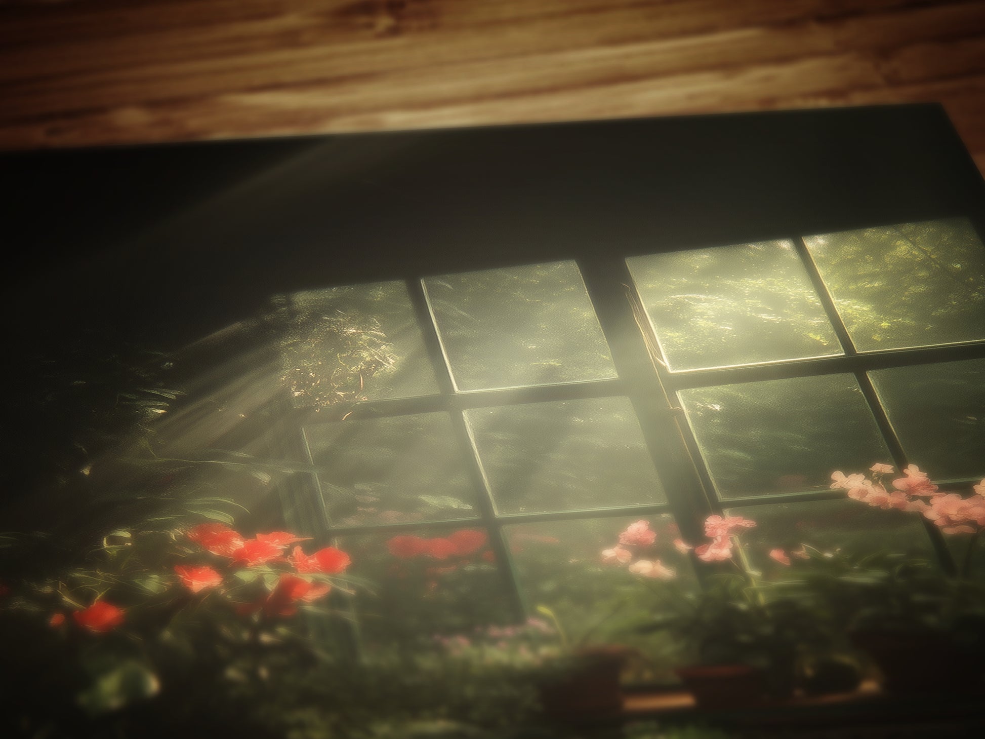 🌿 Victorian Greenhouse: A peaceful, nostalgic scene featuring warm sunlight filtering through lush, moody greenery.