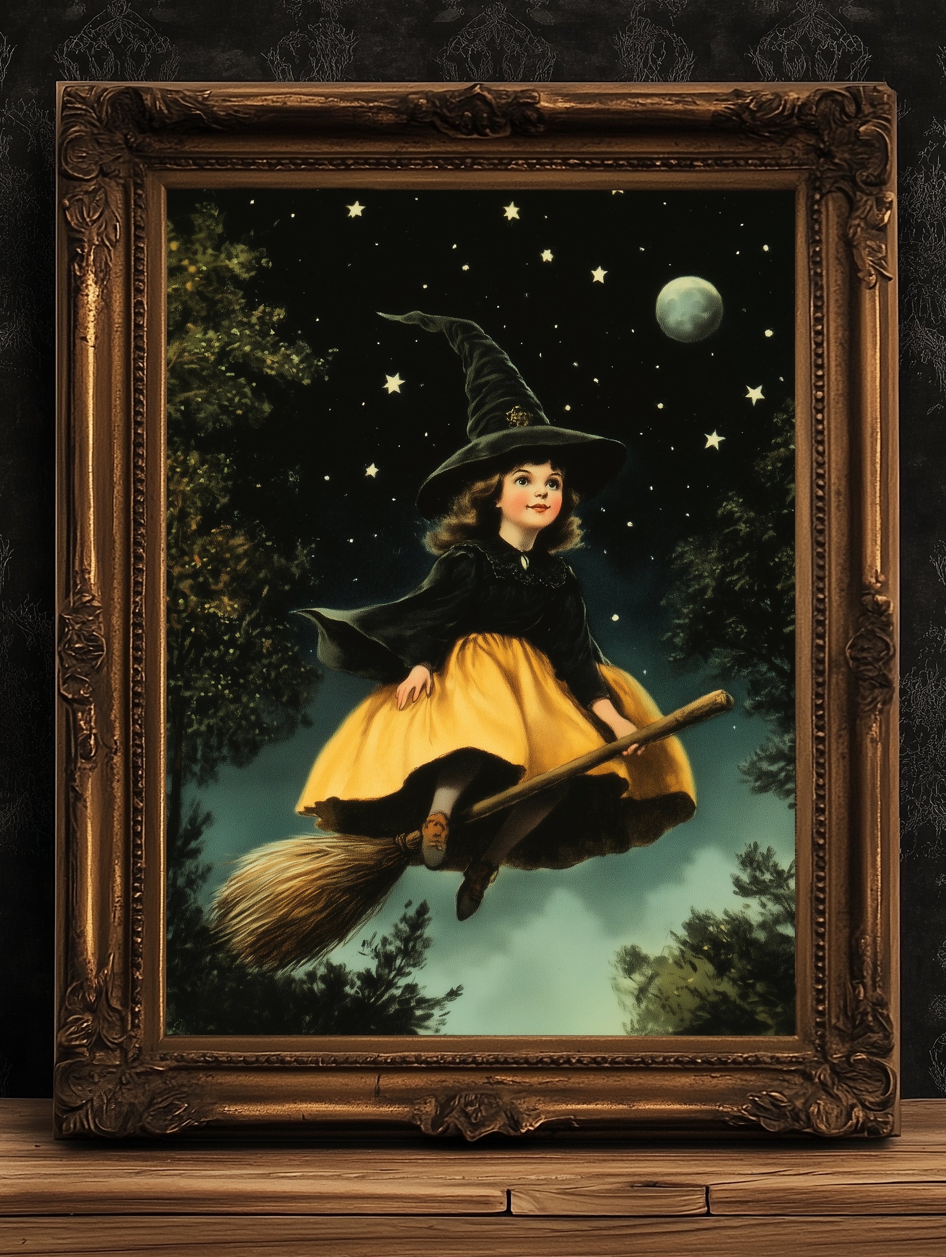 Whimsical Halloween charm meets vintage nostalgia in this enchanting witch art print. Featuring a sweet young witch flying through a starlit sky, this piece blends magical storytelling with gothic whimsy—perfect for dark academia or whimsigoth interiors 🌙✨🧹