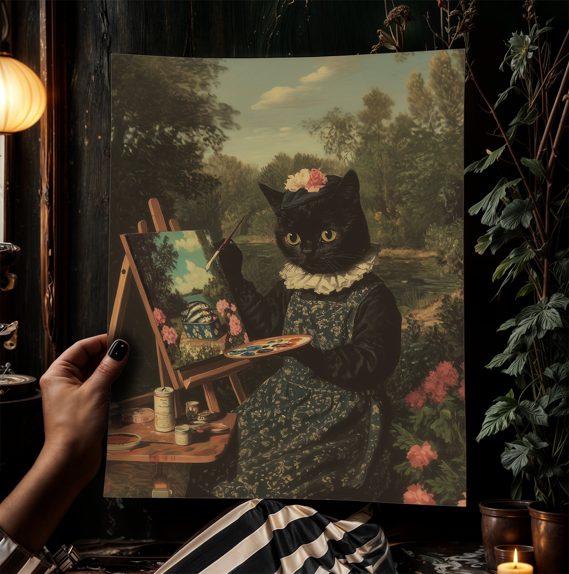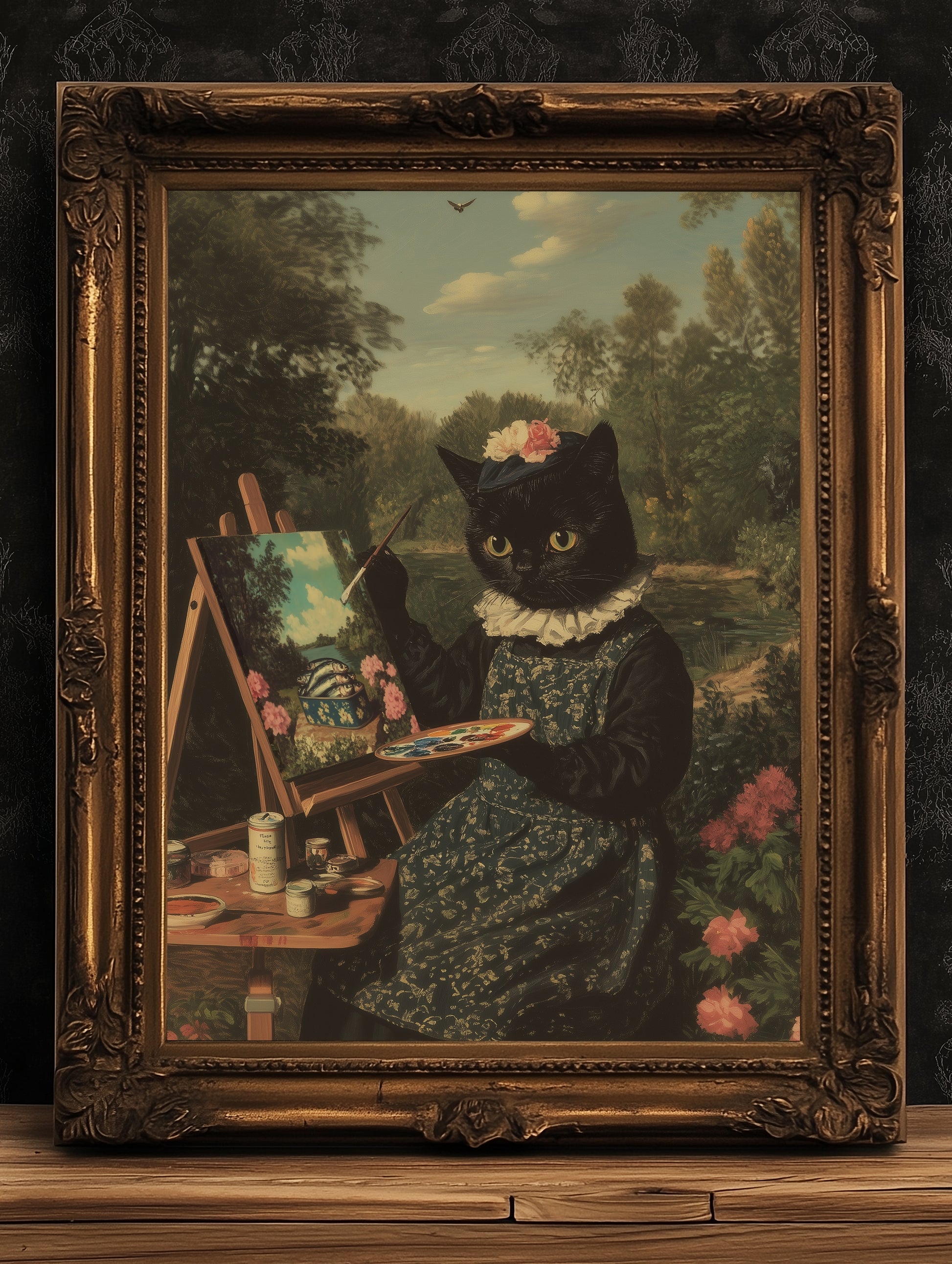 🎨 Features a vintage gothic cat painting outdoors in full floral regalia