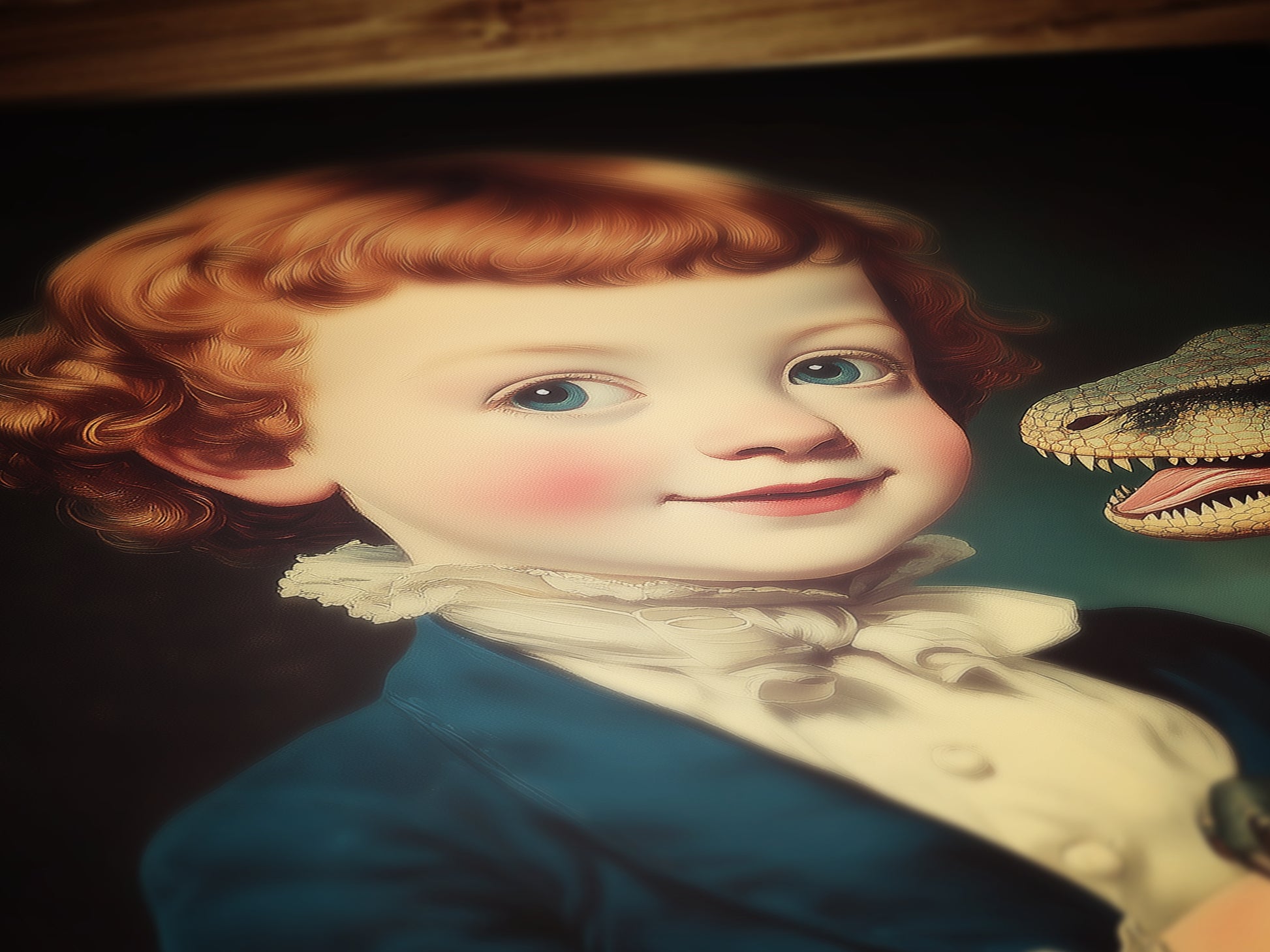 This surreal pet portrait blends Victorian charm with prehistoric whimsy, creating a delightful twist on traditional nursery art π¦β¨ Featuring a fanciful child holding a dinosaur, this quirky illustration brings playful weirdness and cottagecore nostalgia to your kidβs room or gallery wall.