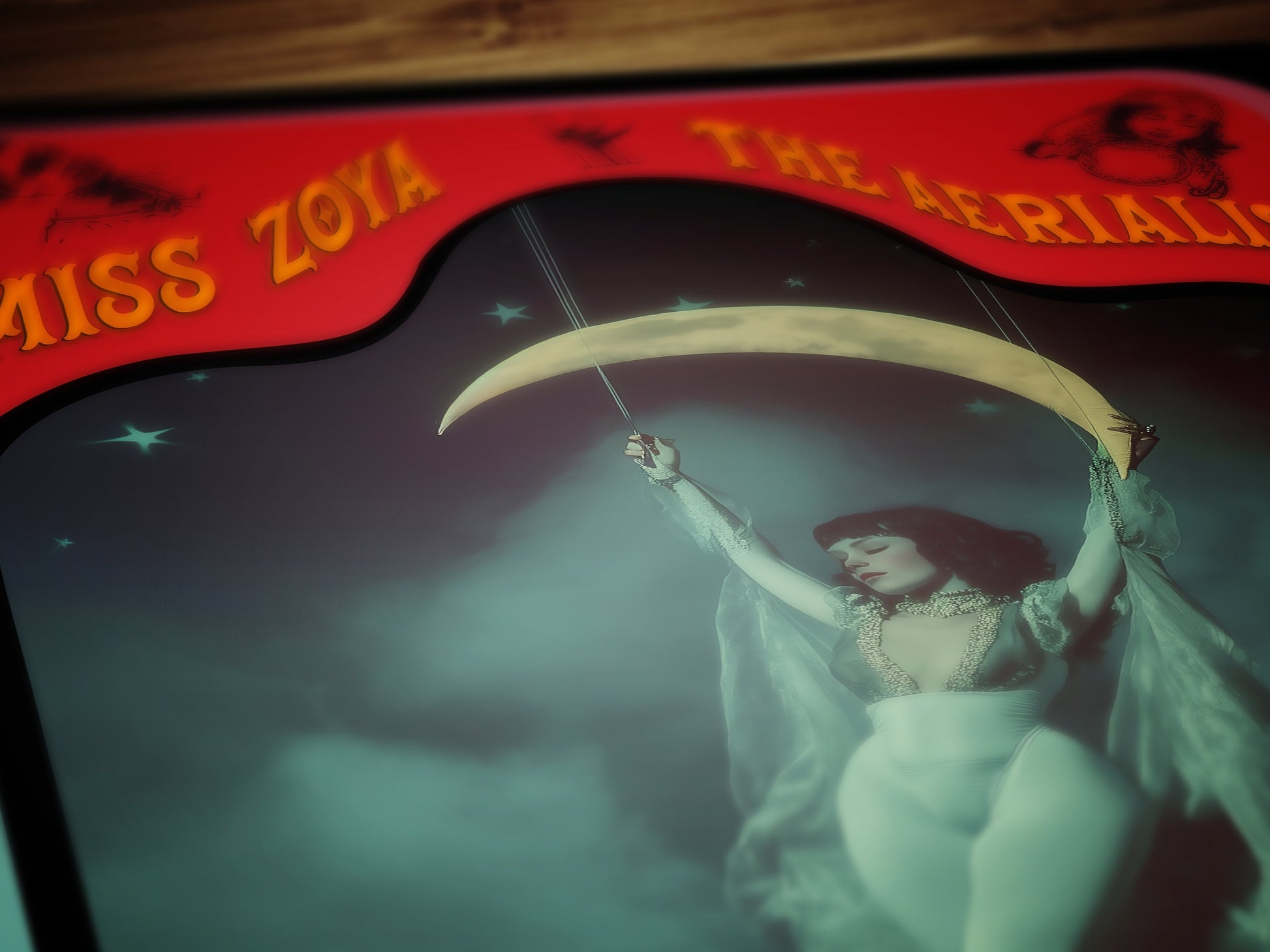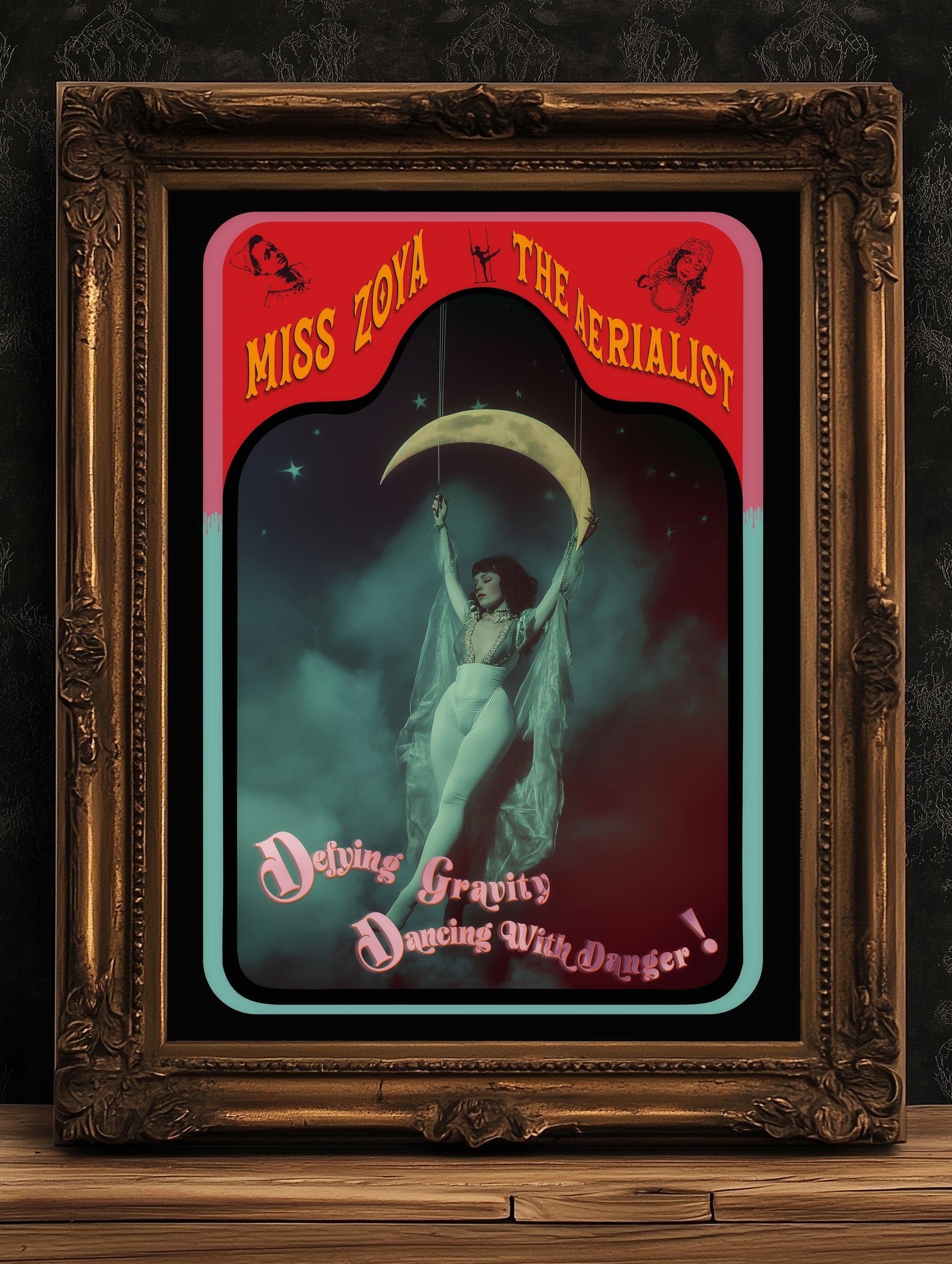 Step into the enchanting and mystical world of vintage circus art with the stunning Miss Zoya, the aerialist, gracefully suspended from a crescent moon. This retro-inspired poster brings together the elegance of aerial dance and the mystique of old-world circus curiosities and charm. Perfect for retro and vintage art lovers, performers, the railroad circus era or anyone fascinated by the beauty of high-flying acts.