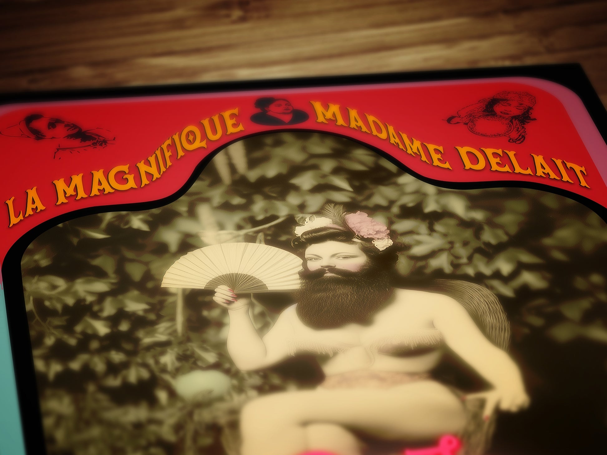 This vintage-style freakshow poster honors the legendary bearded lady, Madame Delait, in a bold and whimsical tribute to classic circus sideshow history. Blending retro circus decor with camp and curiosity, this circus wall art celebrates one of the most iconic circus performers of all time. With ornate lettering, saturated colors, and nostalgic flair, this bearded woman portrait is a must-have for fans of oddities decor and curiosities prints.