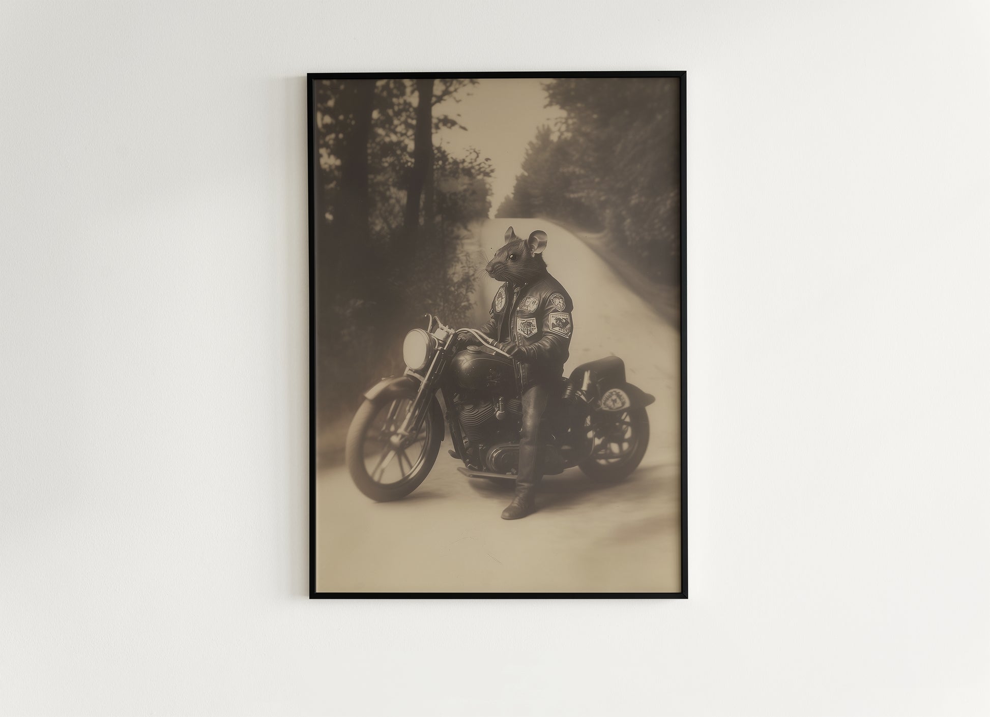 This bold and bizarre rat lover print features a dapper rodent biker in a leather jacket, cruising into the unknown like a true Sons of Anarchy outlaw. With nods to vintage animal decor and occult print styling, this surreal piece blends rebellion and rodent charm in the most unexpected way. Perfect for fans of Jax Teller, weirdcore art, or anyone looking to stir up conversation with a bizarre art print that leans into the curious and uncanny.