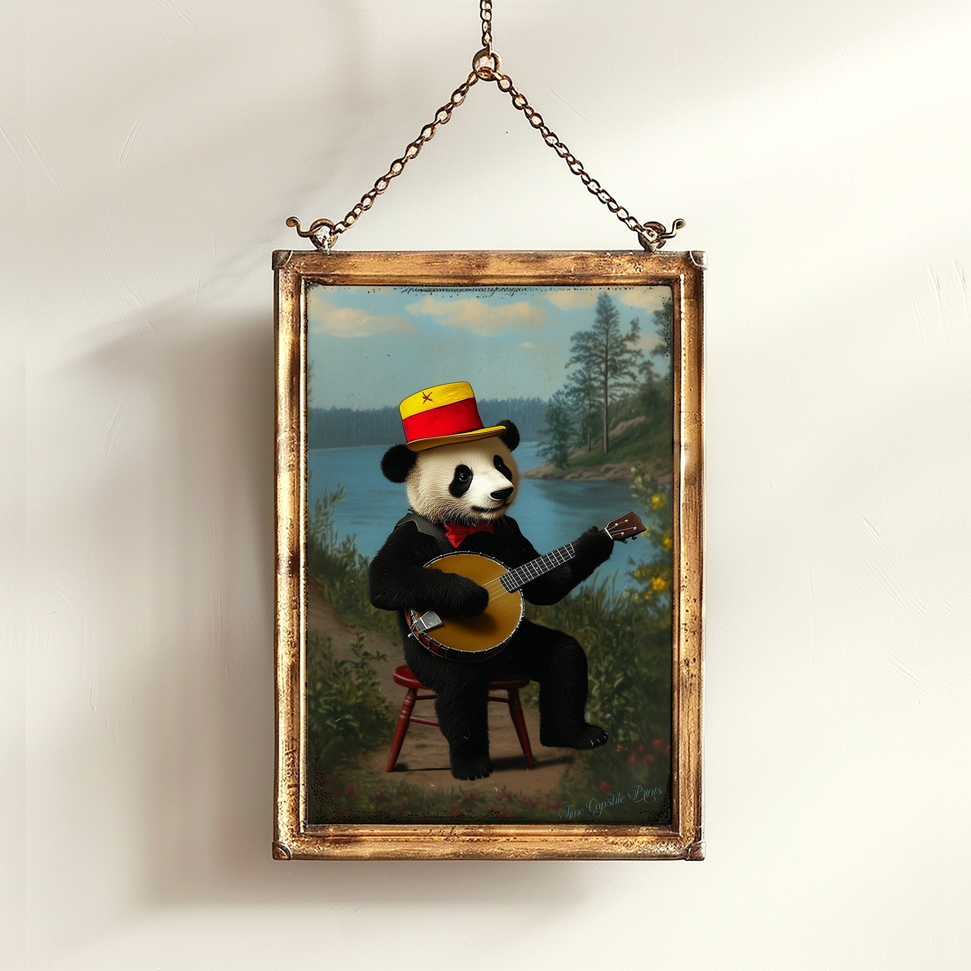 Vintage Panda Playing Banjo Art Print – Whimsical Animal Portrait with Retro Charm, Nursery Decor, Unique Musician Panda Wall Art