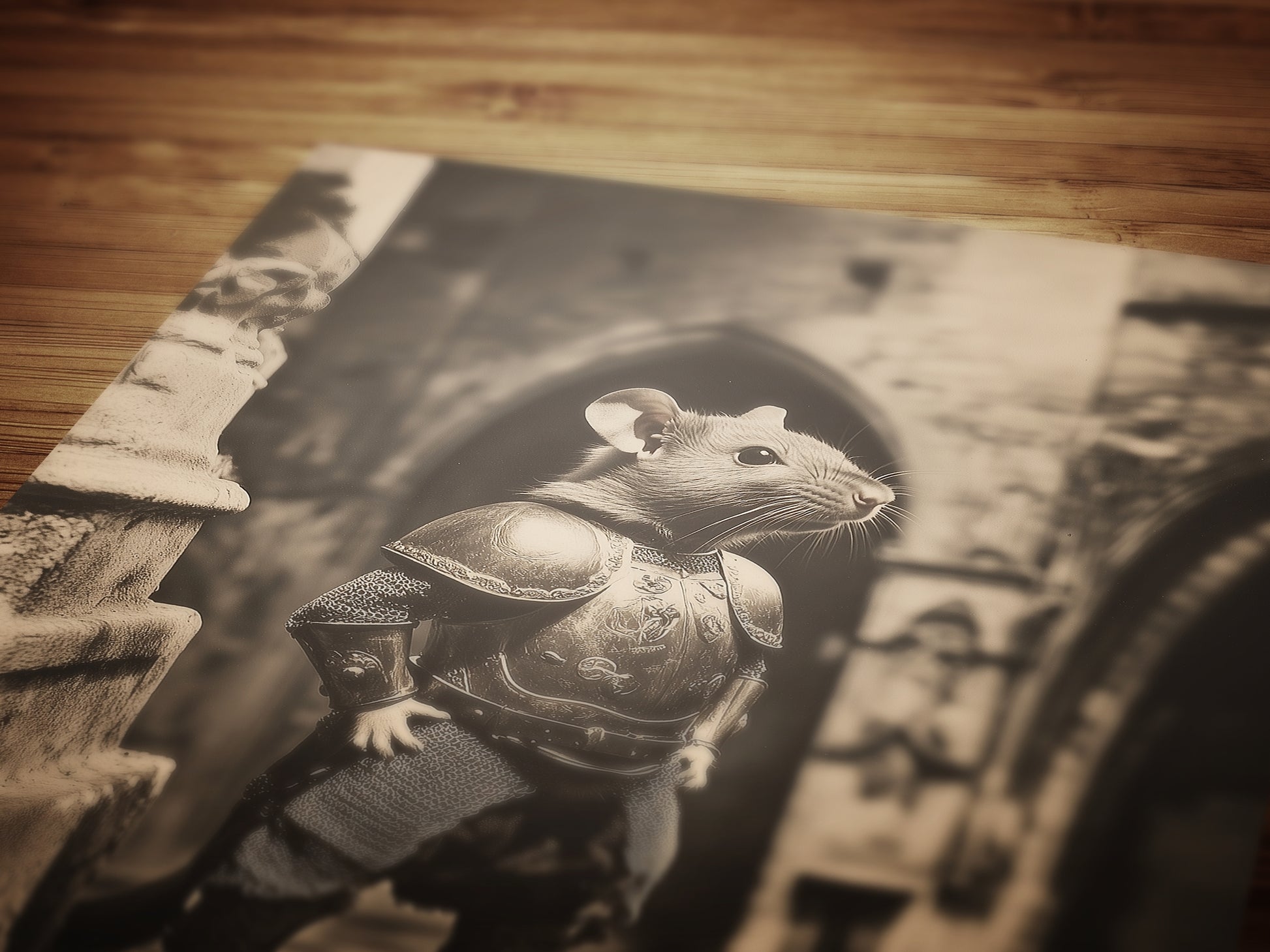 A heroic little warrior in a suit of armor πβοΈ This whimsical knight mouse print blends vintage photography with dark fantasy charm, perfect for lovers of the weird, animals, witty, and whimsigoth.