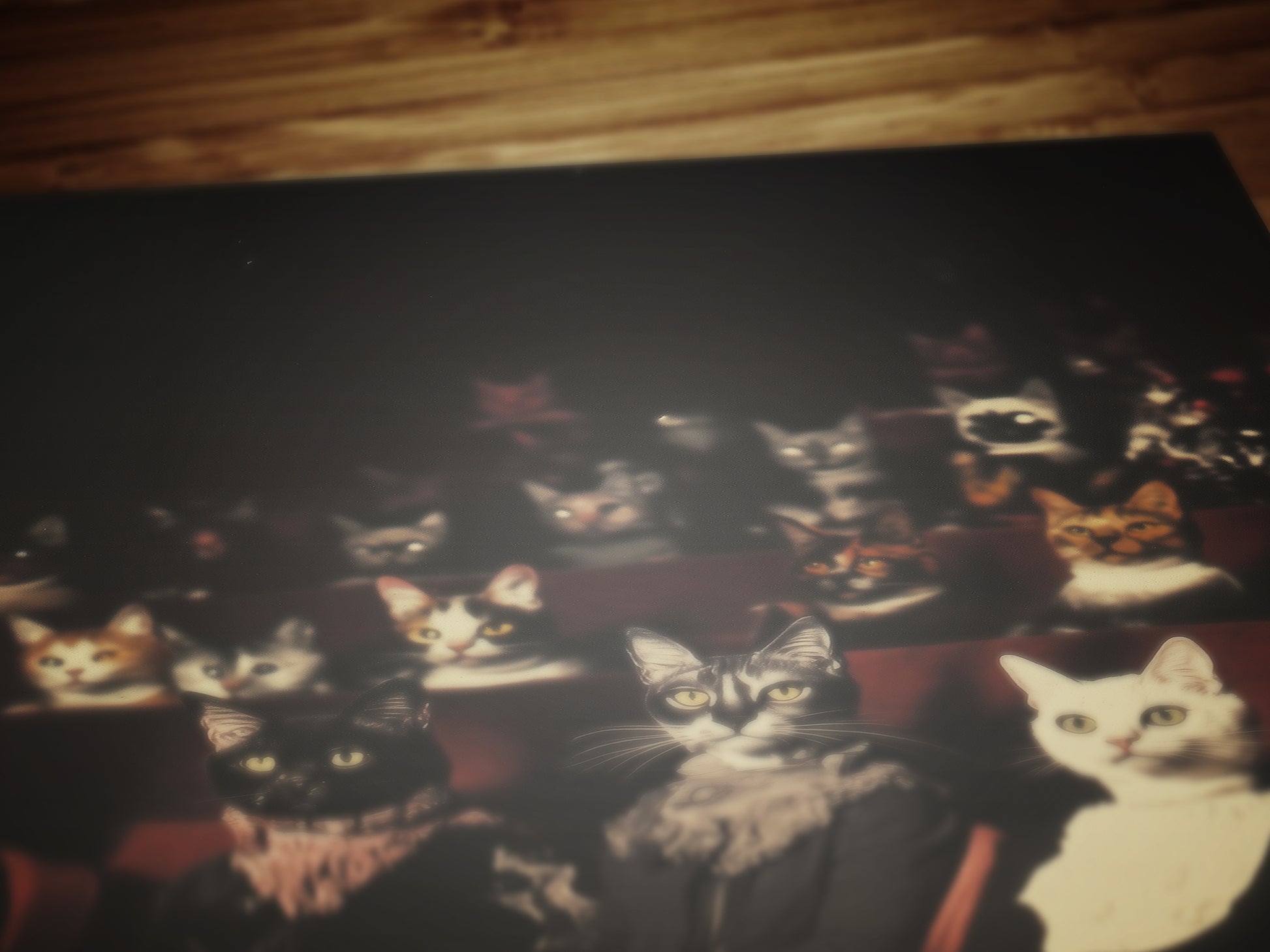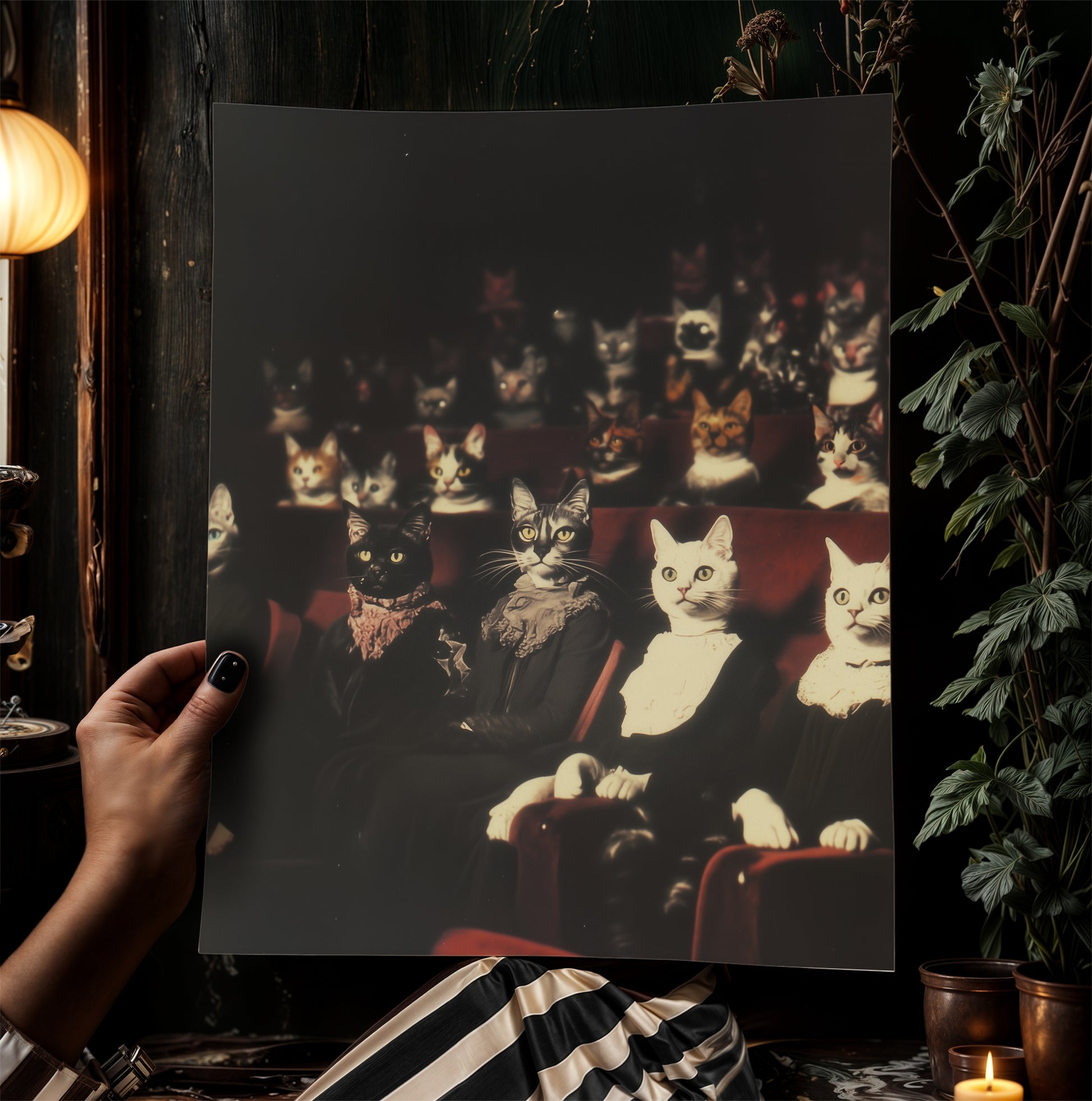 From quirky home decor to alt goth ornaments, this cats movie theatre scene is ideal for those who live between the strange and sublime. It's a must-have for fans of weird wall art, dreamcore vibes, and Victorian animal oddities.