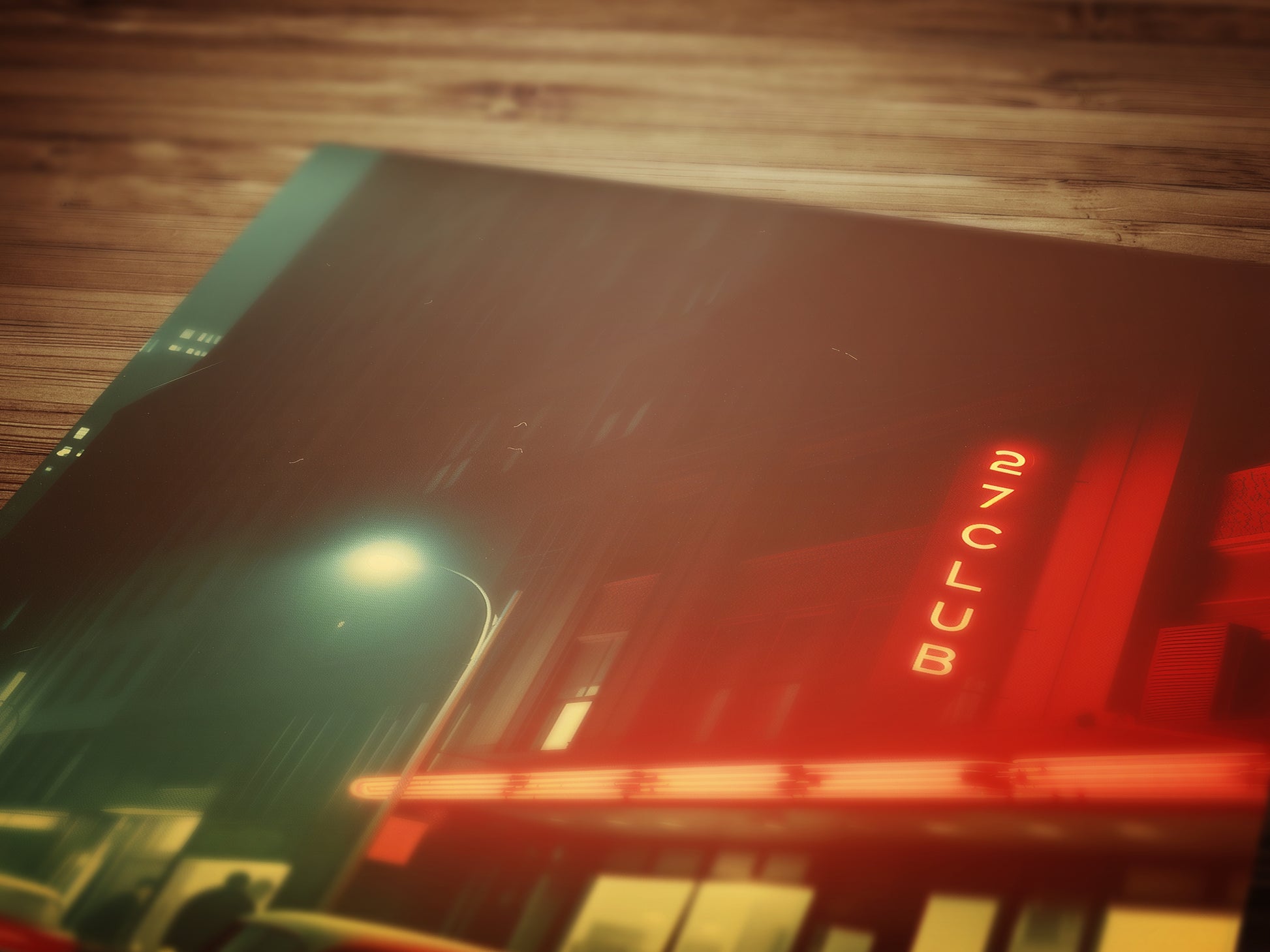 Immerse yourself in the allure of vintage urban nights with this evocative art print featuring the glowing 27 Club neon sign, classic cars, and a mysterious city street. Perfect for lovers of retro nostalgia and noir-inspired decor. πβ¨