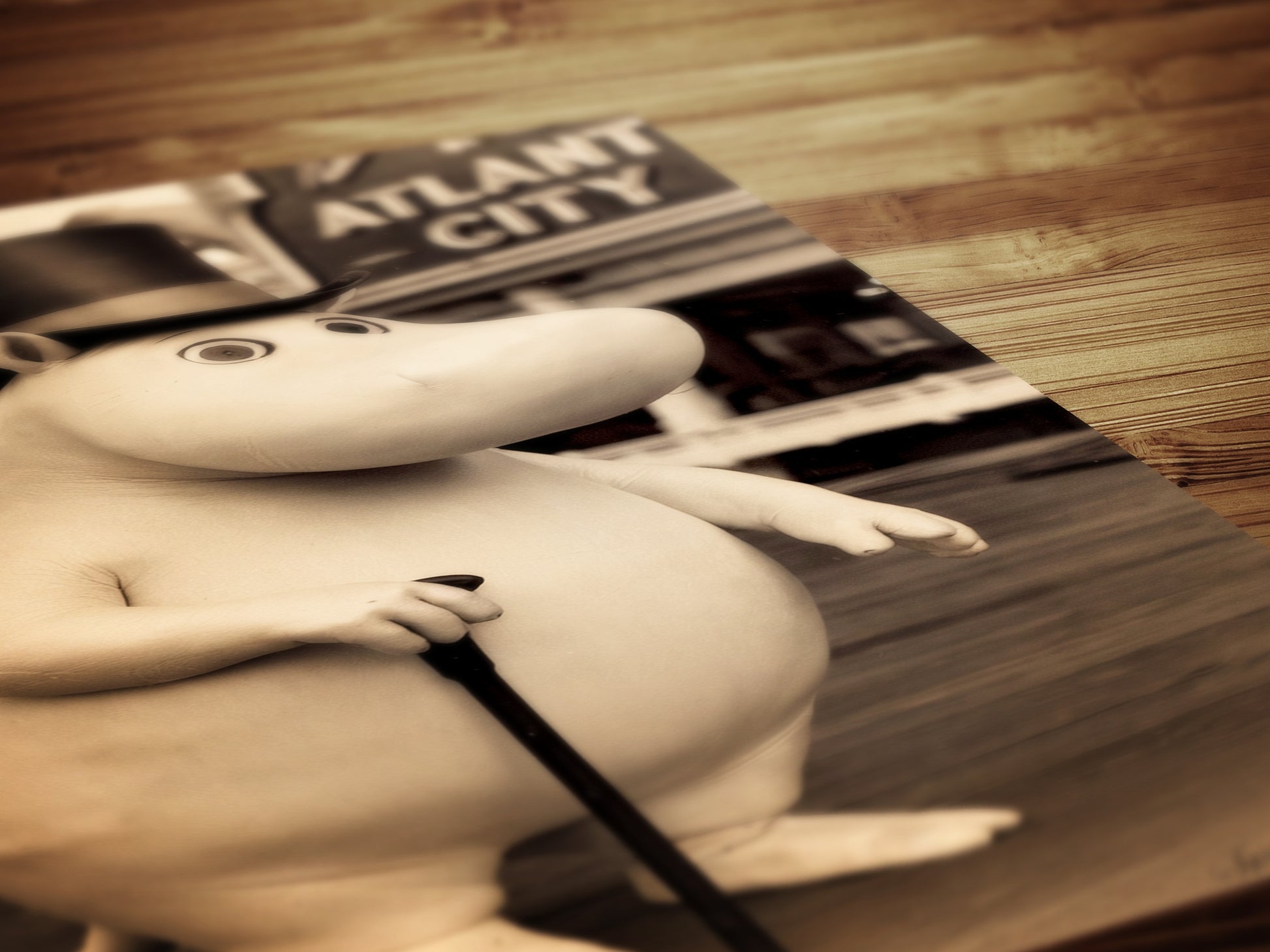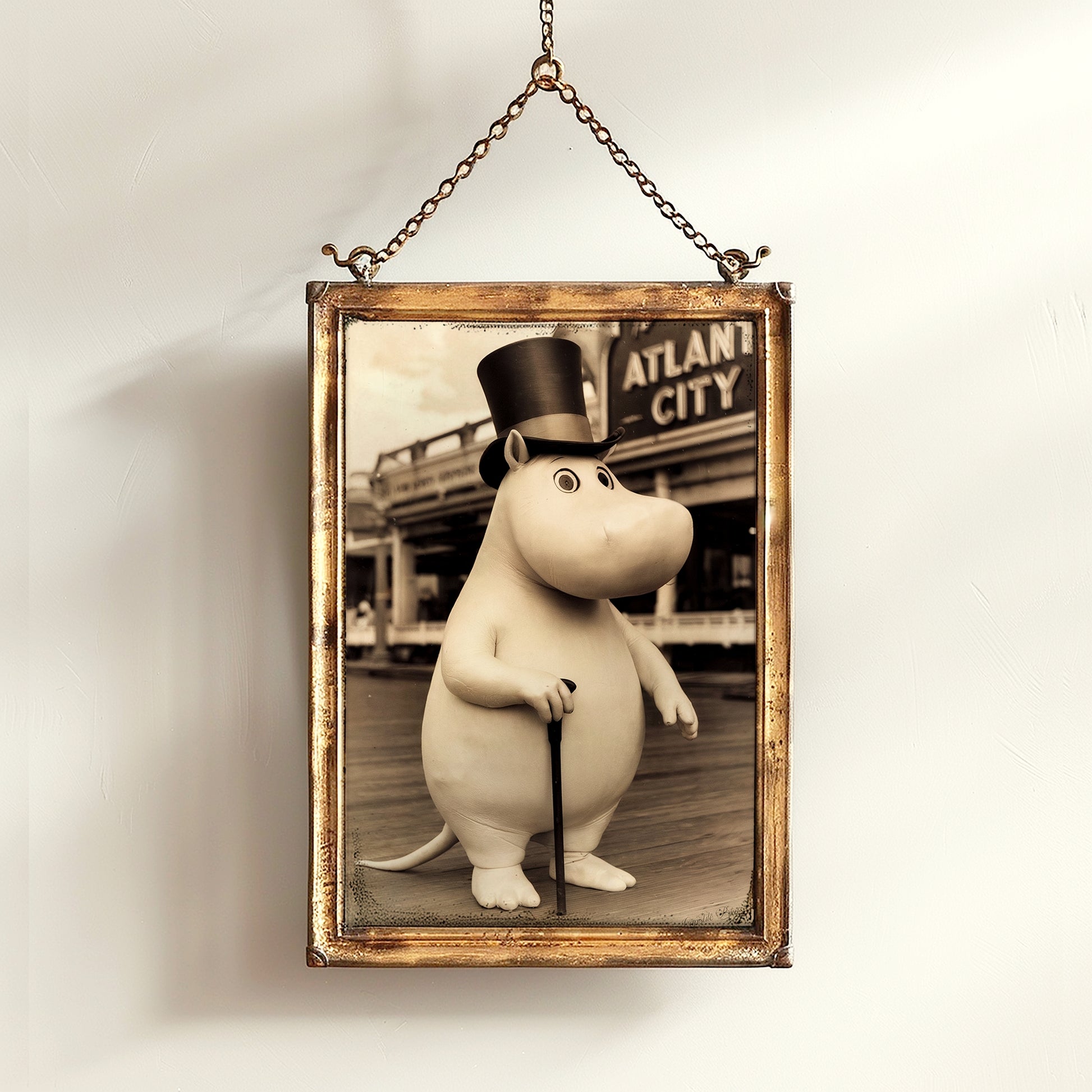 This vintage-style artwork features a Moomin character dressed in a dapper top hat and holding a cane, set against a nostalgic Atlantic City backdrop. The whimsical and retro aesthetic makes it a charming addition to any space, perfect for fans of Moomin or lovers of quirky decor. Taking a walk on the boardwalk. This print is ideal for collectors, retro enthusiasts, or anyone looking for unique and playful artwork to enhance their home. A thoughtful gift for those who appreciate vintage-inspired art with a touch of character.