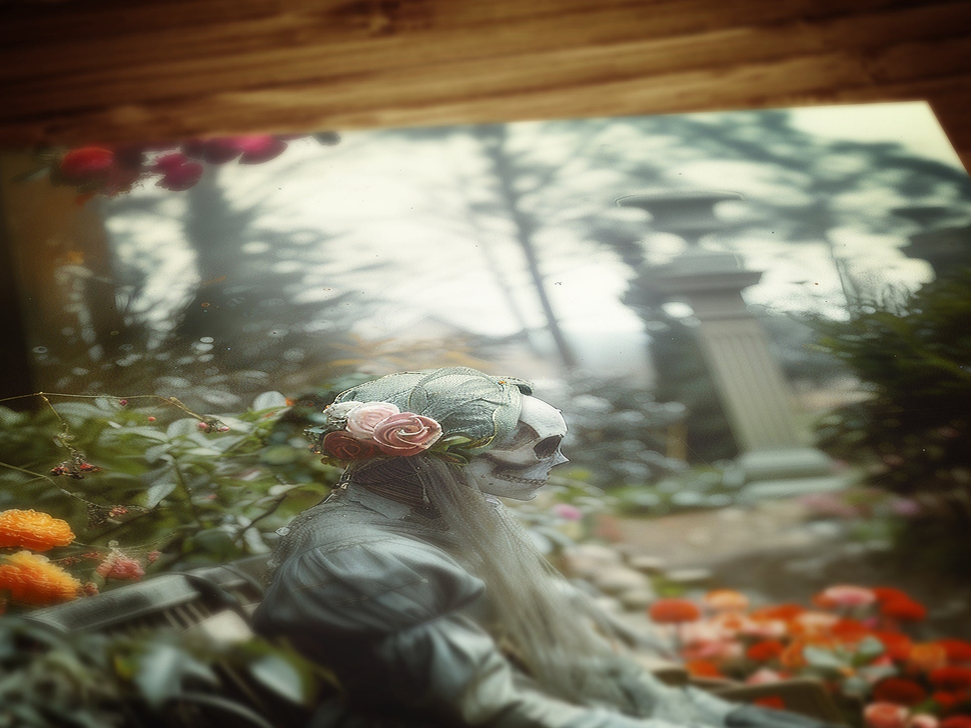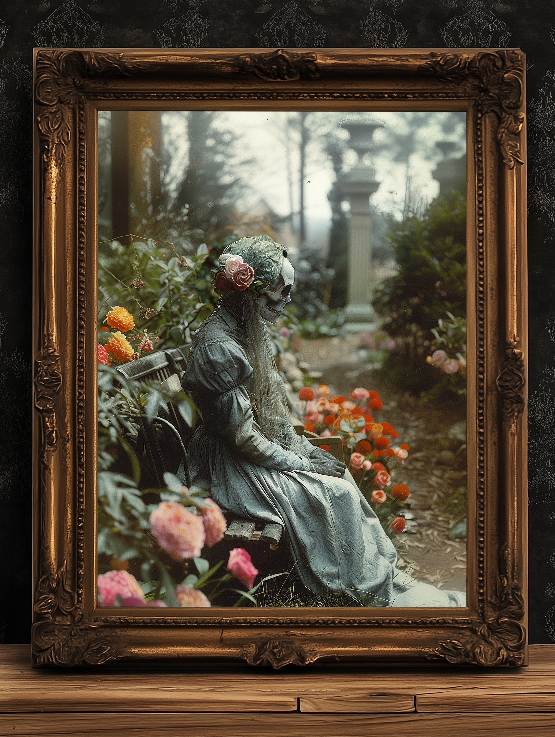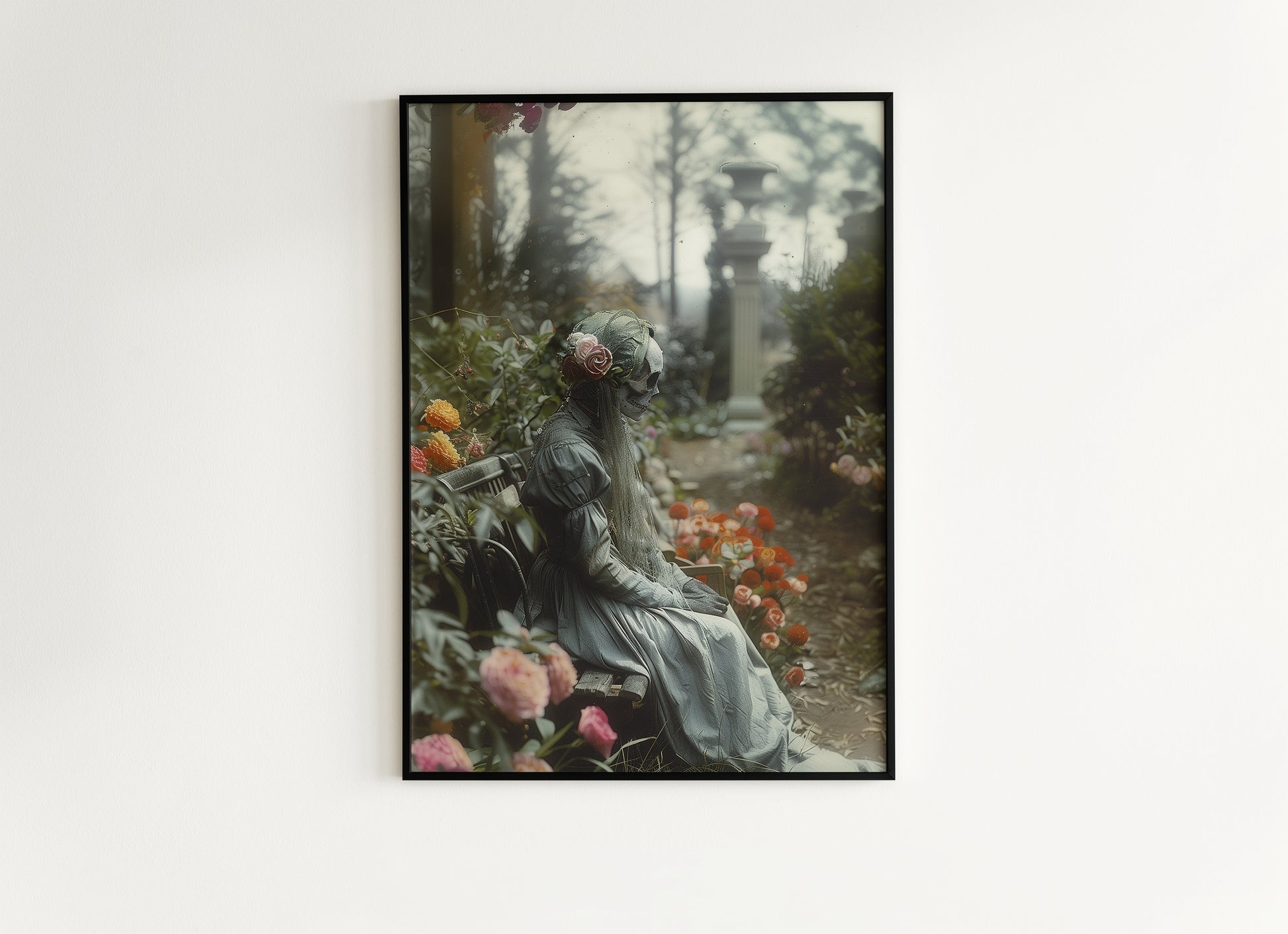 A quiet figure rests in a flower-filled garden, wrapped in stillness and mystery. This moody wall art evokes themes of eternal love, memory, and the beauty in the macabre π₯π«οΈ. Perfect for those drawn to gothic aesthetics, haunted romance, and art that speaks softly from the shadows.