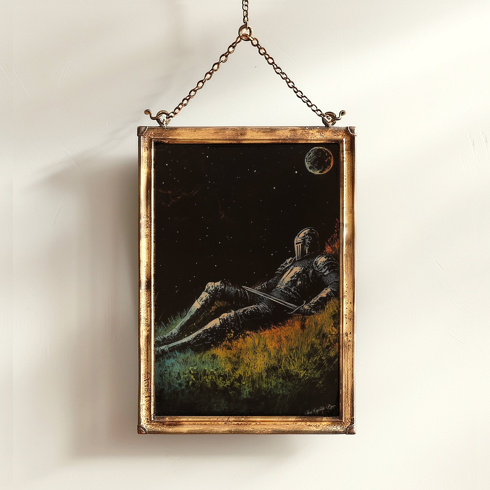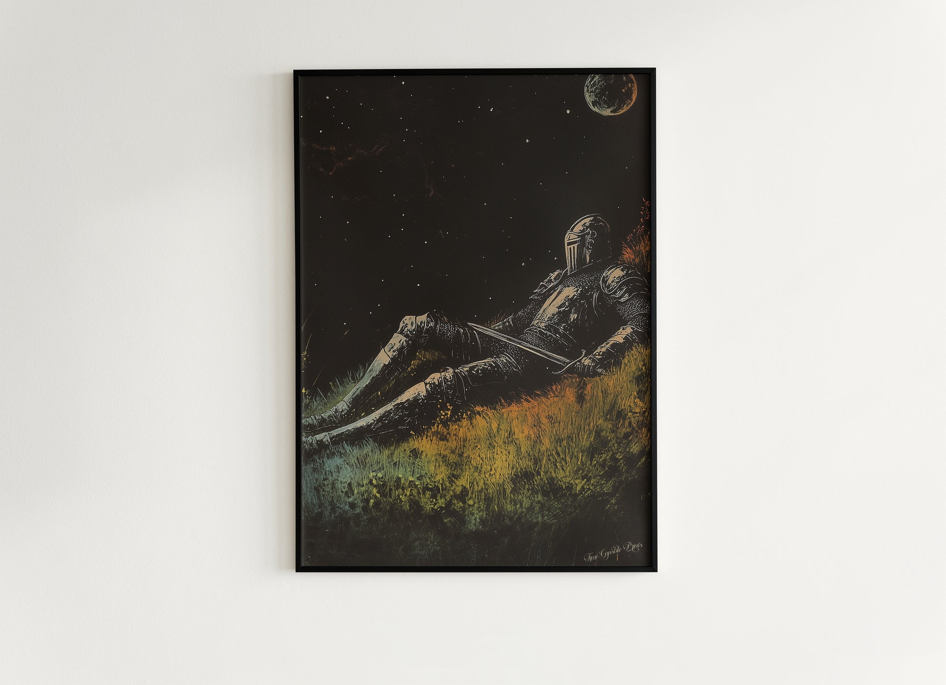 Celestial Knight Art Print – Retro Medieval Goth Fantasy Wall Decor, Dark Gothic Warrior Poster, Cosmic Dreamscape Illustration