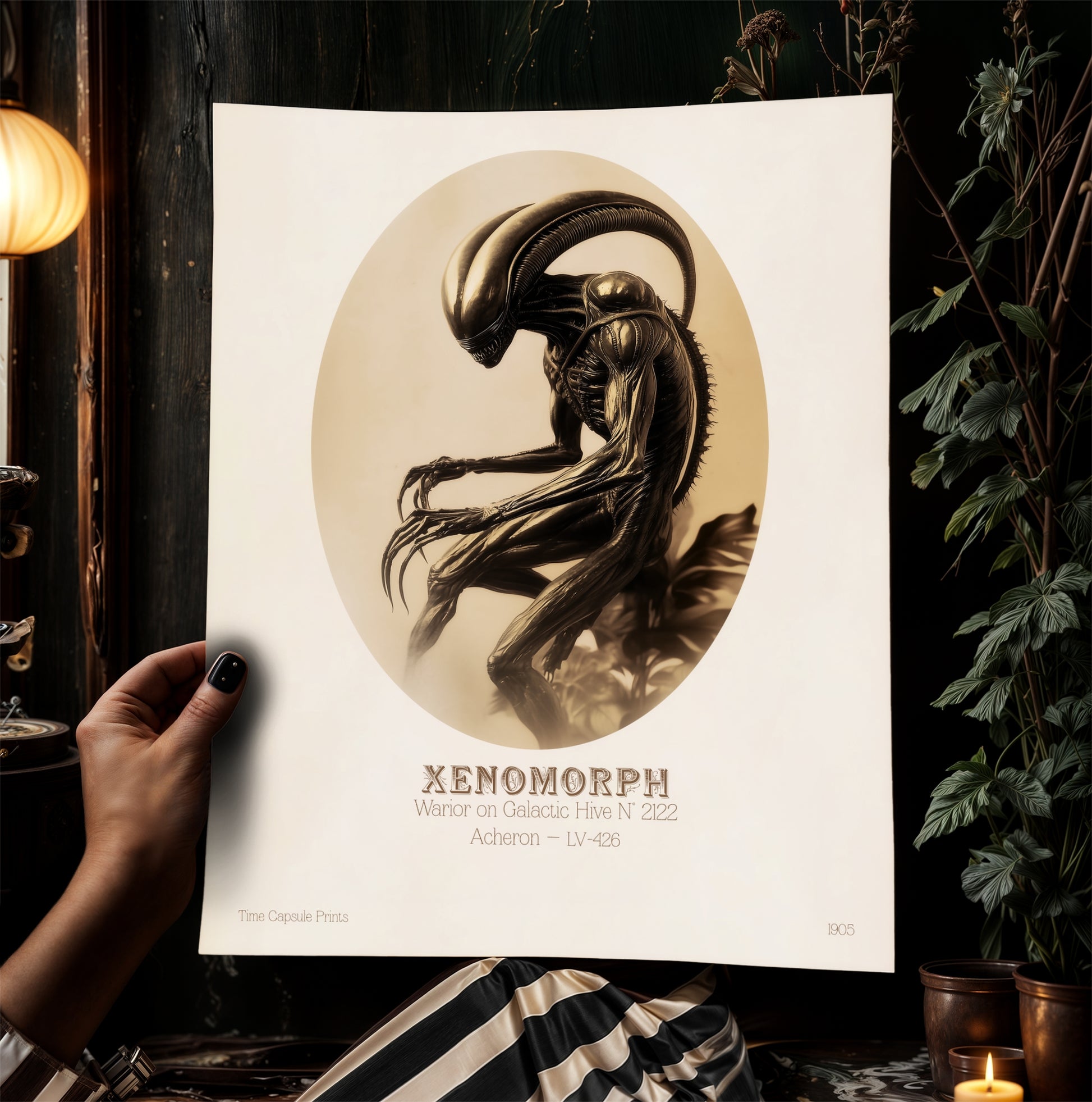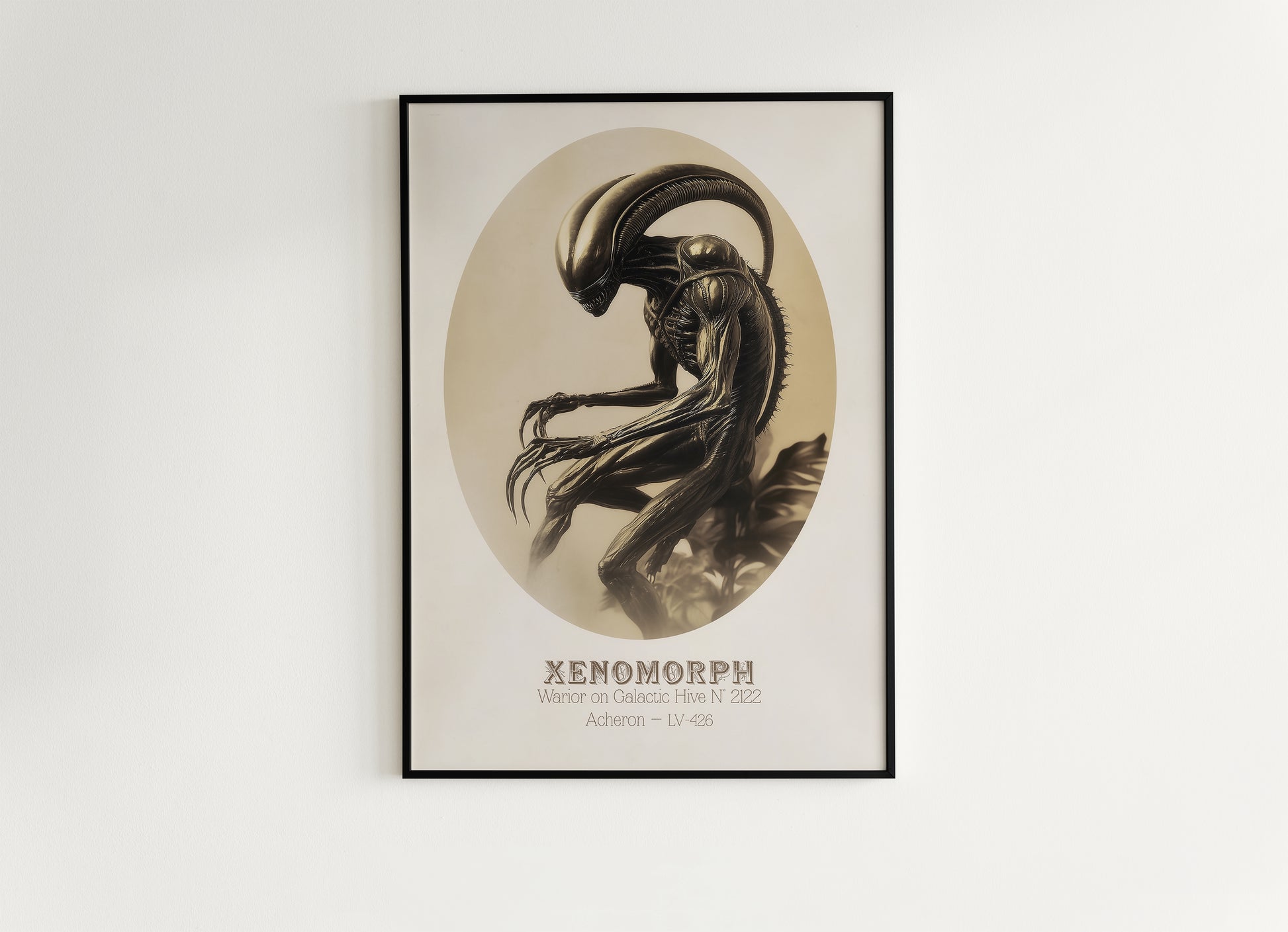 This art print captures the fearsome presence of a Xenomorph warrior, blending vintage aesthetics with the dark sci-fi horror of deep space. Rendered in a sepia-toned, Victorian-style portrait, it presents the creature in a hauntingly elegant way, as if cataloged from a distant world. The intricate details and classic oval framing give it a timeless quality, making it an ideal piece for sci-fi enthusiasts and collectors of unique art. Inspired by the legendary creature from deep space lore, this print adds a captivating presence to any space.
