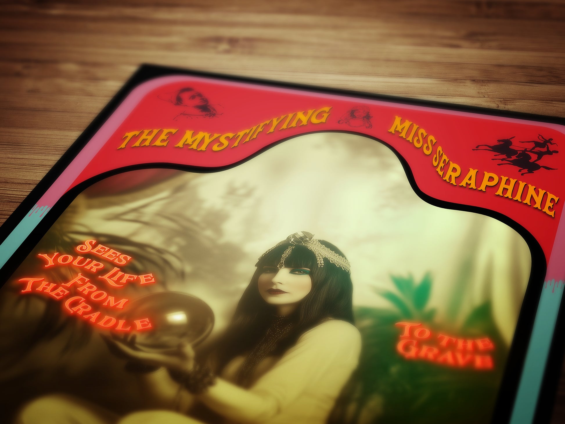 Channel the vintage mystique of an old-world circus with this whimsigoth decor masterpiece. Featuring a mysterious fortune teller gazing into her glowing crystal ball, this retro circus decor captures the allure of the freak show era with a modern dark twist. Perfect for fans of mystical circus art, oddities decor, and gothic home decor, this striking circus poster brings drama, wonder, and enchantment to any space.