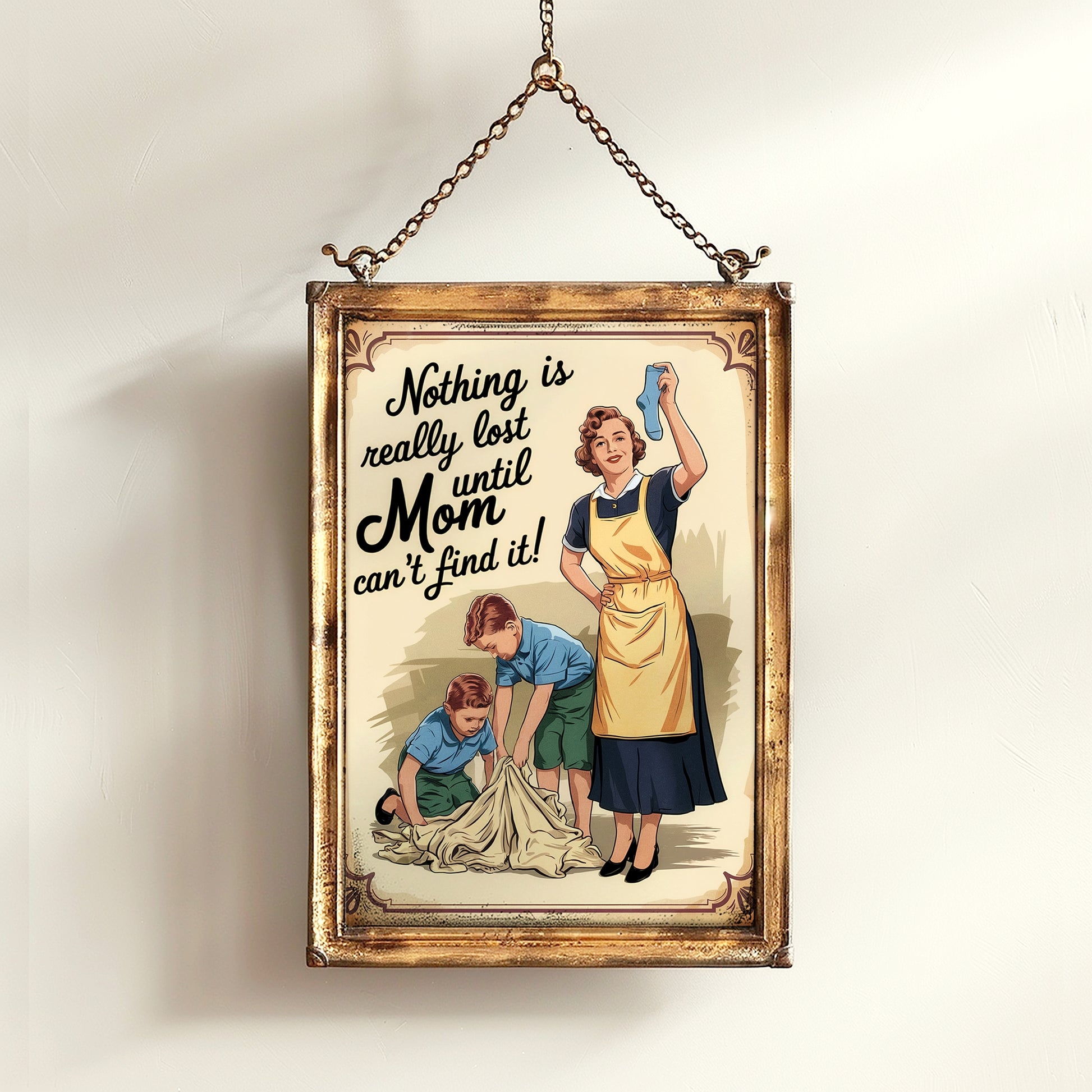 This funny mom wall art captures the reality of motherhood with a charming humorous vintage housewife poster featuring the quote: Nothing is really lost until Mom can’t find it! Perfect for adding a nostalgic touch to a retro family decor setup or as a quirky home print that brings humor to any space. Whether for a laundry room sign, a witty Mother’s Day gift, or simply a playful addition to your home, this print is a delightful tribute to moms everywhere.