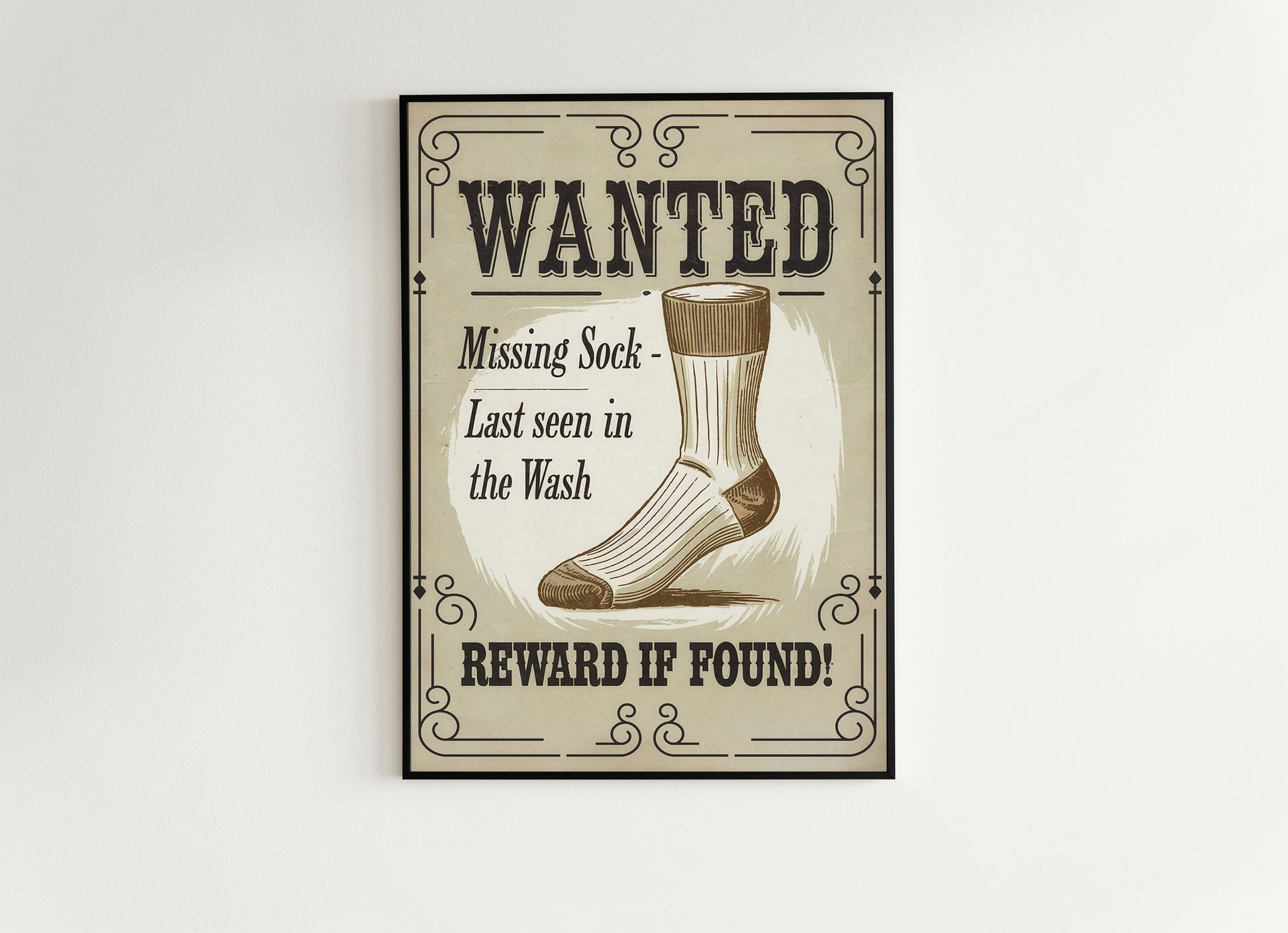 Funny Lost Sock Poster, Vintage Laundry Room Sign, Western Wanted Sign Print, Quirky Laundry Decor, Retro Missing Sock Art, Witty Home Art