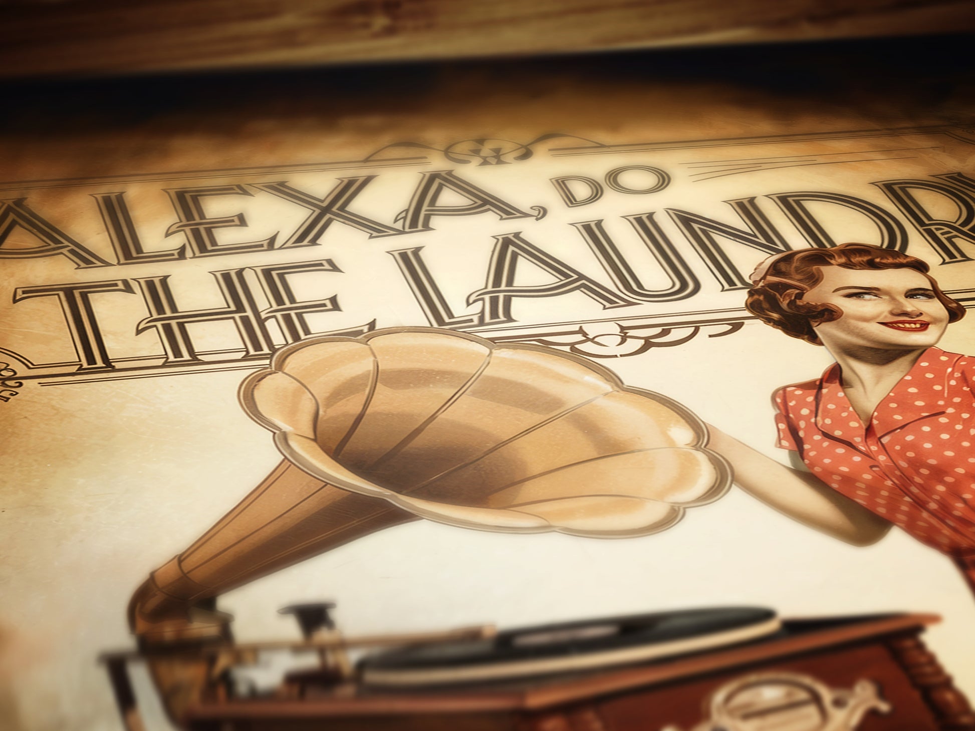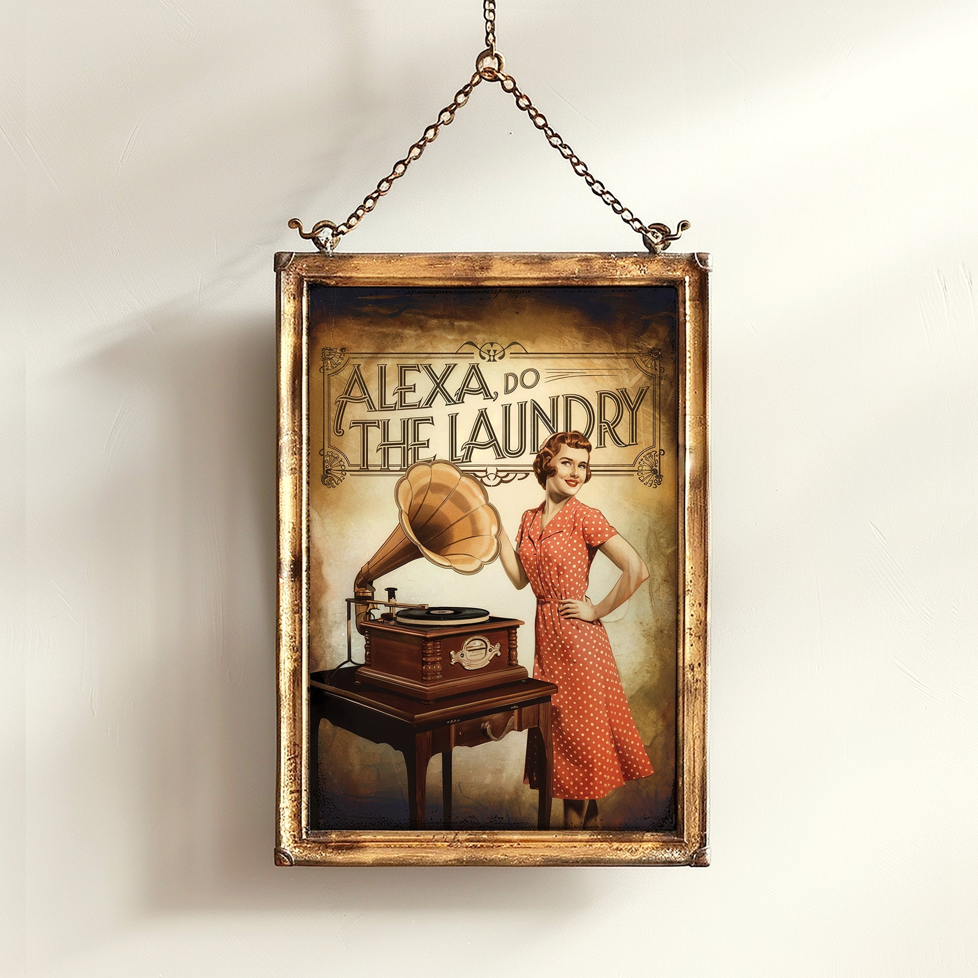 This funny Alexa laundry poster brings a clever mix of vintage retro style wall art and modern humor, featuring a mid-century housewife print with a playful twist. Designed for those who love quirky laundry room decor, this humorous home sign blends classic 1950s aesthetics with a tech-savvy joke. Perfect as witty wall art for your laundry space or as a unique gift for anyone who wishes Alexa could do more than just play music.