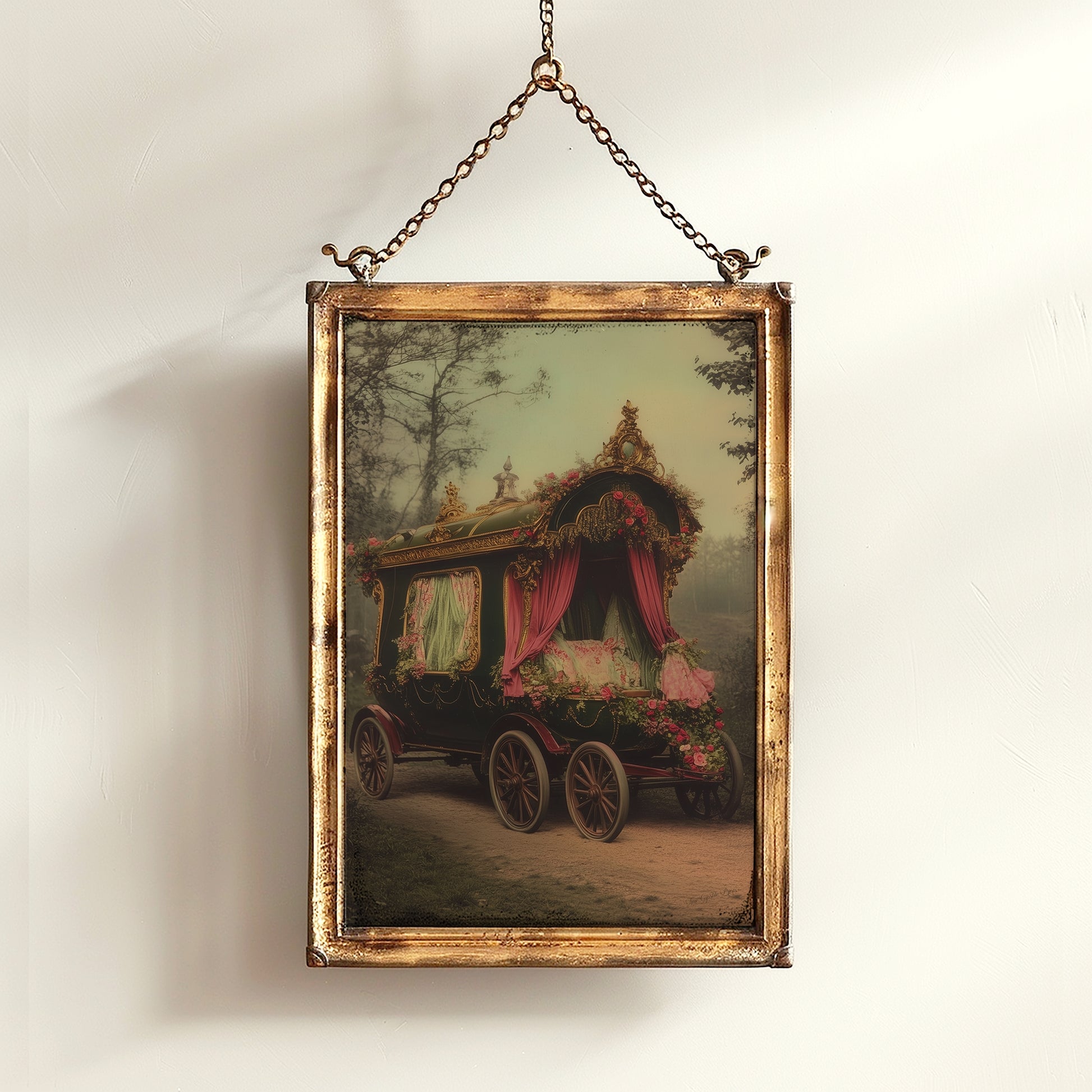 This Victorian gypsy vardo caravan art captures the mystical elegance of a bygone era, blending dark academia decor with a whimsigoth aesthetic. Set in an eerie woods decor, this ornate fortune teller wagon evokes the spirit of a vintage circus and the wandering lifestyle of a witchy psychic reader. Whether inspired by gothic fairytales, carnival themes, or antique traveling performers, this piece tells a story of mystery, destiny, and old-world charm. A stunning addition for lovers of circus posters, moody Victorian art, and enchanted storytelling.
