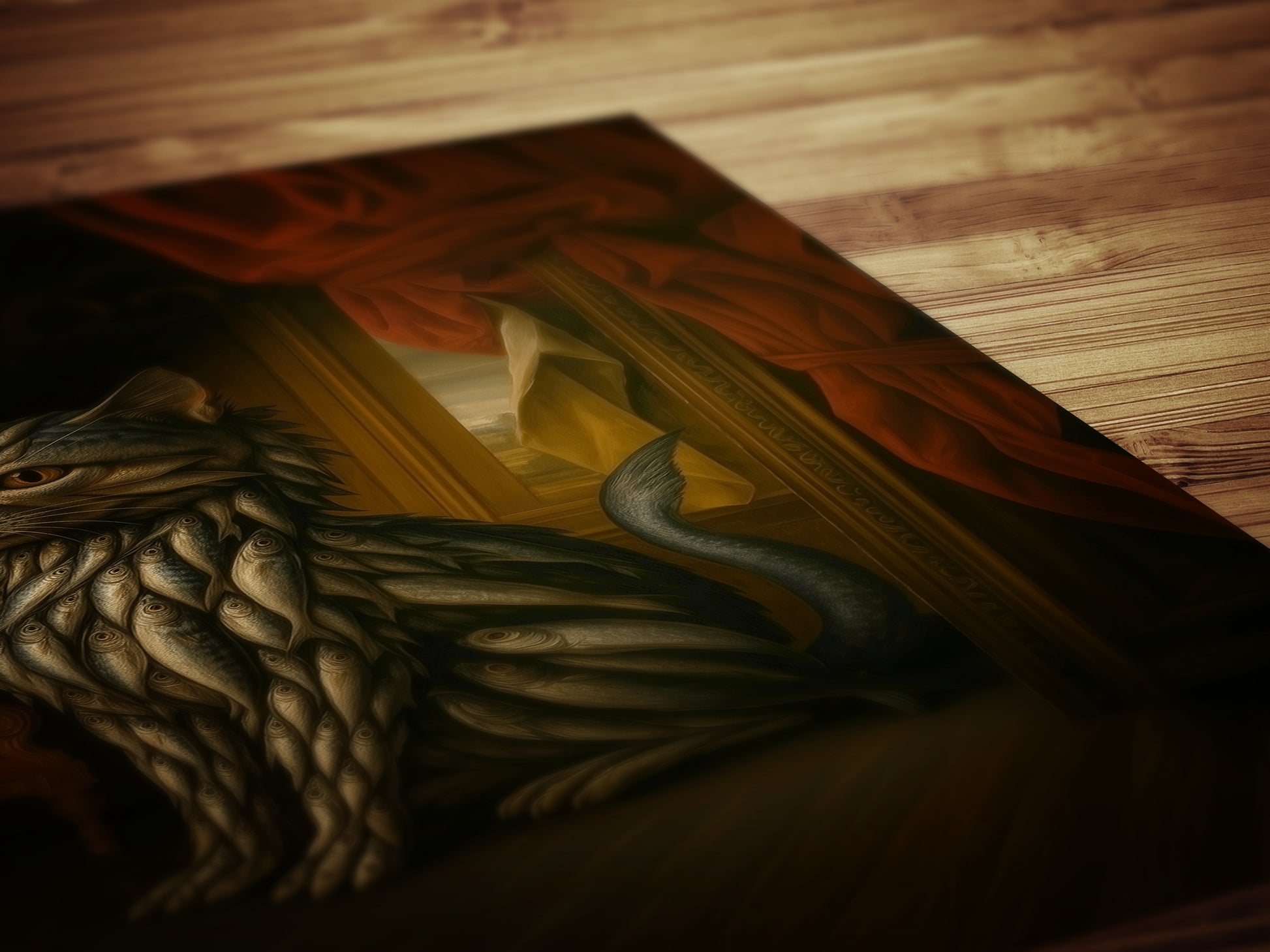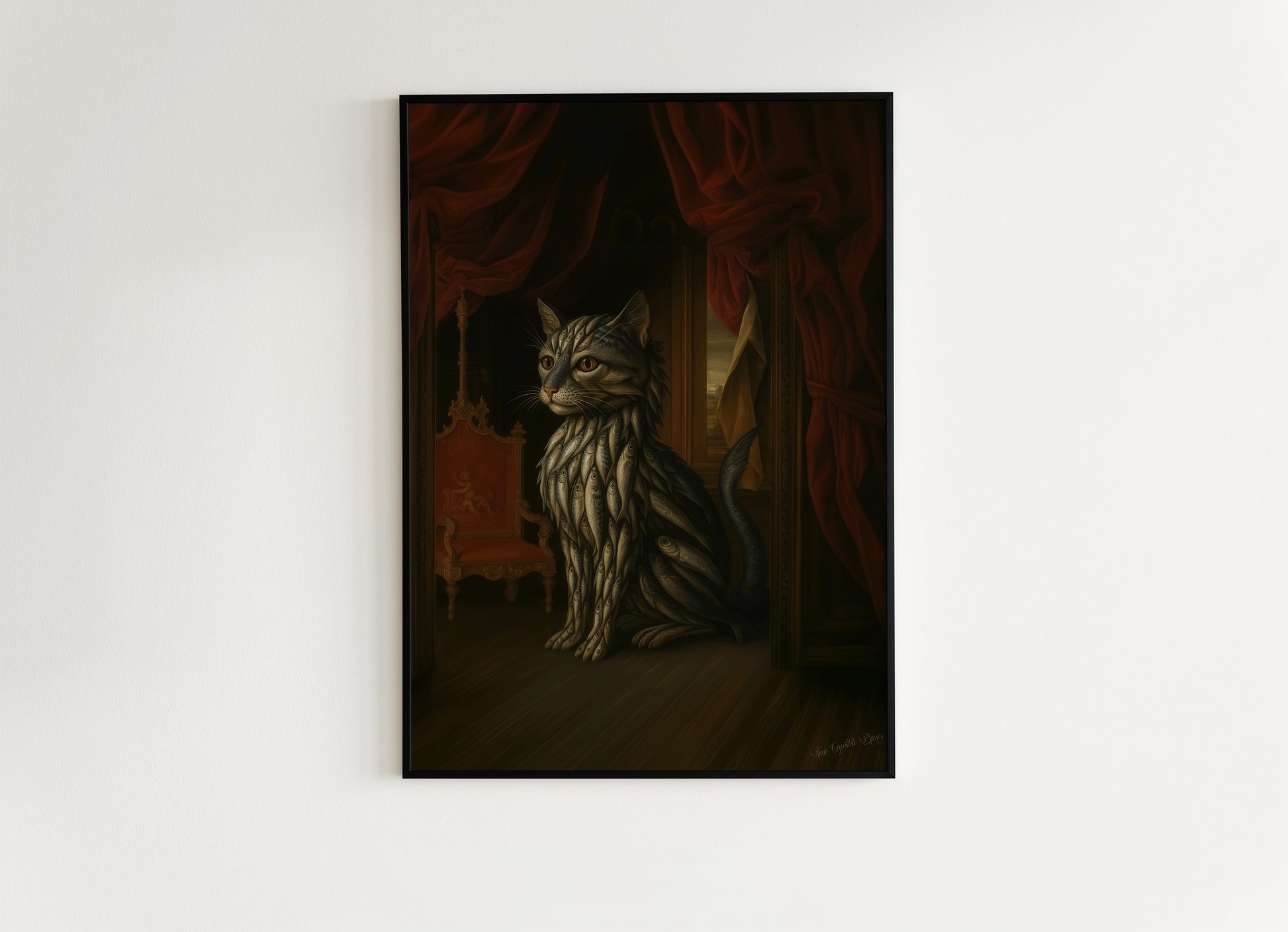 This surreal and bizarre digital painting features a regal cat composed entirely of fish—including sardine, tuna and mackerels. He is the ultimate Catfish! Seated in a grand Victorian-style theater setting. Inspired by Renaissance eccentricity and the imaginative food-based portraits of Giuseppe Arcimboldo, this artwork blends classical oil painting aesthetics with witchy, dreamcore, and humorous undertones. Perfect as a kitchen poster for a quirky chef or as wall decor for animal lovers who enjoy creepy, cute, and funny art with a twist. 🐟🐱