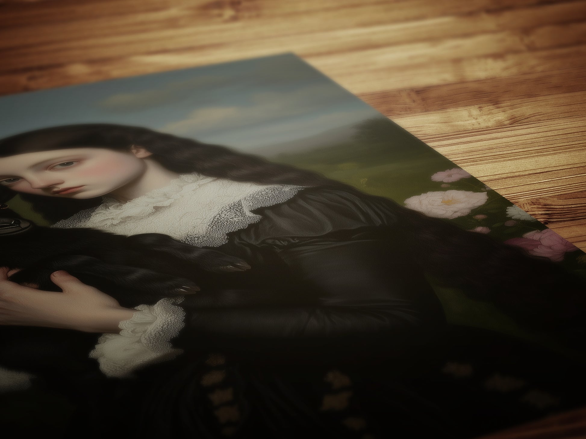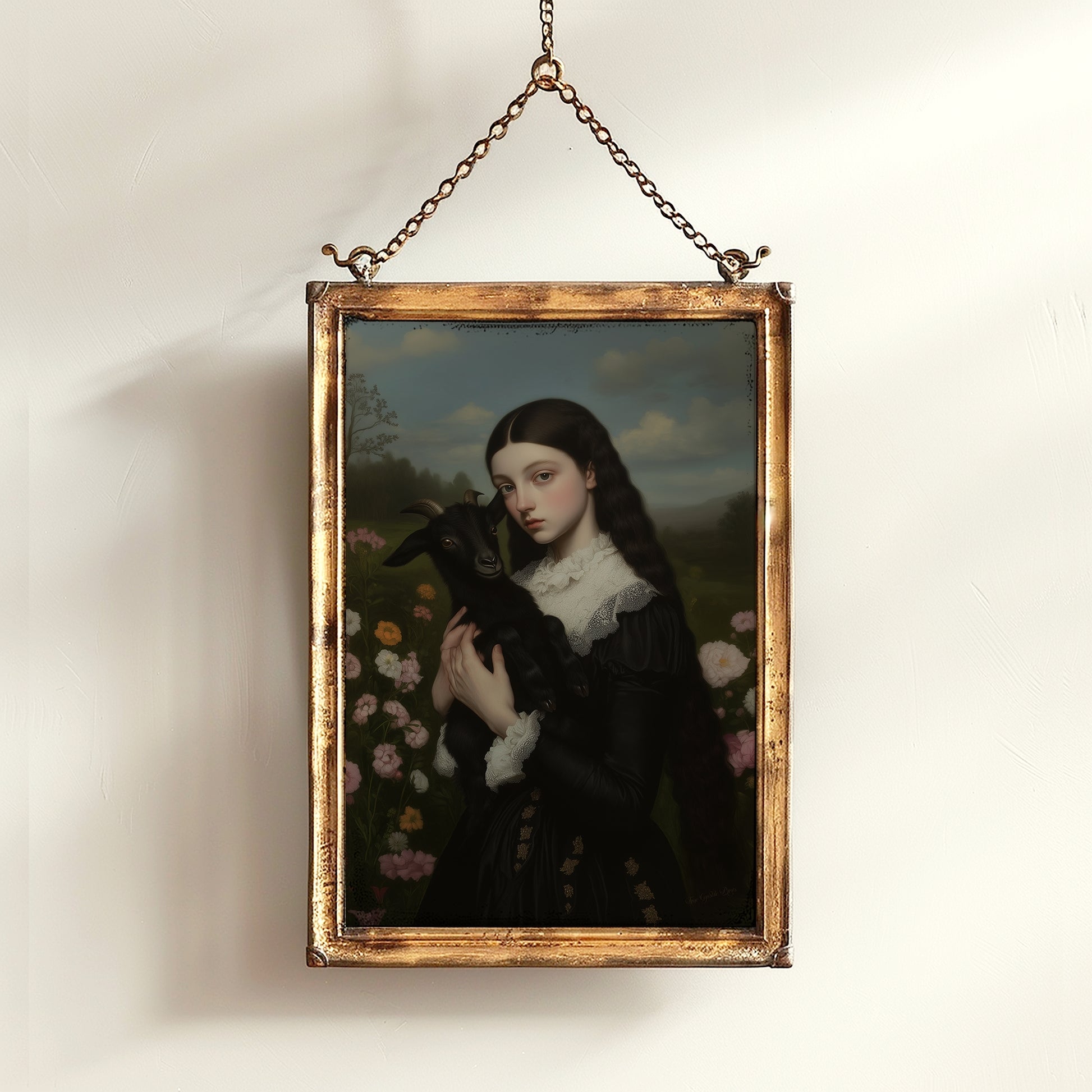 This delicate and mysterious digital artwork features a Victorian-era girl in a black dress, gently holding a small black goat in a blooming meadow. With soft painterly details and a touch of gothic elegance, this piece blends cottagecore, fairycore, fantasy, and whimsigoth aesthetics. The presence of the black goat adds a subtle witchy vibe, evoking imagery of Baphomet or “Black Phillip” from folklore. Perfect as a moody and romantic poster for fans of witchy decor, dark fairy tales, and soft fantasy themes. 🖤🐐🌸