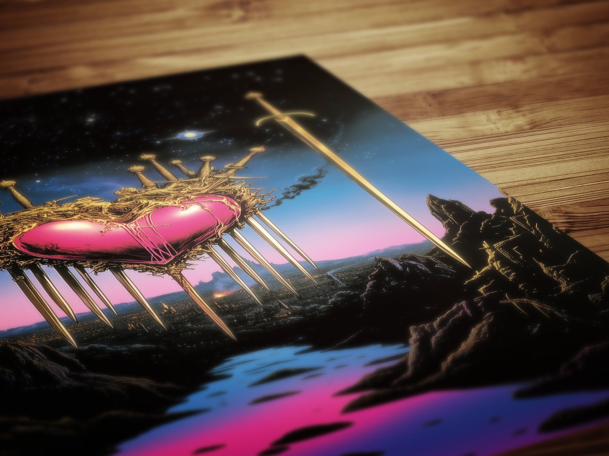 This whimsical surreal artwork features a magical glowing pink sacred heart suspended in a starry sky, pierced by golden swords and crowned with ornate baroque detailing. A river of light flows beneath, guiding the eye through a dreamlike fantasy landscape. Blending dreamcore, gothic romance, and whimsigoth energy, this bold piece is perfect for those who love dramatic symbolism and cosmic emotion 💔✨