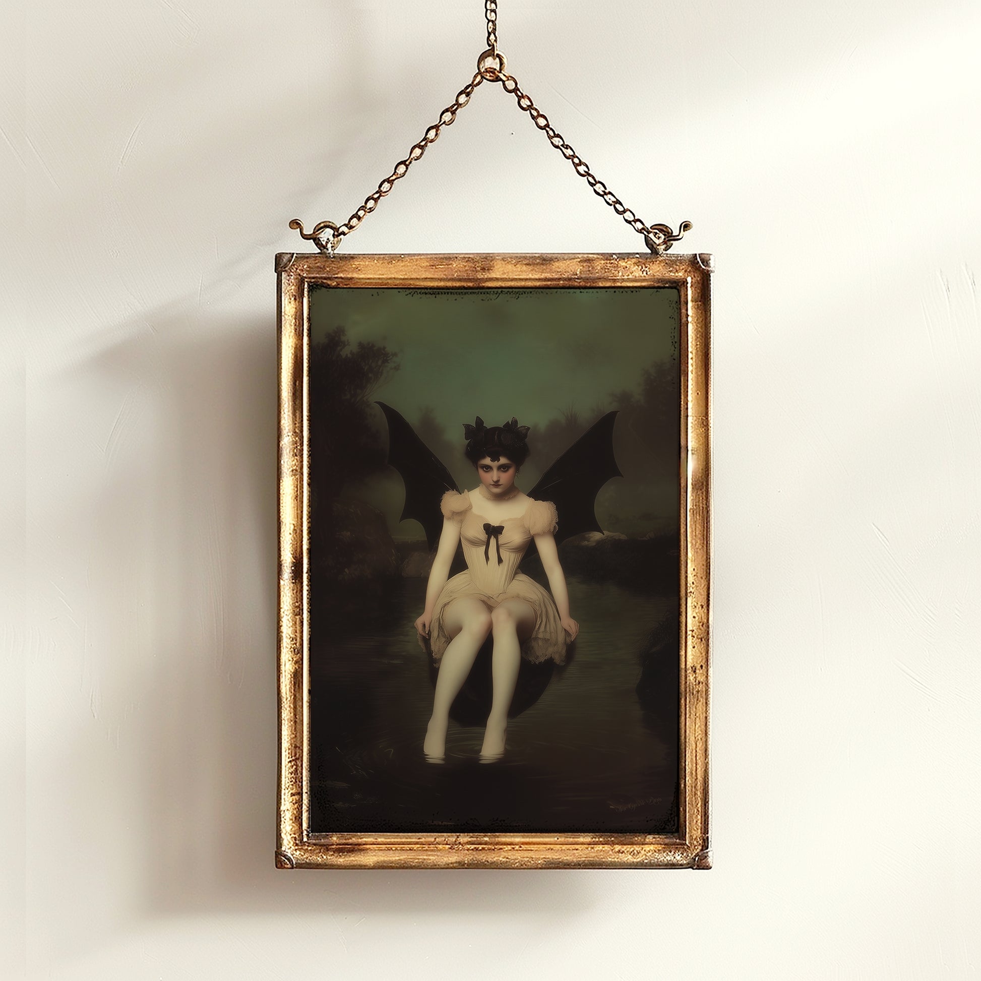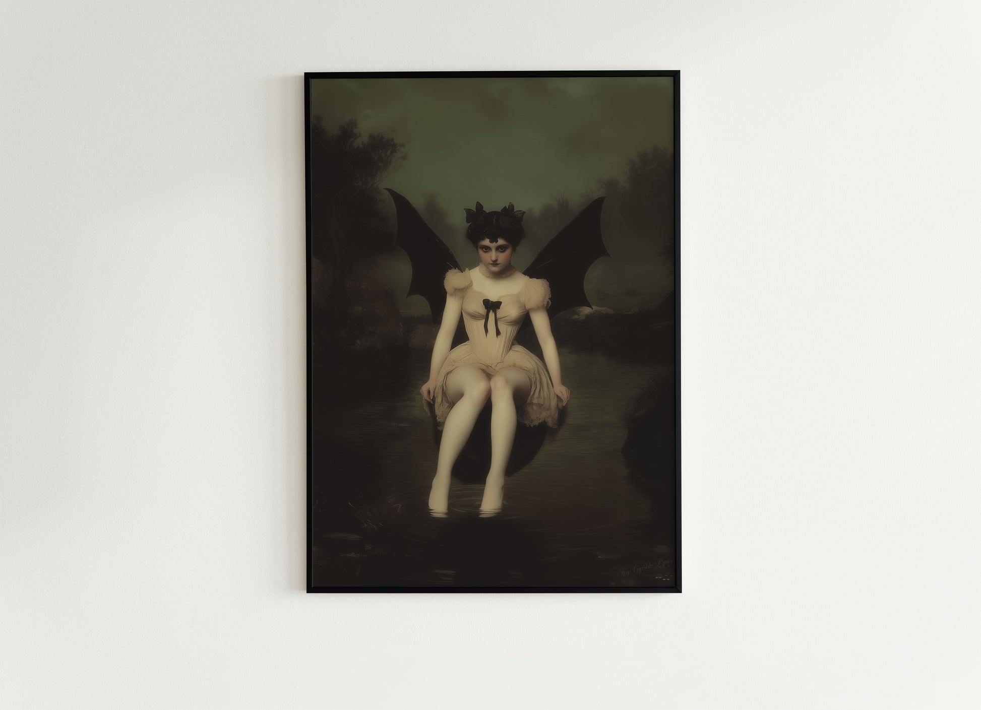 This beautifully haunting painting of Lilith, features a dark queen of demons with bat-like wings, the woman is sitting solemnly by a moonlit stream. Dressed in a soft Victorian-inspired dress with a delicate bow, she embodies a quiet blend of innocence and mystery. The eerie, nature-filled setting and muted tones create the perfect scene for lovers of witchy decor, gothic academia, and Halloween ambiance. A moody and elegant poster ideal for adding a touch of shadowy fantasy to any wall 🌙🦇