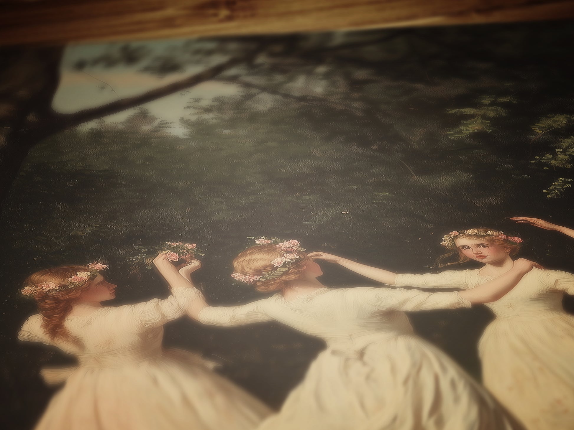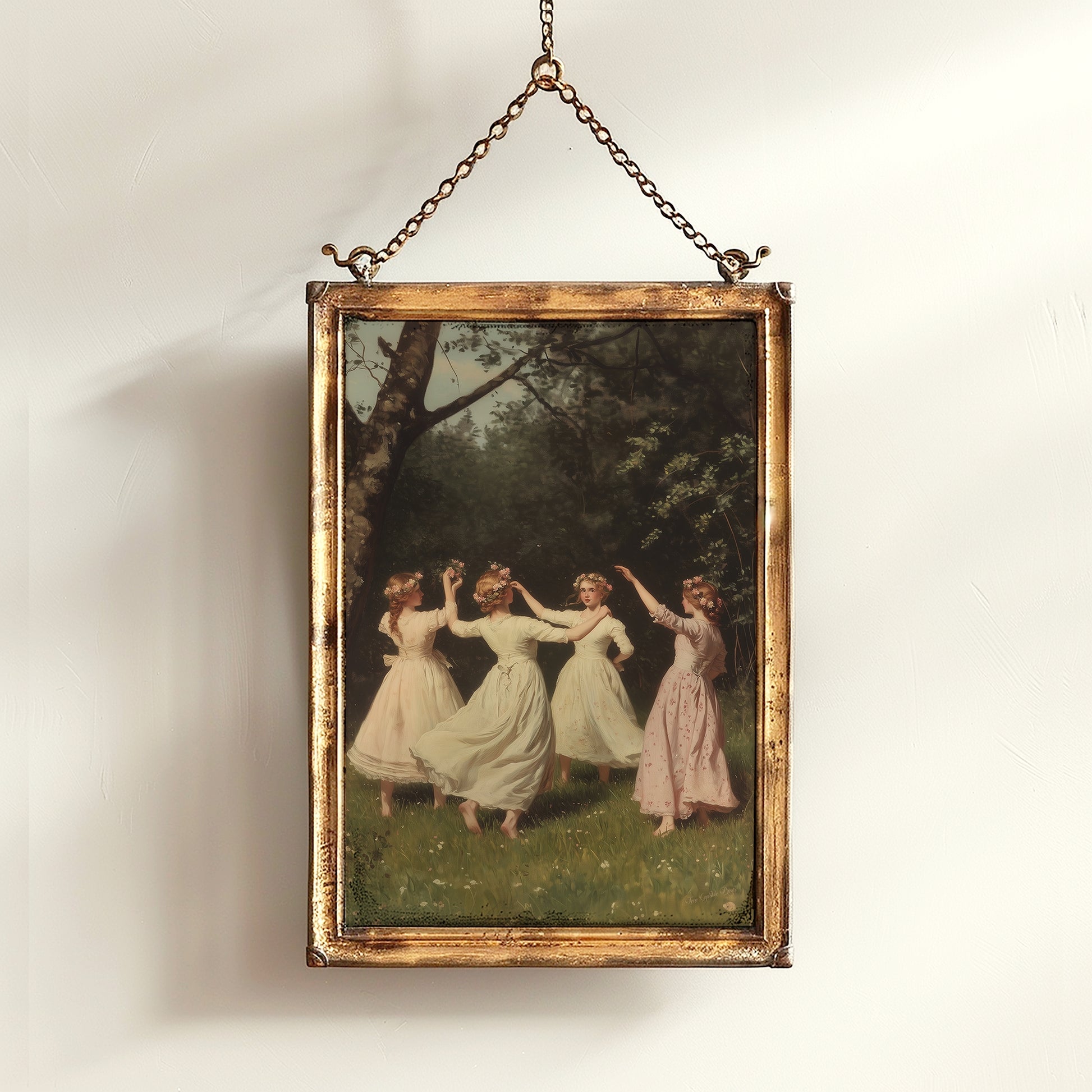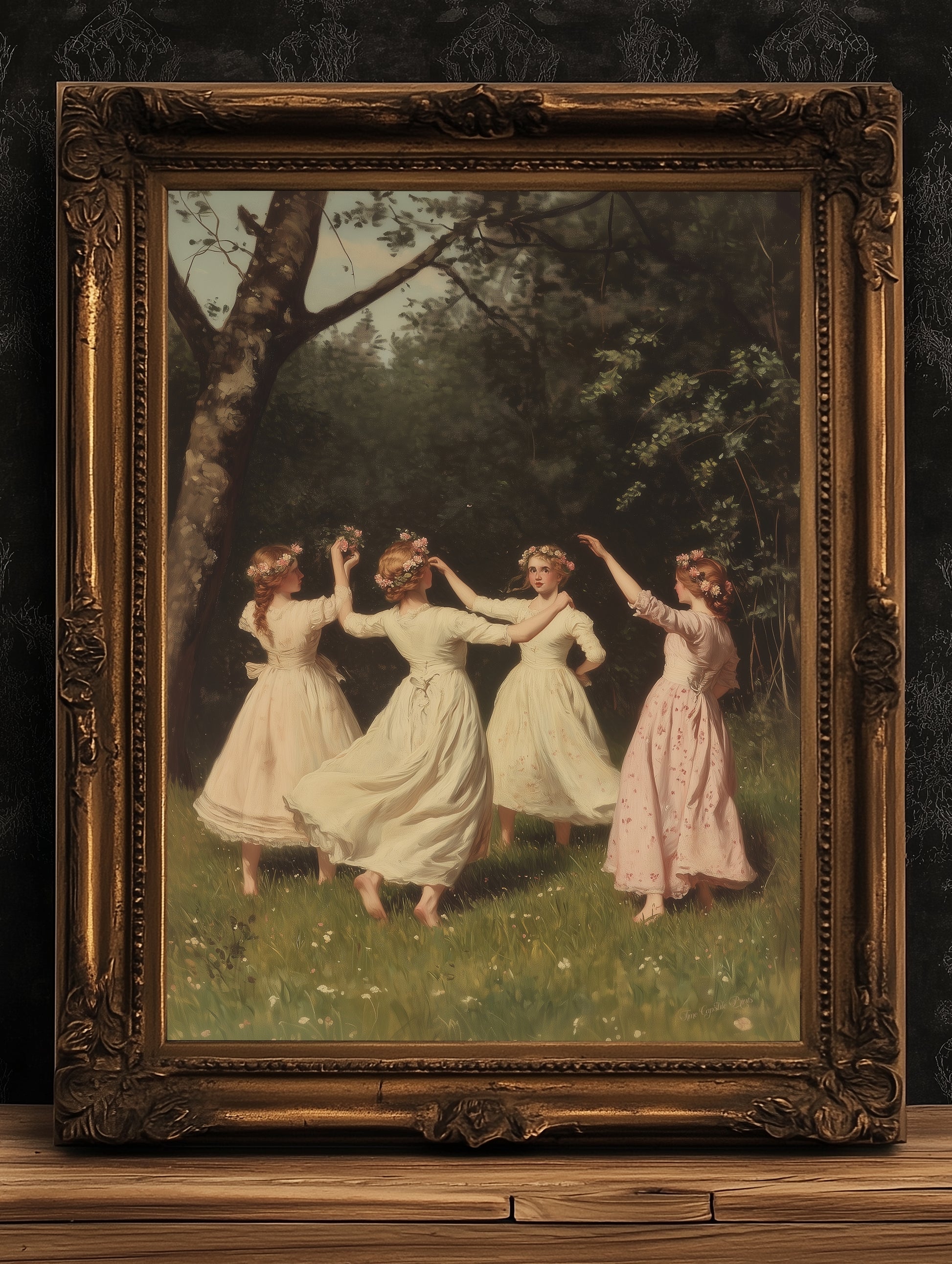 This enchanting artwork features four Victorian girls joyfully dancing in a sun-drenched meadow, dressed in flowing pastel gowns and adorned with delicate flower crowns. Surrounded by trees and soft grass, the scene captures the essence of cottagecore and fairycore aesthetics, while also nodding to pagan ritual, wiccan tradition, and witchy folklore. With its antiqued painterly style and soft detail, this piece feels like a glimpse into an old-world celebration of nature and feminine magic. A perfect gothic-tinged poster for fans of dark academia, romantic occult symbolism, and woodland mystery 🌸🌿