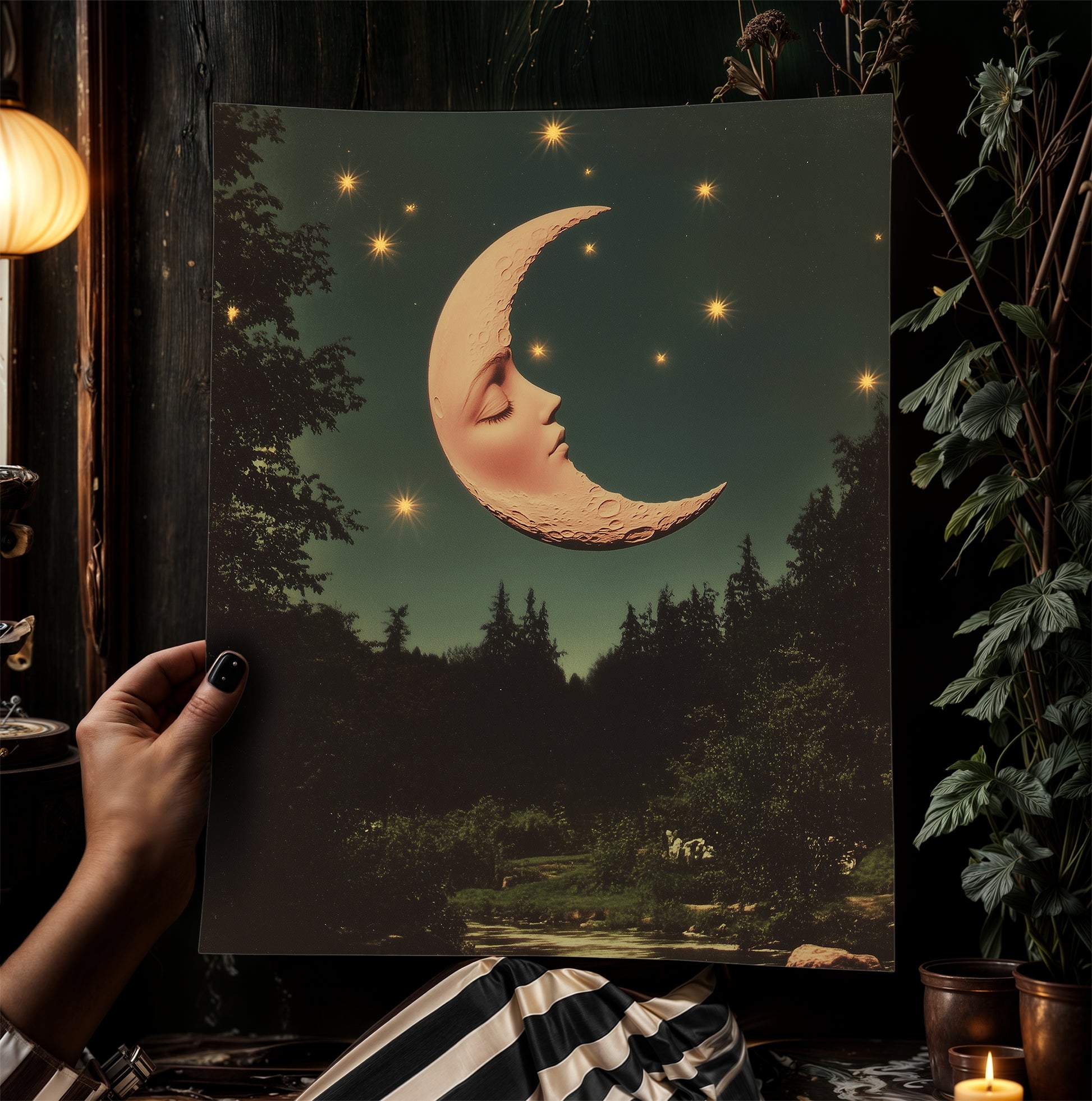 This dreamy poster features a crescent moon with a serene, sleeping face suspended above a quiet forest under a starlit sky. With glowing golden stars and a deep green night backdrop, this vintage-style moon art captures the essence of dreamcore, whimsy, and gentle mystery. Perfect for bedrooms, meditation corners, or as a magical gift for moon lovers and star gazers 🌙✨🌲