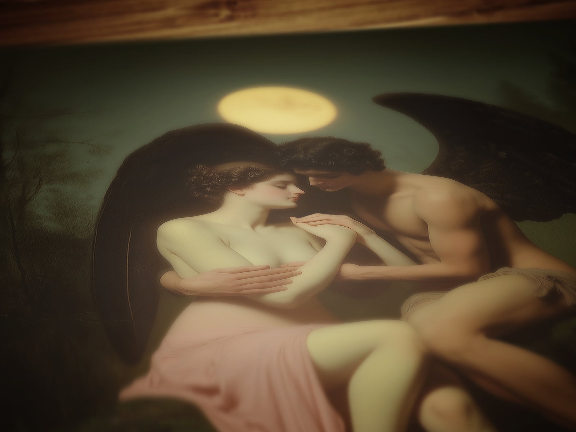 🖤 Enchanting portrayal of a fallen angel and nude mortal lover in moonlit passion