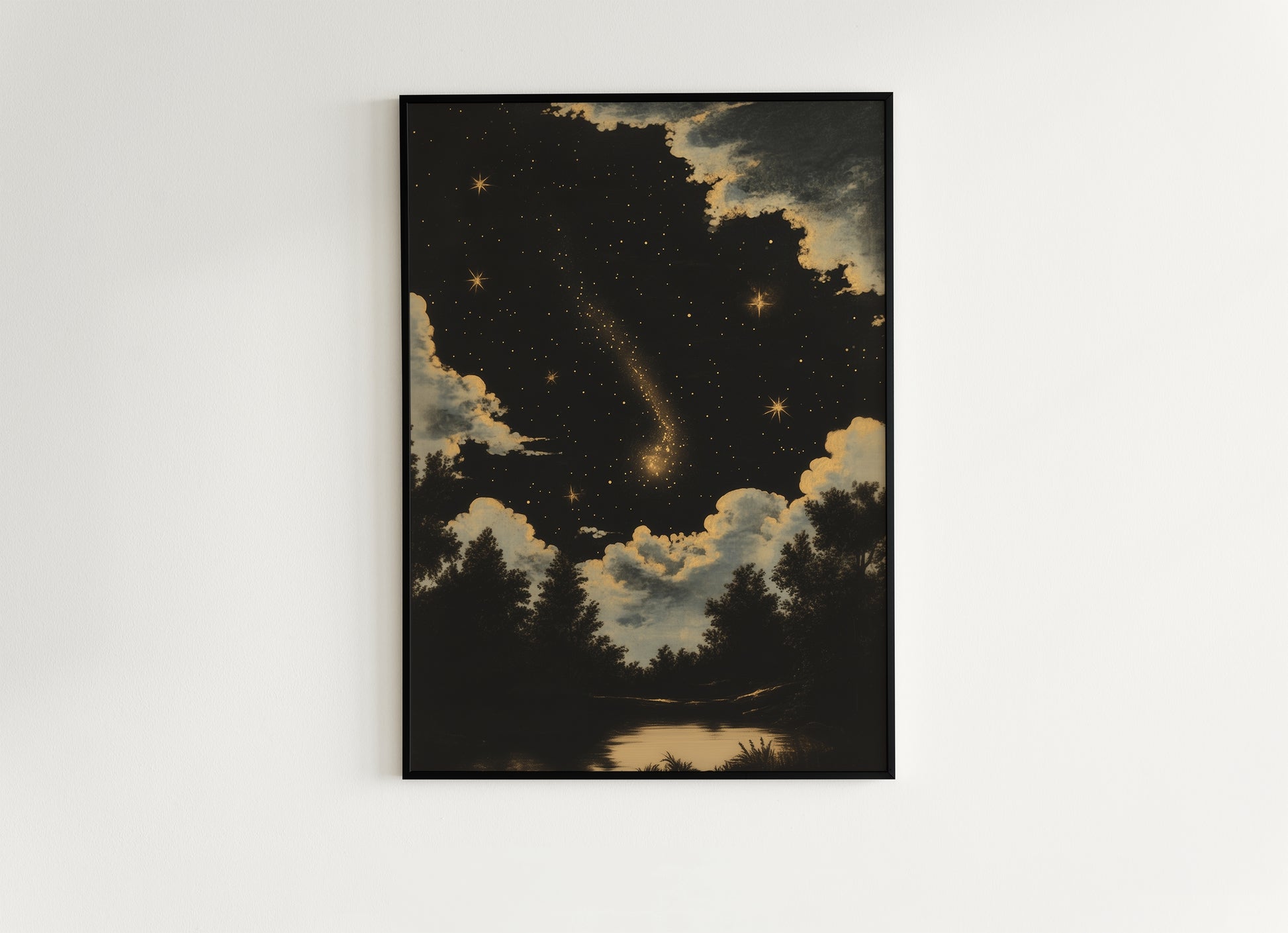 This captivating vintage-style artwork captures a starry night sky bursting through clouds above a tranquil forest. A golden trail of stars forms a dreamy celestial pattern, glowing softly above a reflective riverbank. With its whimsical composition and antique-inspired brushwork, this piece blends the mystery of the cosmos with the stillness of nature Perfect for lovers of crescent moon poster design, whimsigoth moon art, and witchy moon decor, this print also evokes the charm of gothic moon painting and dark academia moon aesthetics. Add a touch of starry night decor and vintage sky print elegance to your space with this mystical moon phase artwork. A beautiful blend of witch painting, vintage witch art, moon phase wall art, and crescent moon print style that radiates wonder and enchantment. 🌌✨🌲