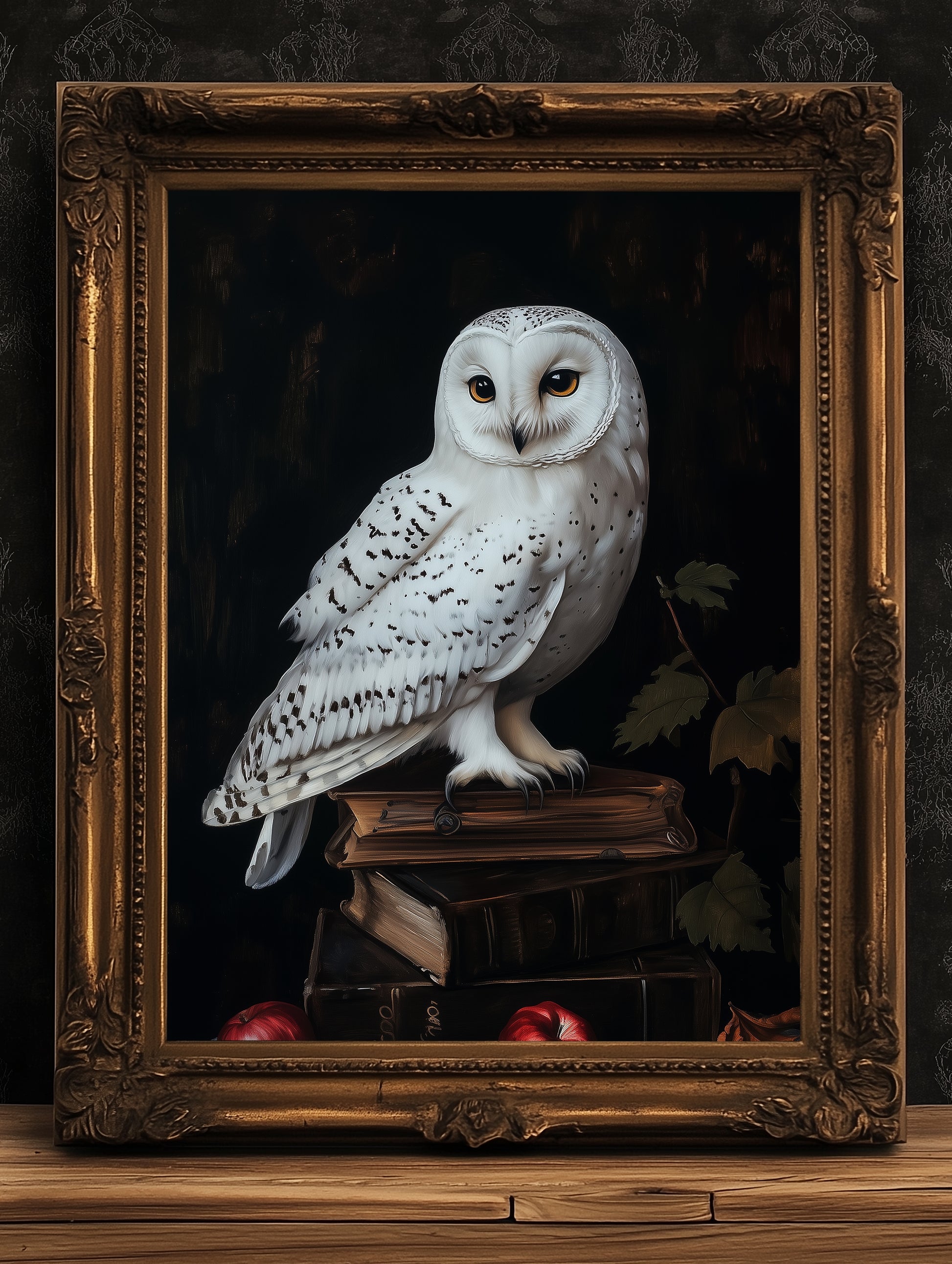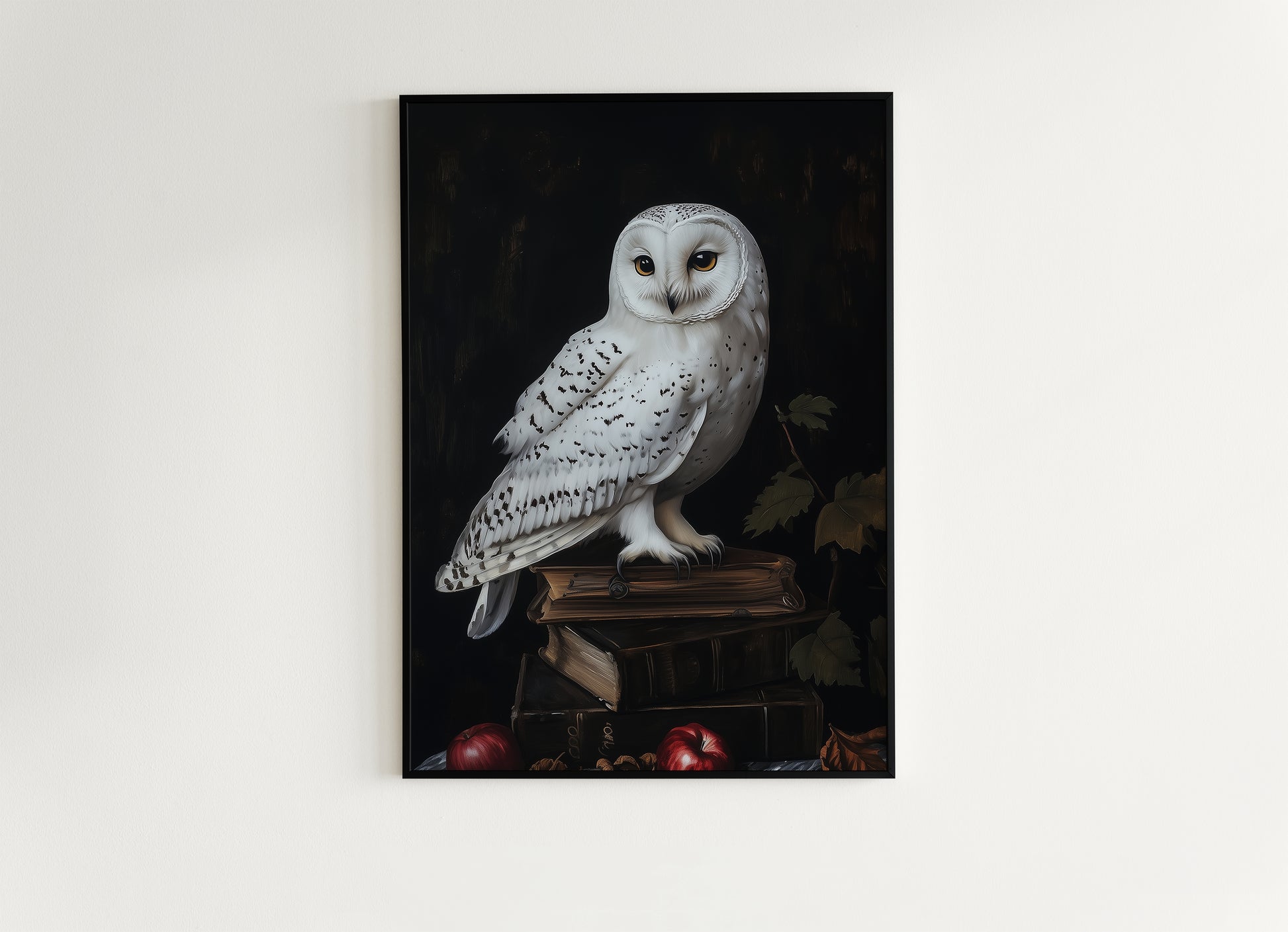 This elegant painting features a majestic snowy owl perched atop a stack of antique books, captured in rich painterly detail against a dark, moody background. With its intense golden eyes and soft white feathers, the owl brings wisdom and mystique to your decor. A perfect blend of dark academia, gothic animal and nature themes, and magical whimsigoth cottagecore charm 🦉📚✨