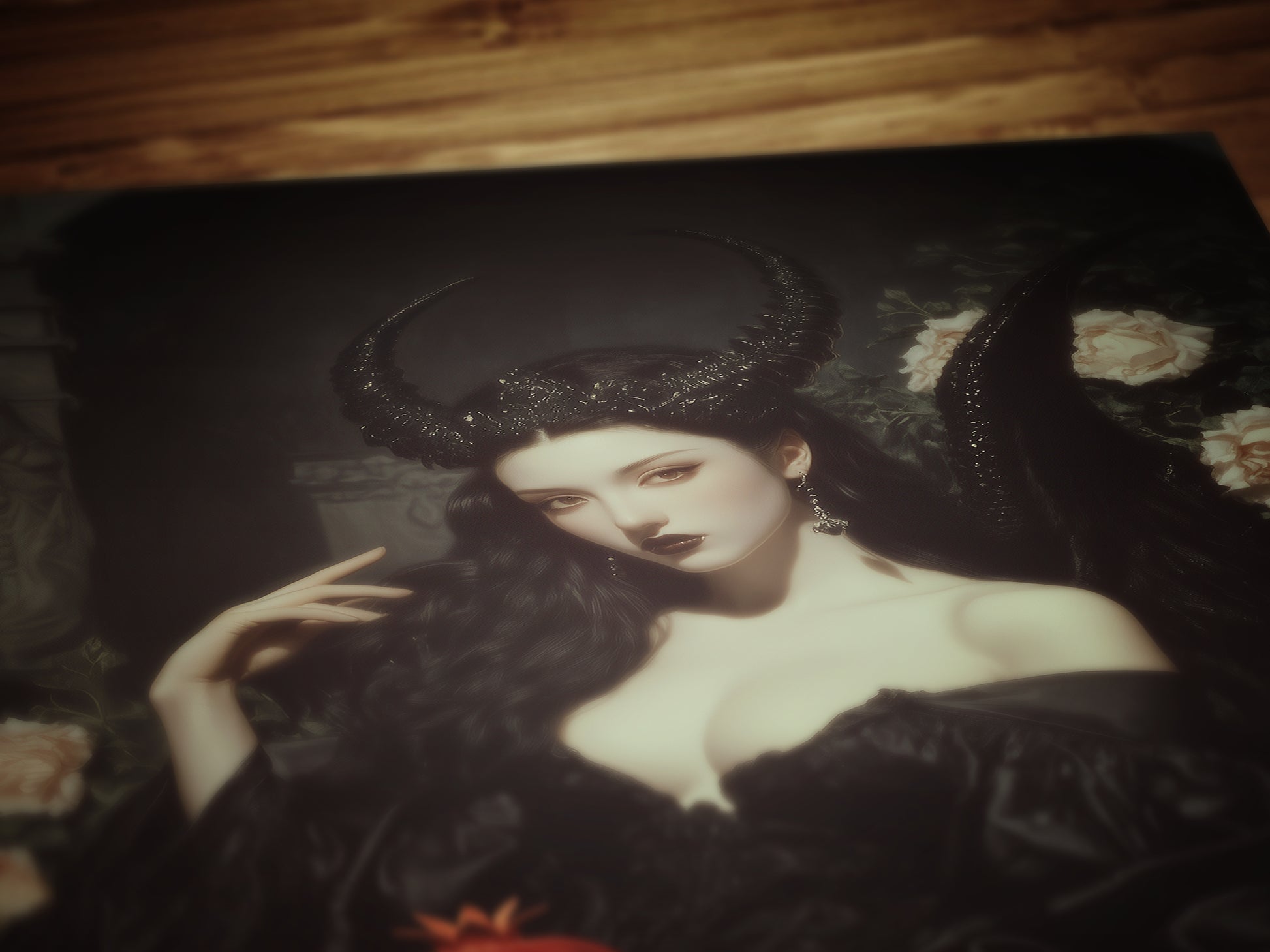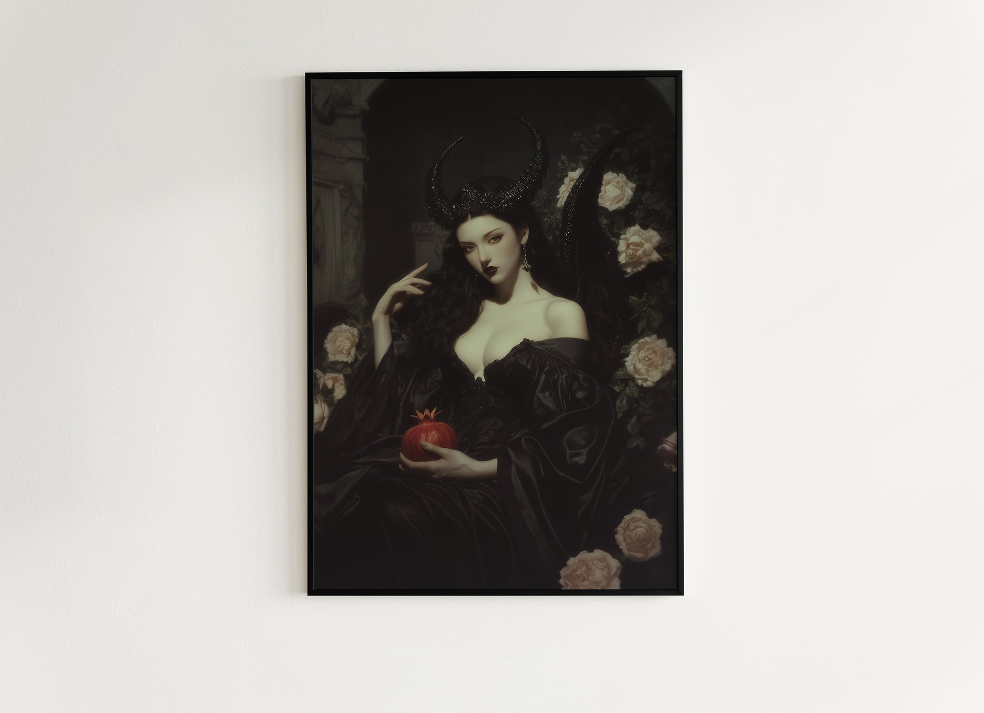 This hauntingly beautiful poster captures Persephone, greek Queen goddess of the Underworld, in a moment of dark elegance and quiet power. Draped in flowing black satin and crowned with twisted horns, she clutches a pomegranate—the symbol of her fate. With moody florals, gothic tones, and a regal, divine feminine witchy aura, this piece channels the deep romance and myth of ancient lore and olympian gods. Perfect for dark academia lovers, mythology enthusiasts, and those drawn to the magic of transformation and duality 🖤🌸🍷