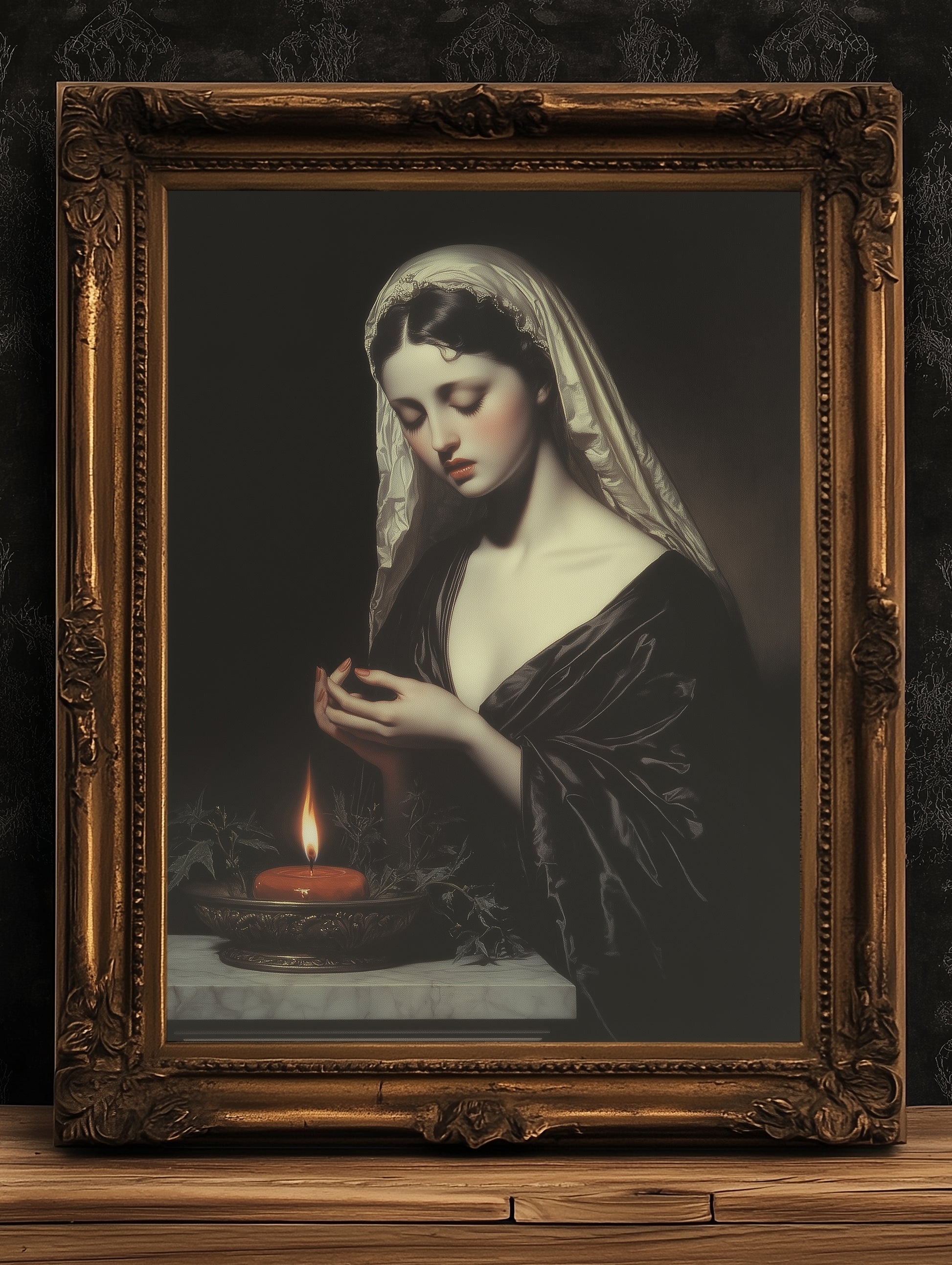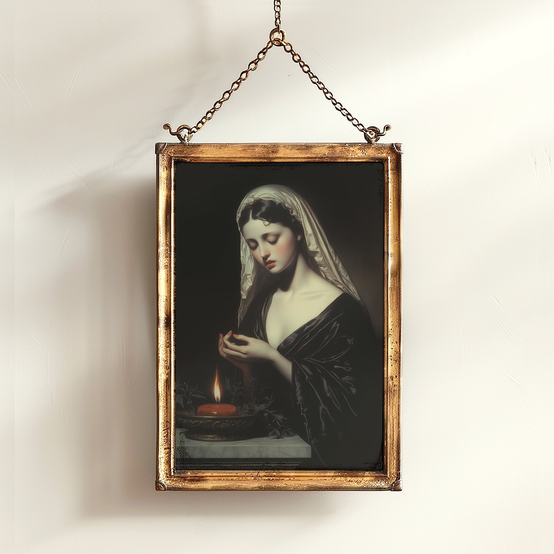 This serene and soulful poster depicts Hestia, the Greek goddess of the hearth, home, and sacred flame. With downcast eyes and a gentle presence, she tends to a glowing candle, embodying peace, warmth, and divine protection of the olympian gods. Painted in rich, dark tones with vintage oil style brushwork, this elegant portrait brings ancient mythology romance into a modern mystical space. Perfect for those who cherish quiet power, feminine energy, and the comforting glow of ritual and stillness 🕯️🏛️✨