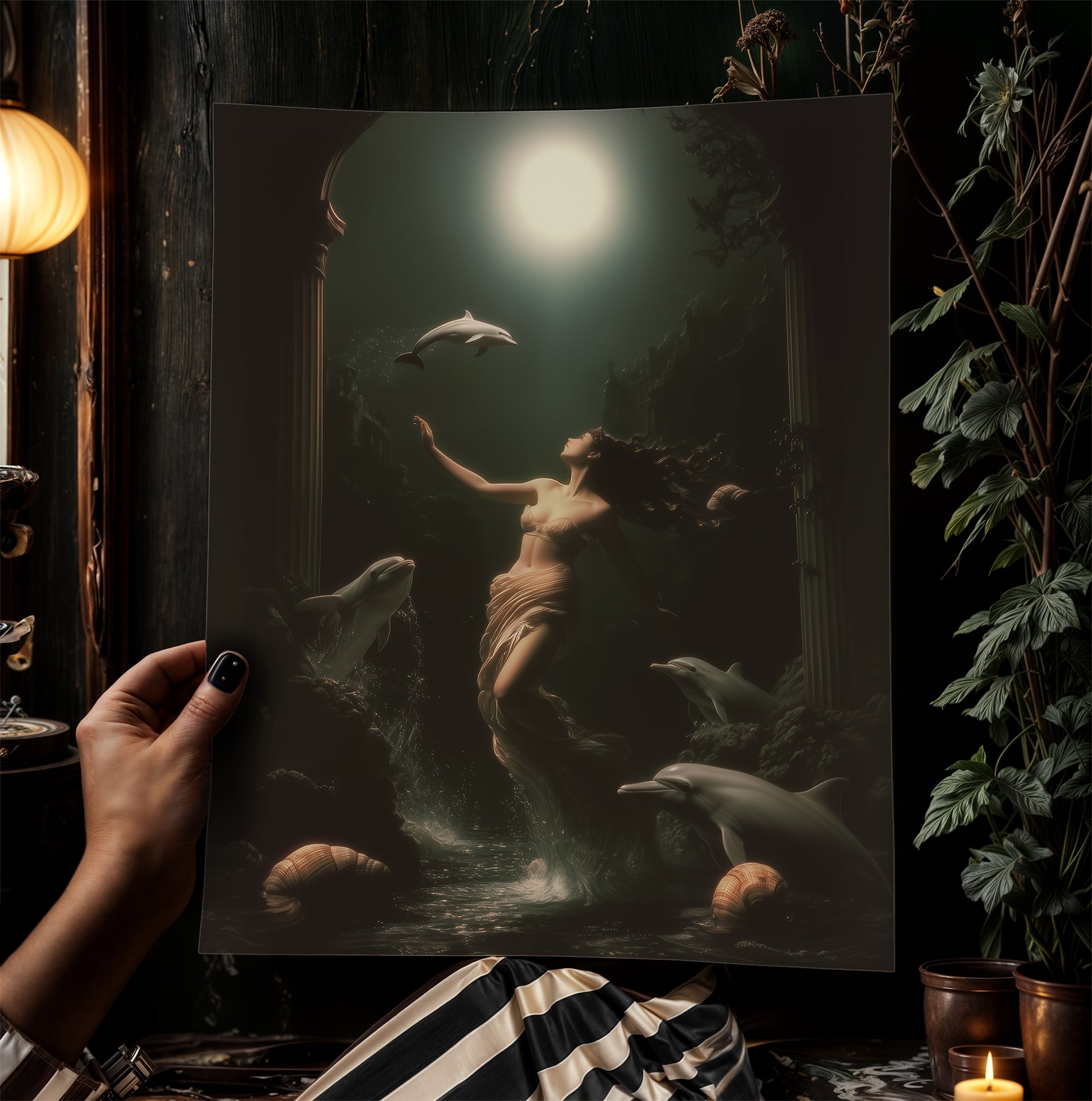 Goddess Amphitrite Art Print, Dark Ocean Ancient Greek Mythology Poster, Whimsigoth Fantasy Sea Nymph Decor, Moonlit Dolphin Painting