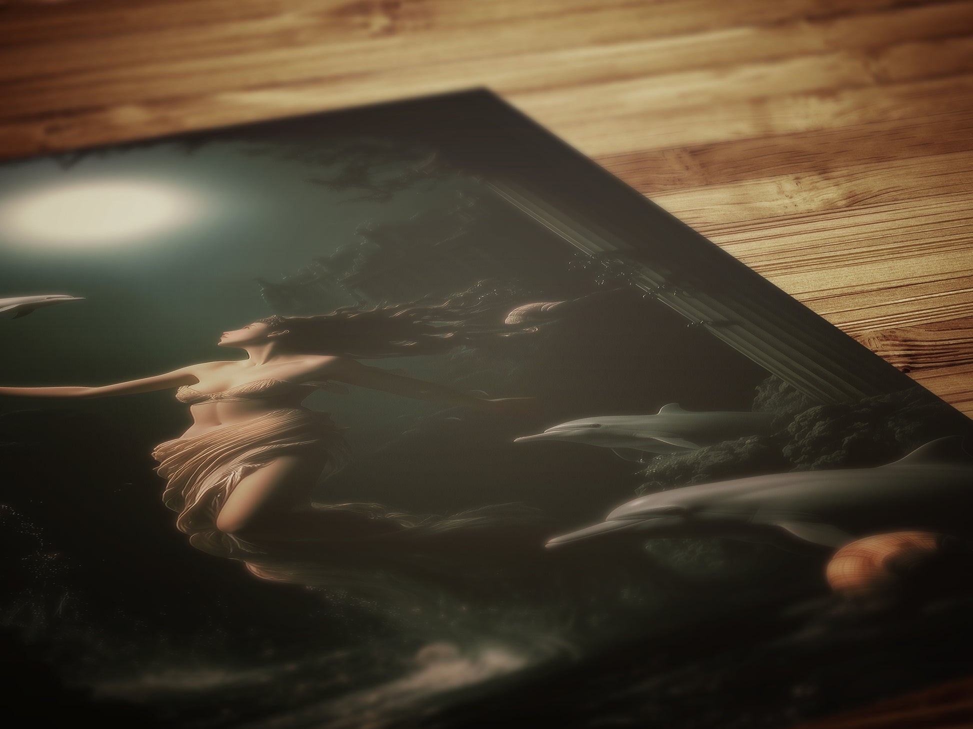 This breathtaking poster features Amphitrite, the ancient Greek goddess and queen of the sea, rising gracefully beneath a glowing moon surrounded by dolphins and oceanic ruins. Draped in flowing fabric and bathed in ethereal light, she exudes romance, divine feminine power, mystery, and fluid beauty. With its rich shadows, classical elegance of the olympian gods , and fantastical marine setting, this piece is a perfect homage to divine femininity and oceanic mythology 🌊🐬🌕