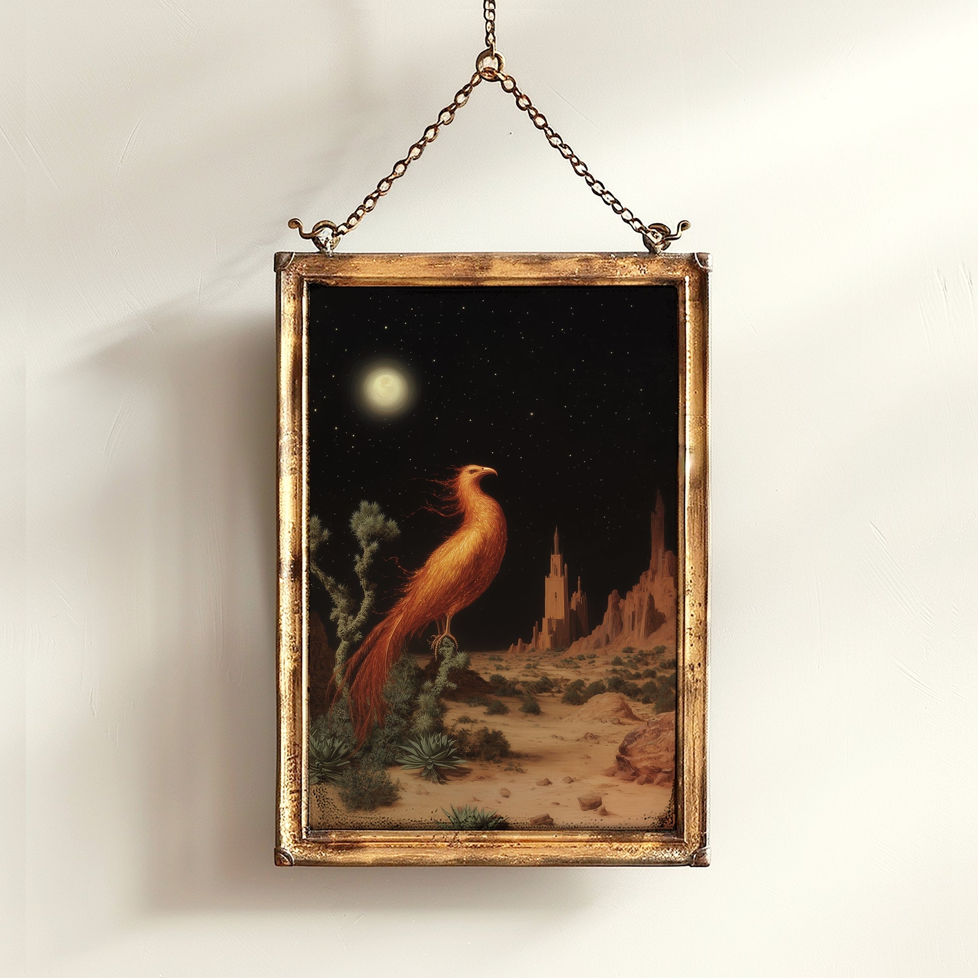 Phoenix Desert Fantasy Poster, Mythical Creature Firebird Night Sky Art, Cottagecore Mythology Whimsigoth Decor, Medieval Wall Art