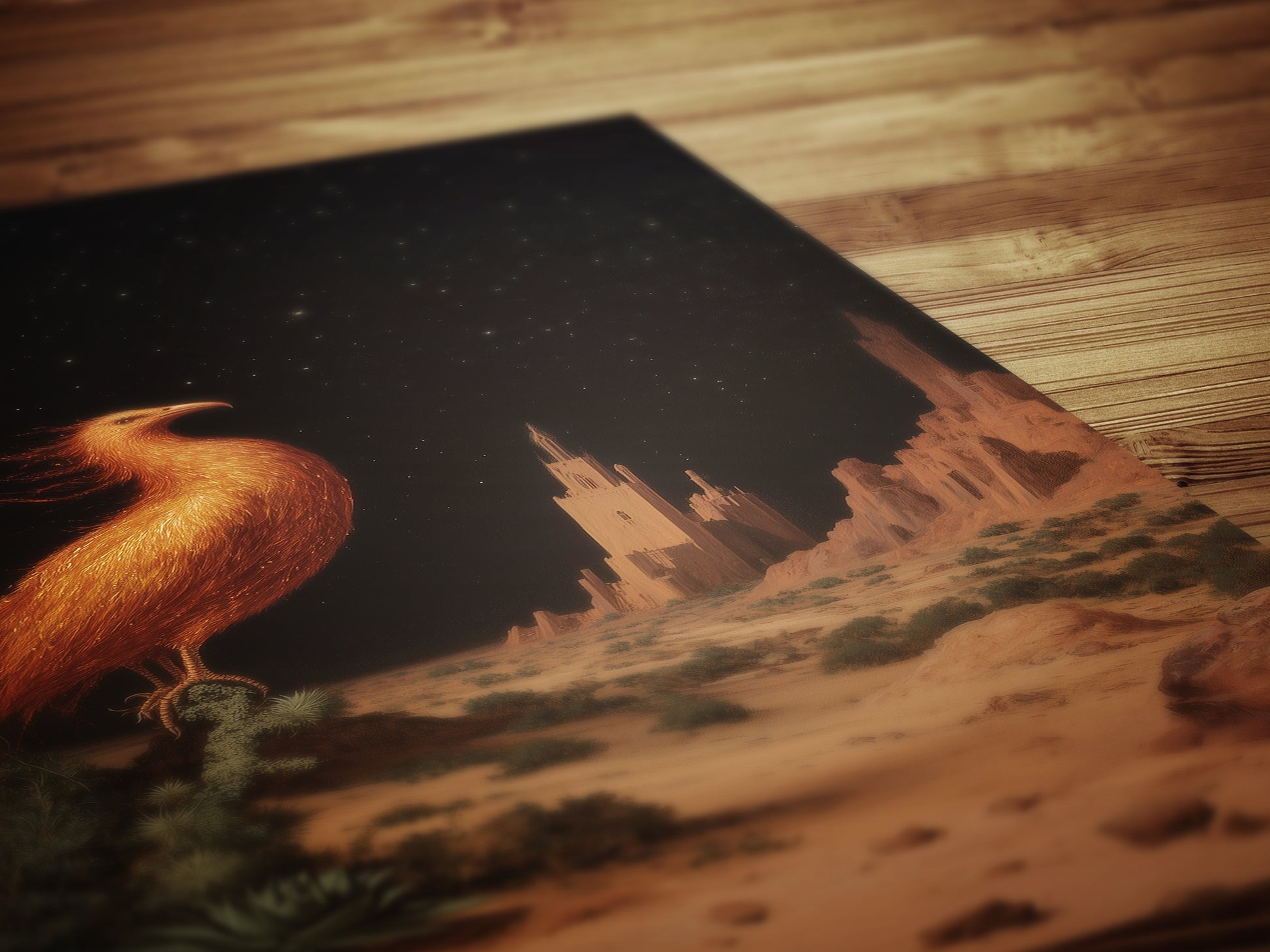 🔥 Features a glowing phoenix resting in a surreal desert under a starry sky