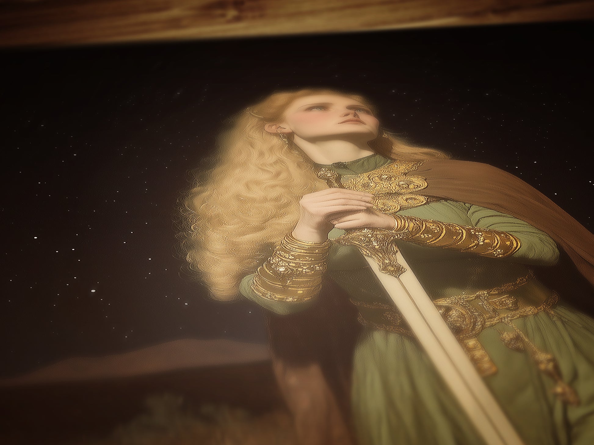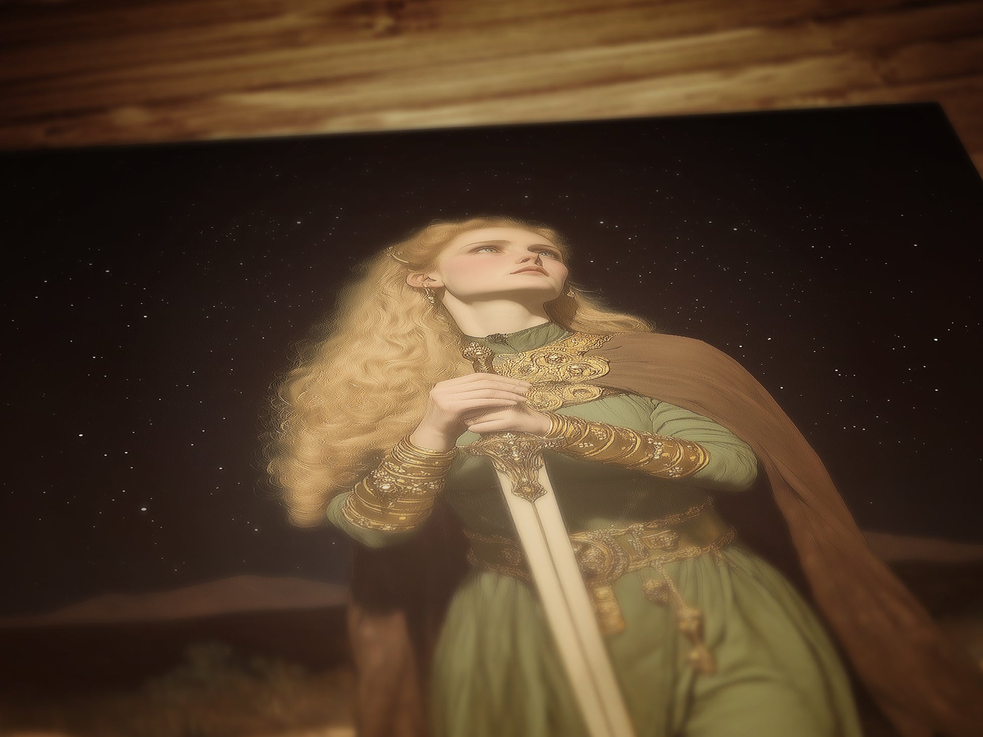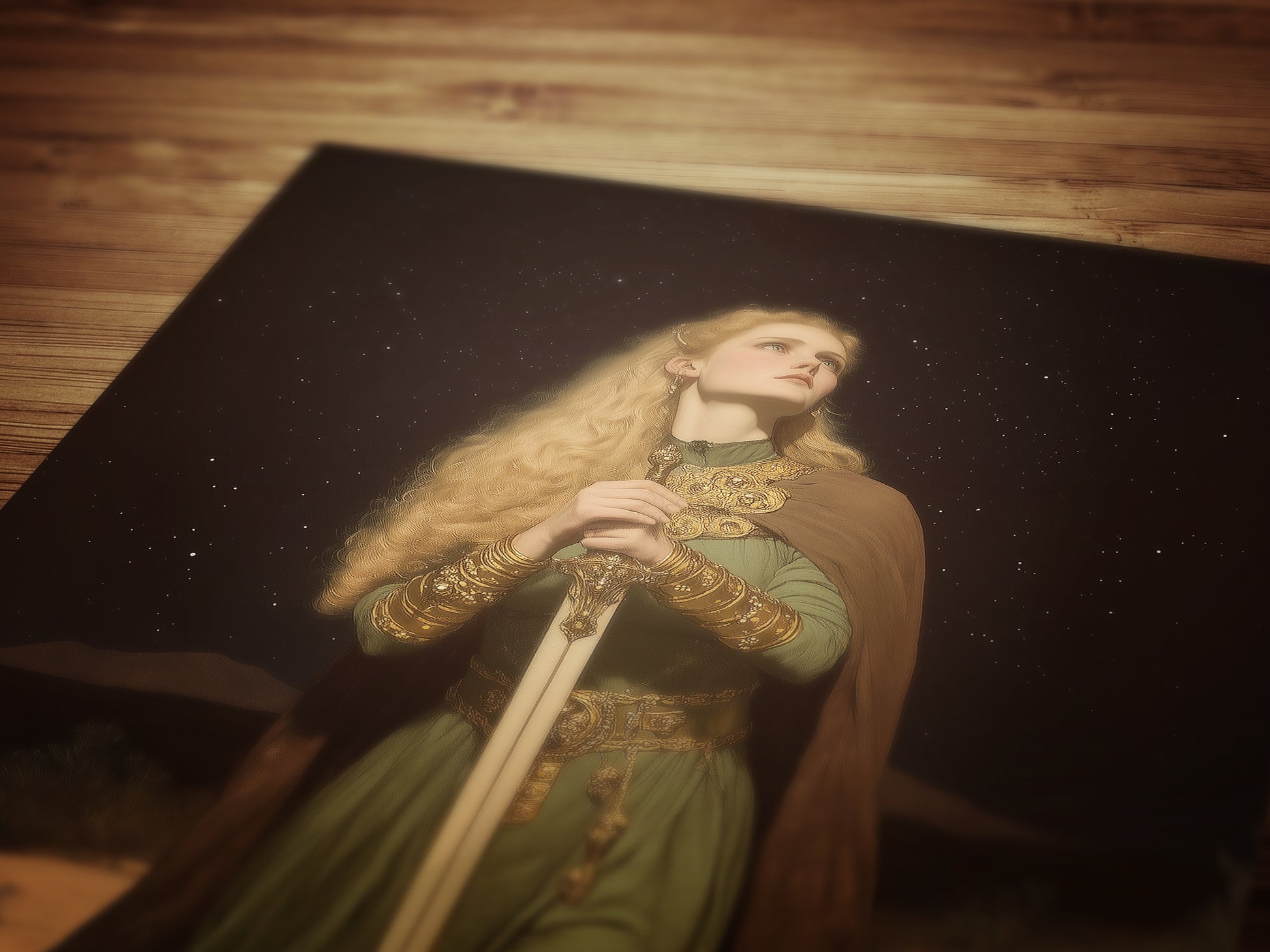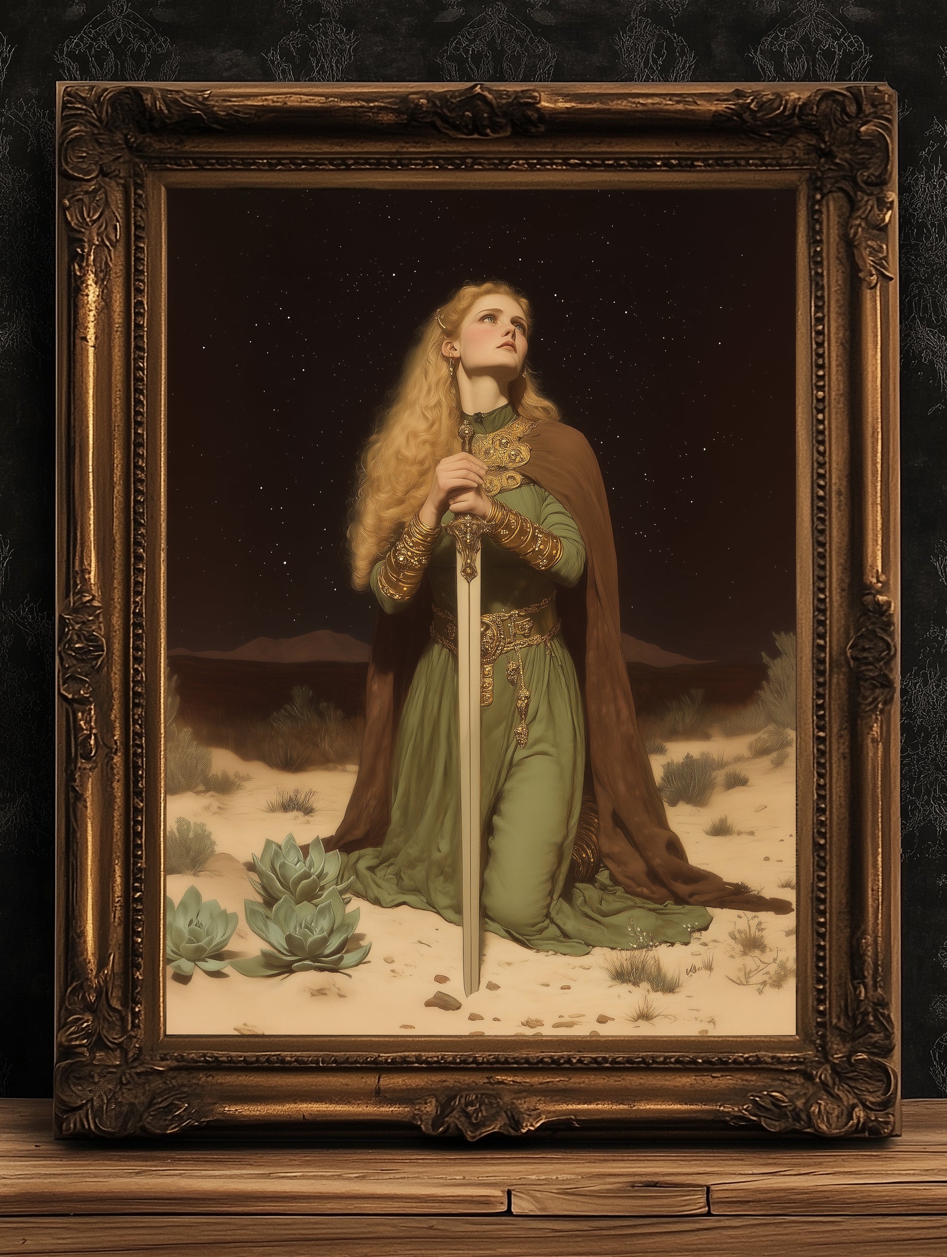 This powerful fantasy poster portrays a golden-haired warrior maiden kneeling in a quiet desert landscape, solemnly taking a desert vow under a canopy of stars. Clad in intricate armor and emerald robes, she clasps a sword like a sacred oath, symbolizing strength, devotion, and ancient honor π΅βοΈπ Perfect for castlecore dreamers, fantasy lovers, and admirers of medieval romance.