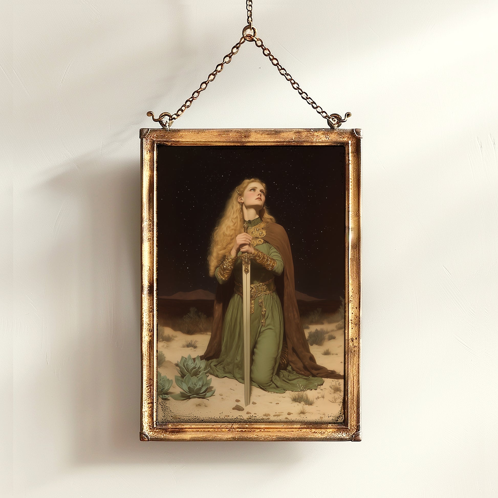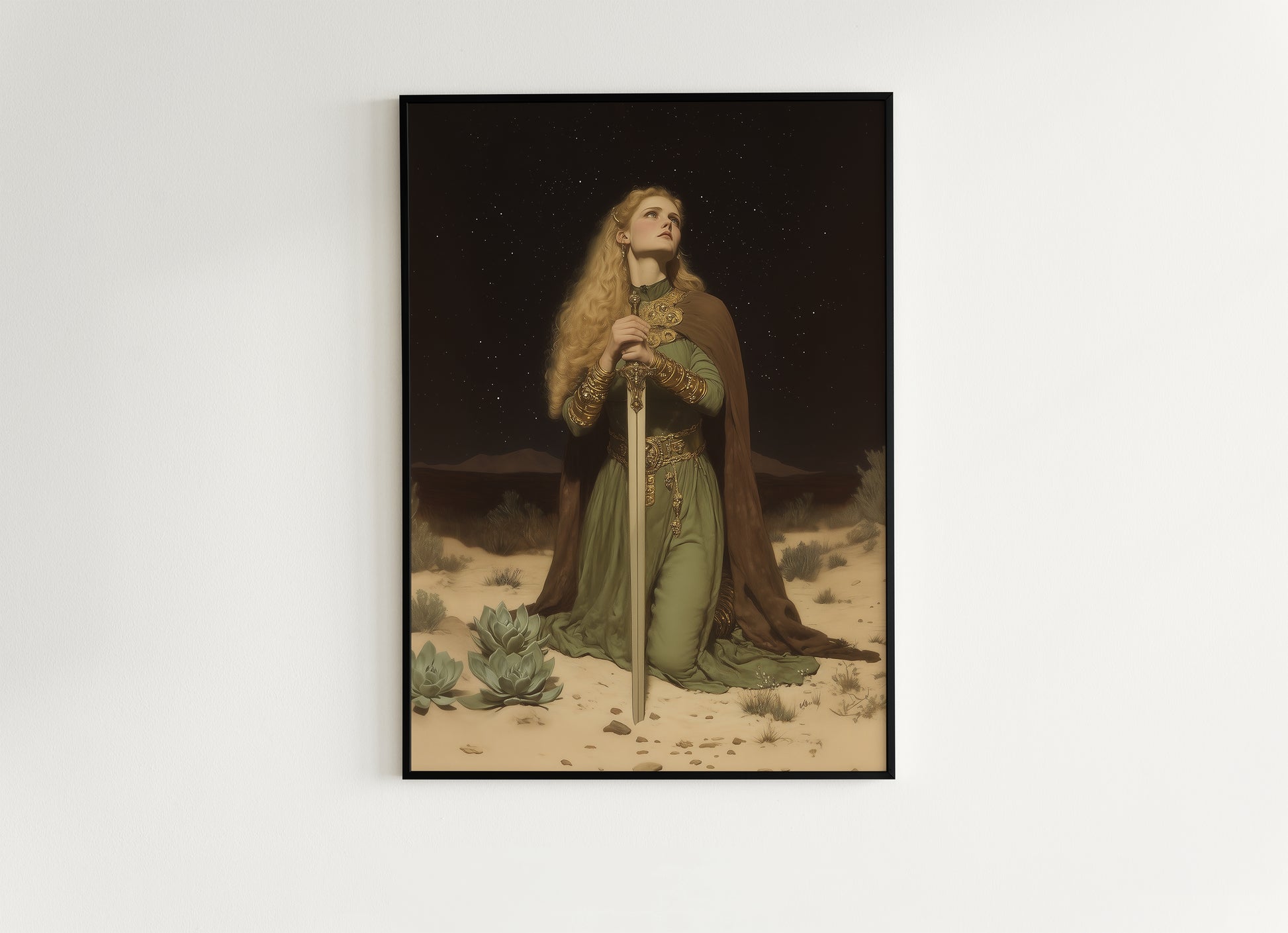 Desert Vow Poster, Knight Oath Wall Art, Whimsigoth Decor, Dark Fantasy Warrior Woman Print, Gothic Medieval Decor, Dark Academia Artwork