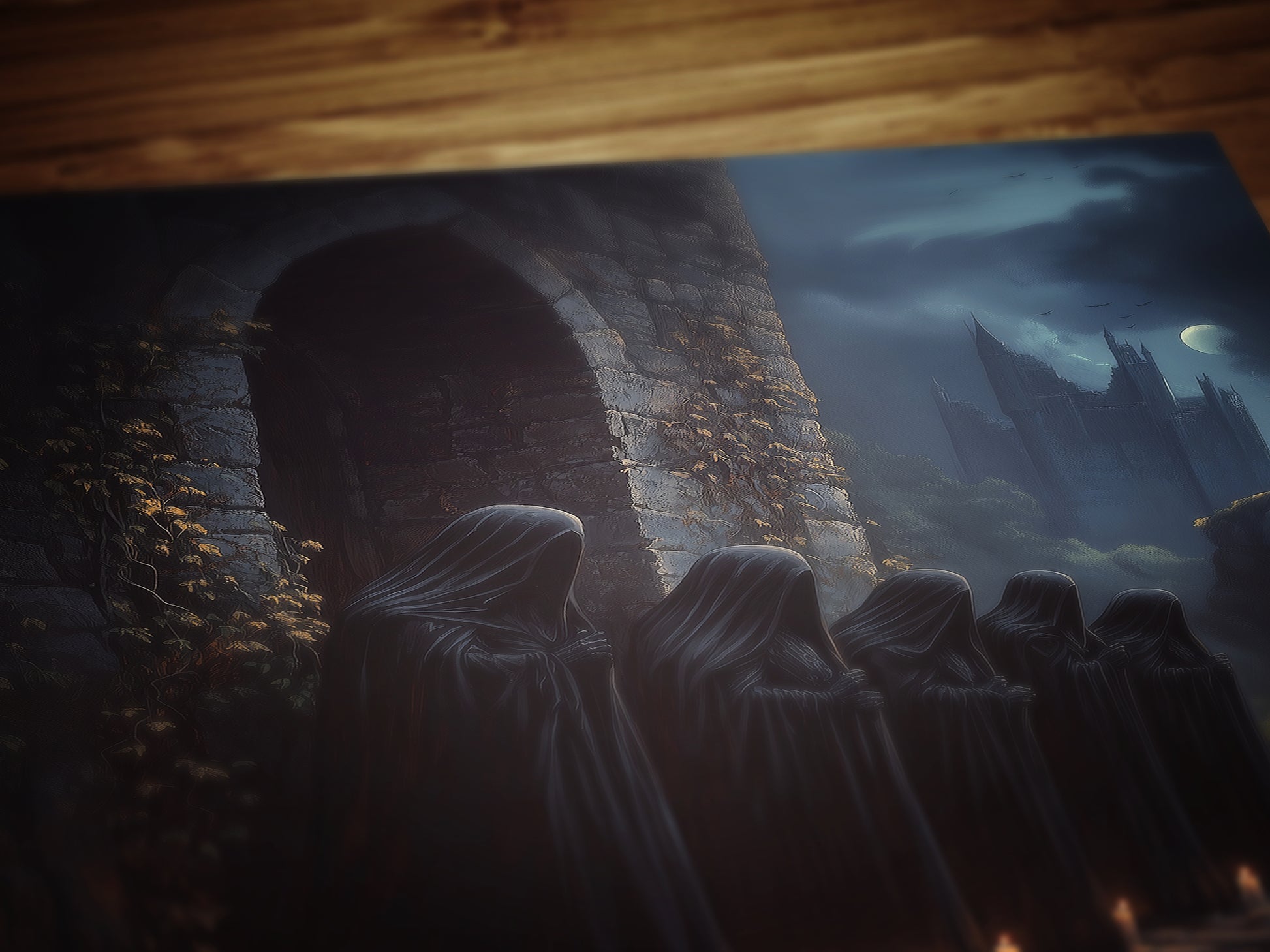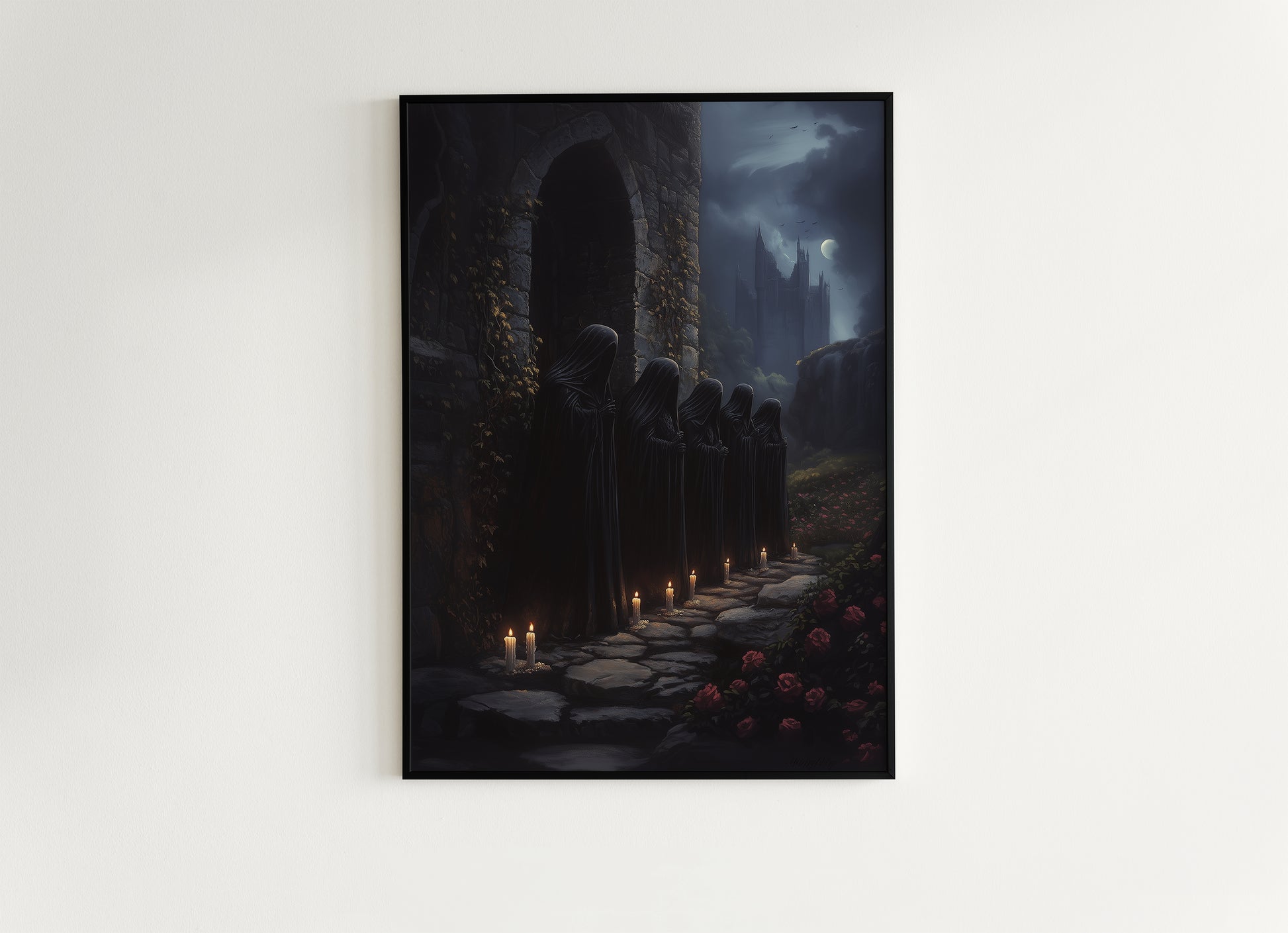 This haunting gothic fantasy wall art poster features a line of hooded, cloaked figures walking by candlelight toward an ancient stone archway under a misty night sky. In the distance, a towering castle looms beneath the crescent moon, surrounded by dramatic clouds and shadows ππ―οΈπΉ Rich in castlecore vibes and medieval romance, this atmospheric artwork evokes mystery, ancient vows, and the eerie beauty of forgotten legends, perfect for fans of witchcore, dark academia, and fantasy worlds like Lord of the Rings and ACOTAR.