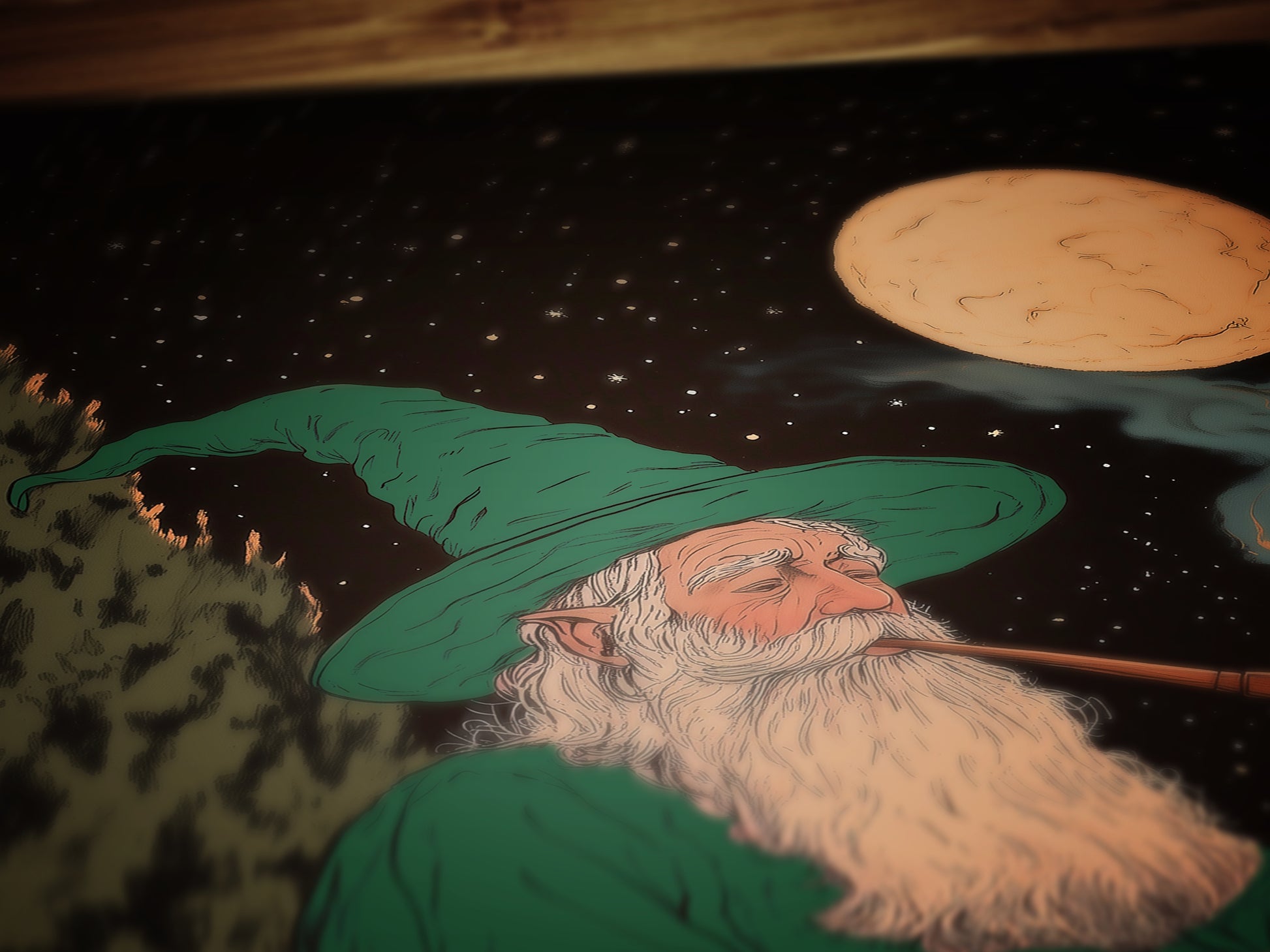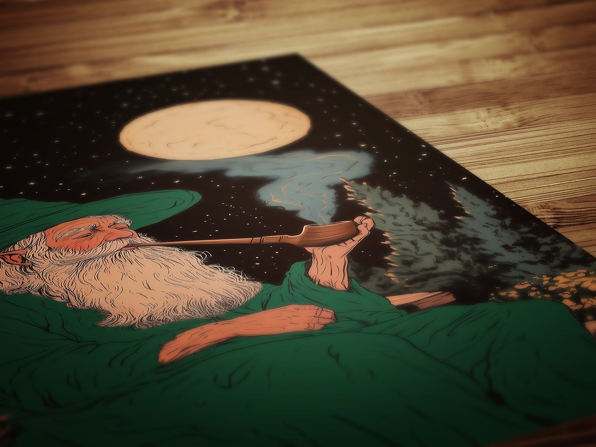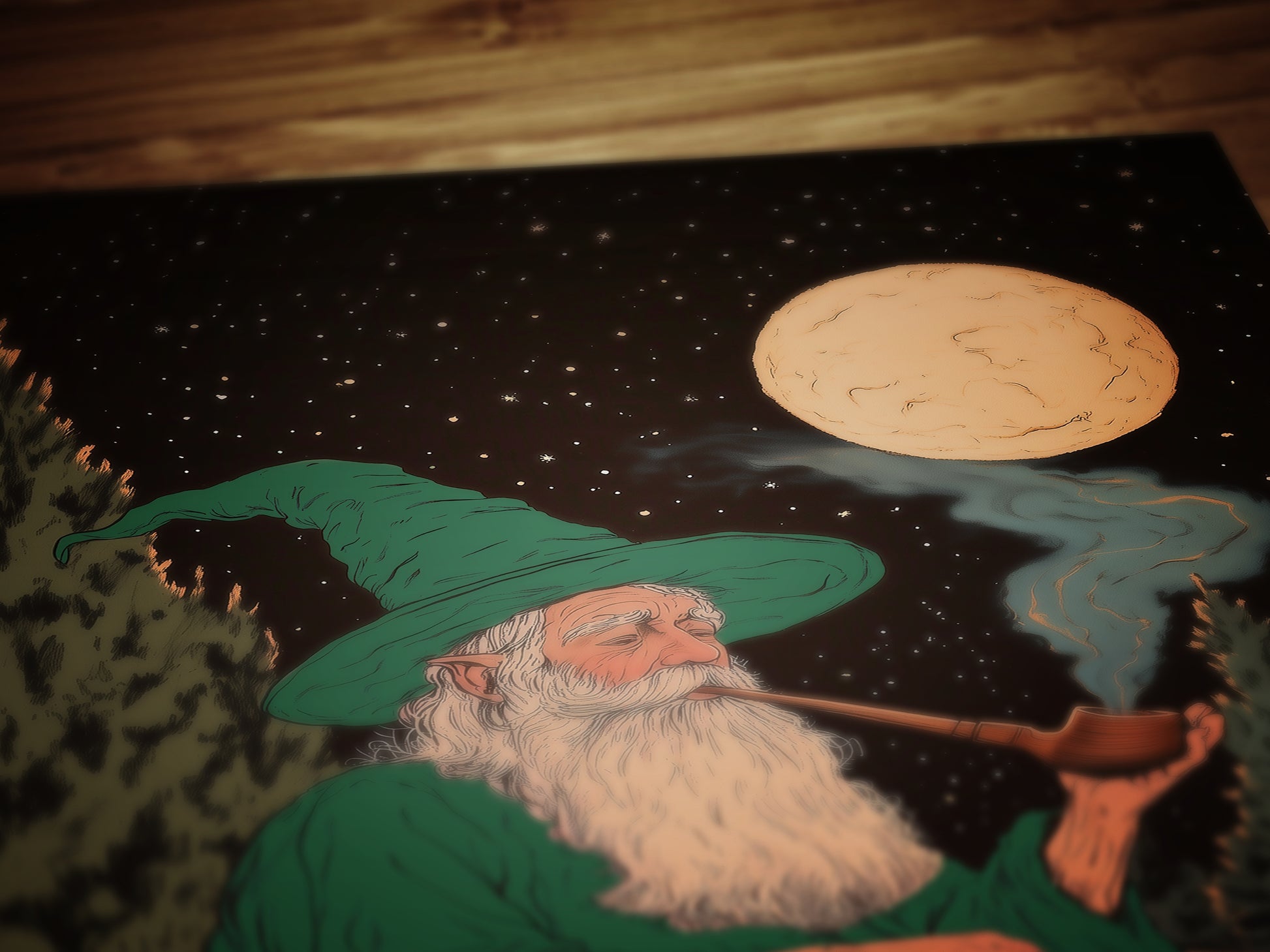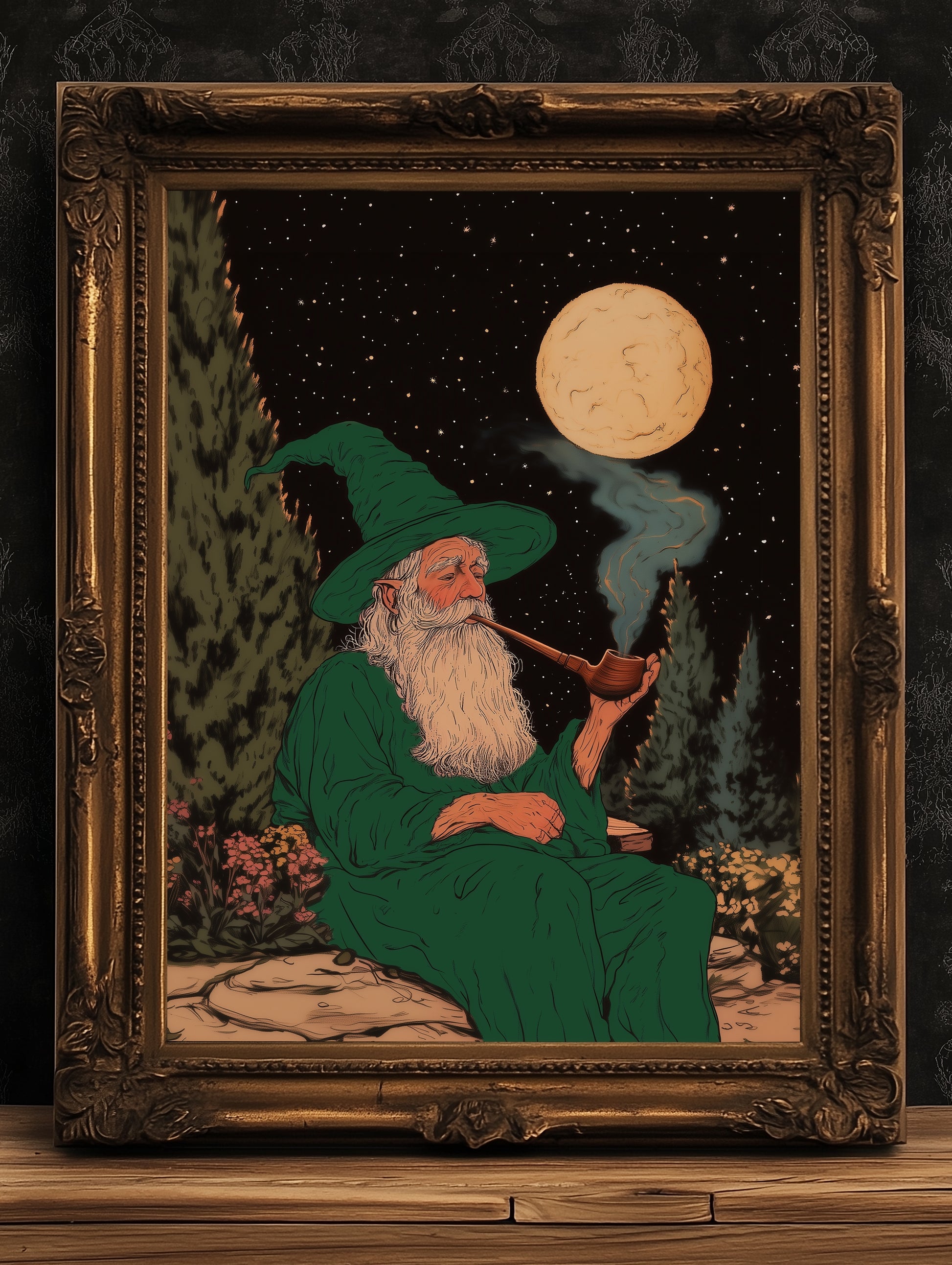 This charming fantasy art print captures a wise old wizard in a green cloak, sitting peacefully under a starry night sky, smoking a pipe beneath the full moon ππ§β¨ Blending cozy lord of the rings vibes with magical medieval wall art charm, this enchanting scene is perfect for lovers of castlecore prints, whimsigoth decor, and cozy fantasy worlds.