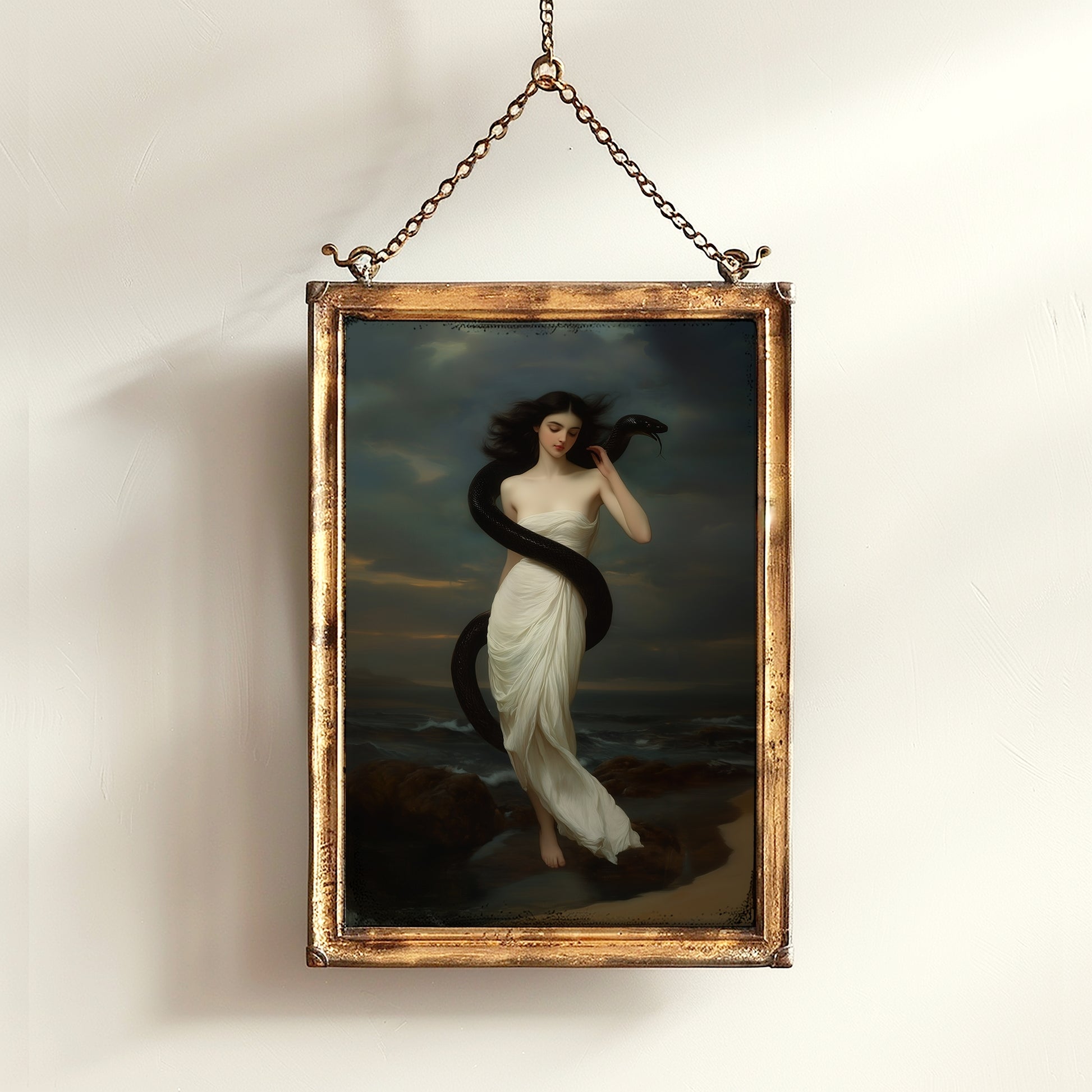 This moody and sensual poster features a mysterious goddess like figure standing barefoot on a dark shoreline, the womans body gently entwined with a black serpent. Dressed in flowing white against a stormy seascape, she evokes themes of power, temptation, and ancient feminine mystique. Set in a moonlit scene, this image hints at witchy romance and demonic allure—blurring the line between goddess and succubus. Blending classical oil painting style with dark fantasy, this piece is perfect for lovers of myth, magic, and romantic gothic aesthetics 🐍🌊🌕🕯️