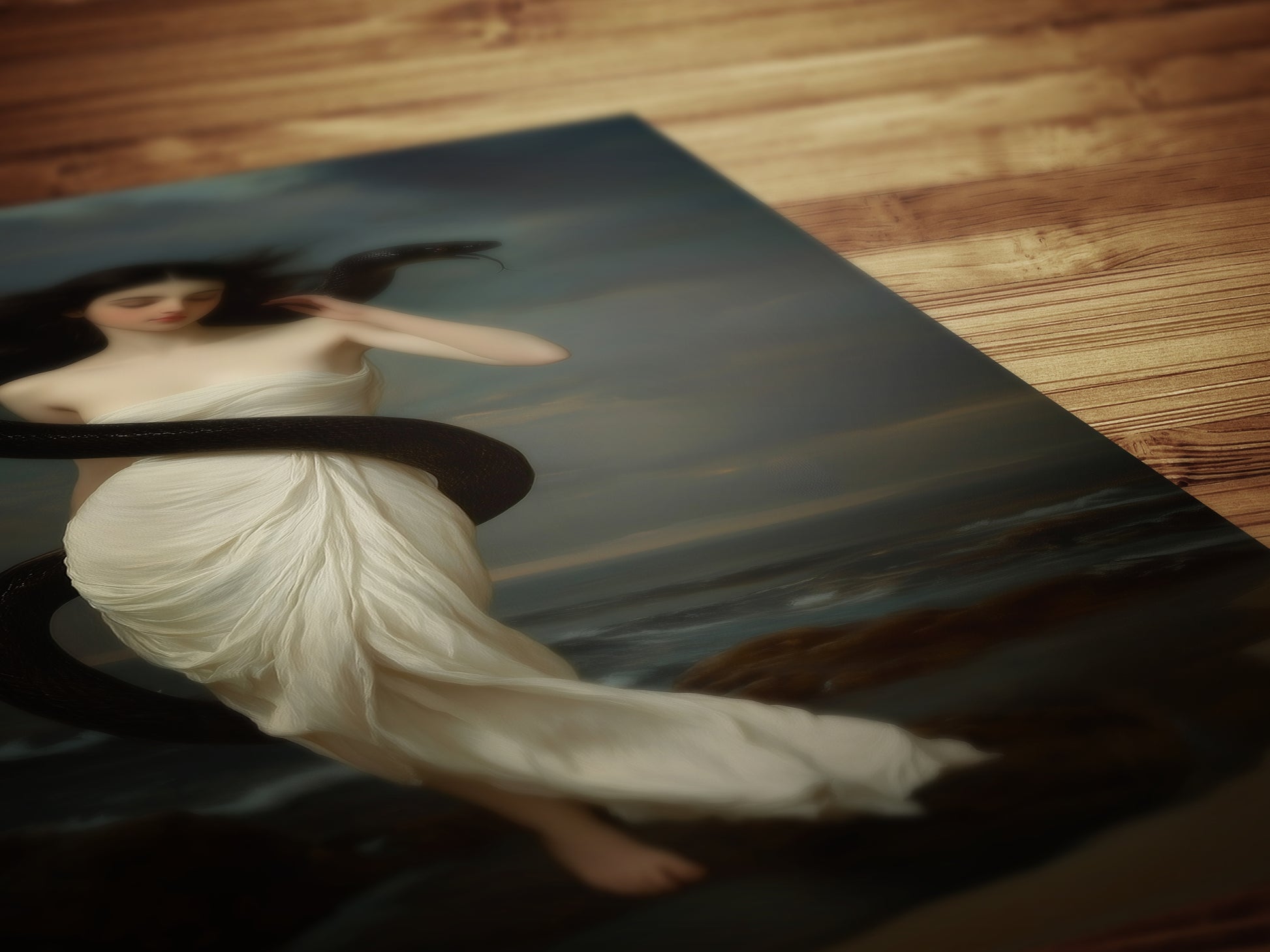 🌊 Enchanting sea goddess wrapped in a serpent under a twilight sky