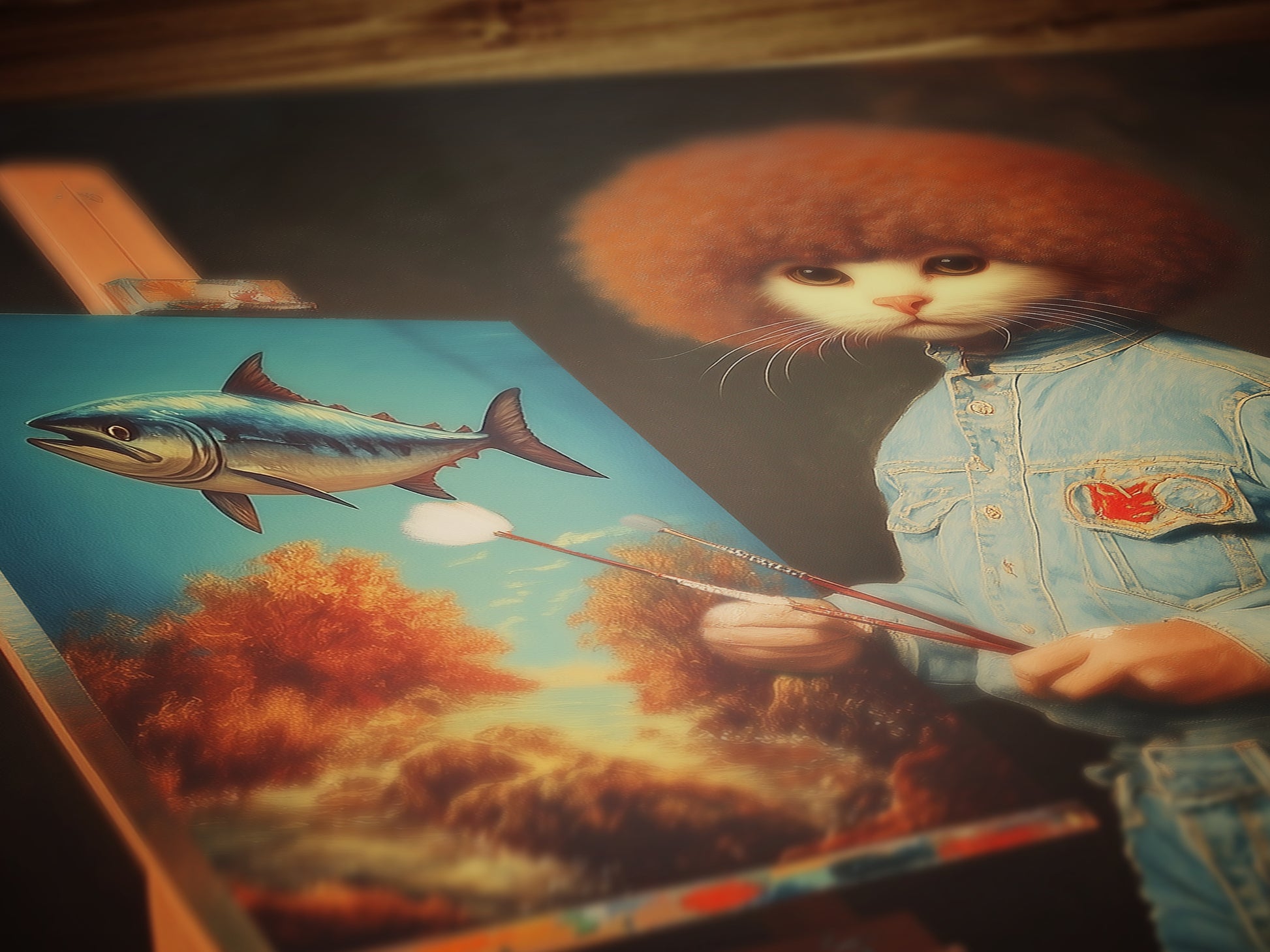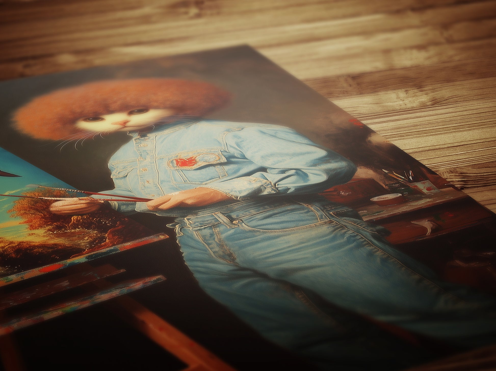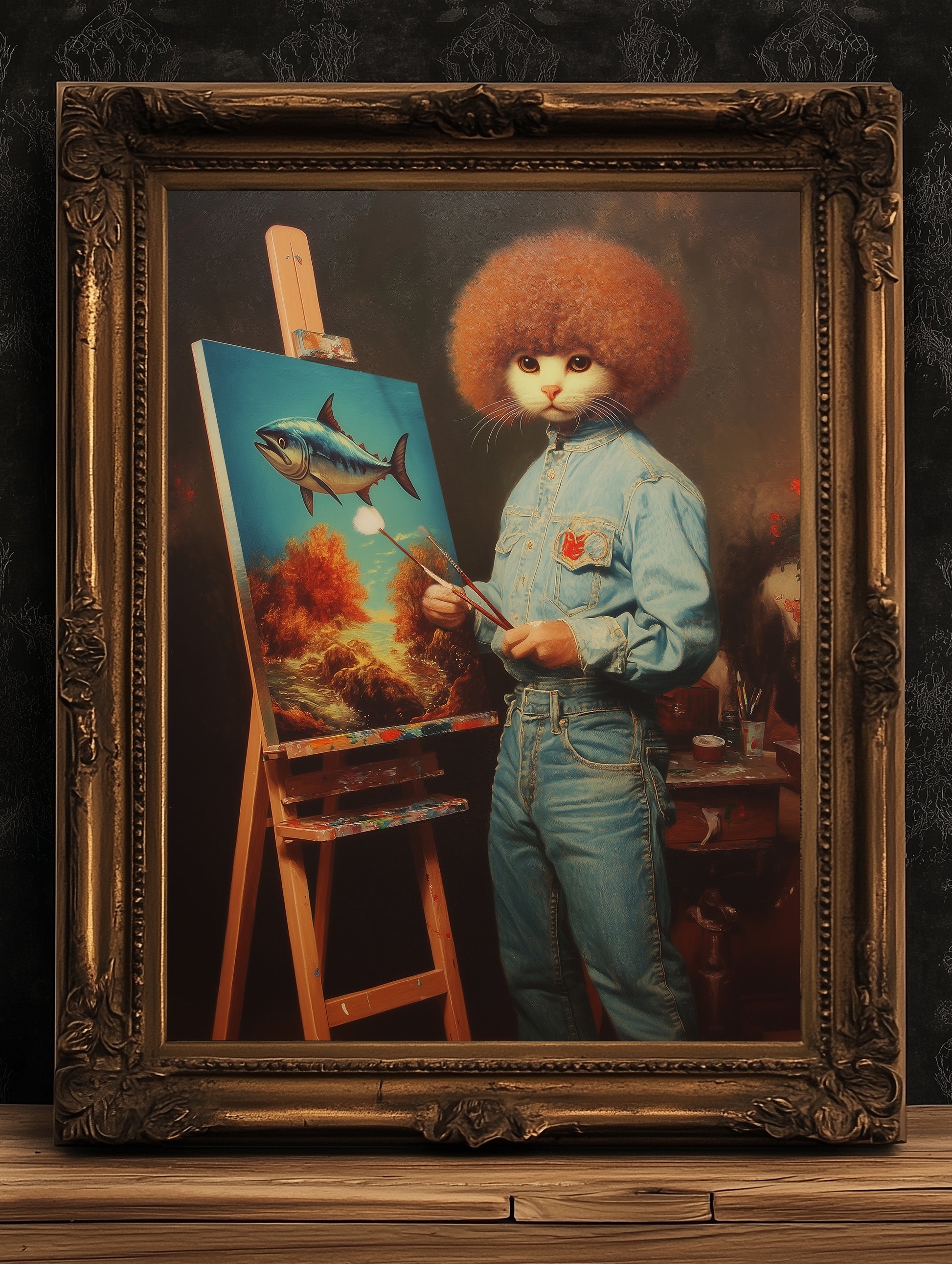 Charming art print photograph featuring an anthropomorphic cat dressed as Bob Ross, painting a happy little fish π¨π. This quirky and funny piece is perfect for cats lovers, weirdcore fans, or anyone who loves offbeat decor. It adds personality and humor to your home, office, or cubicle.